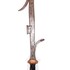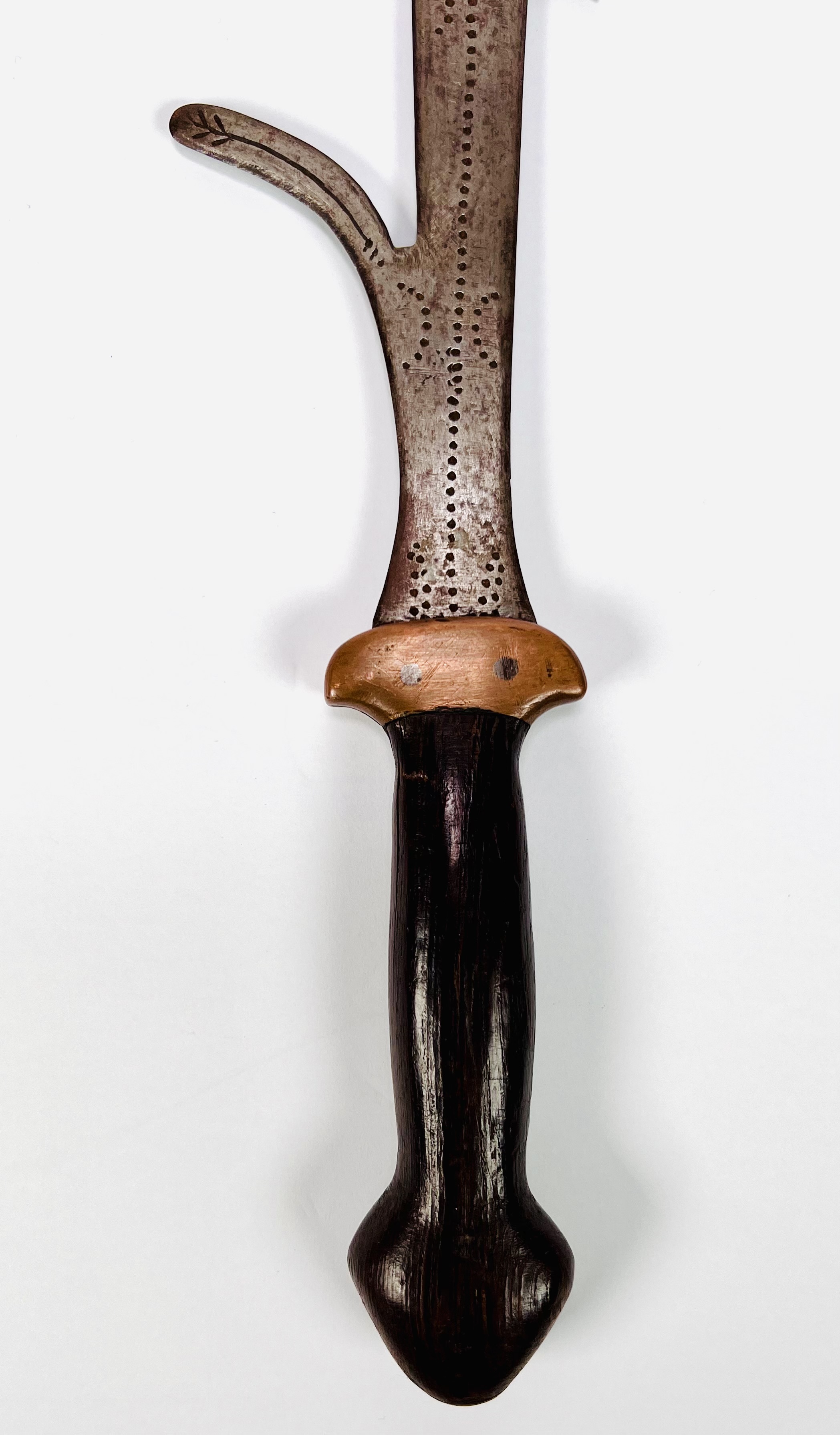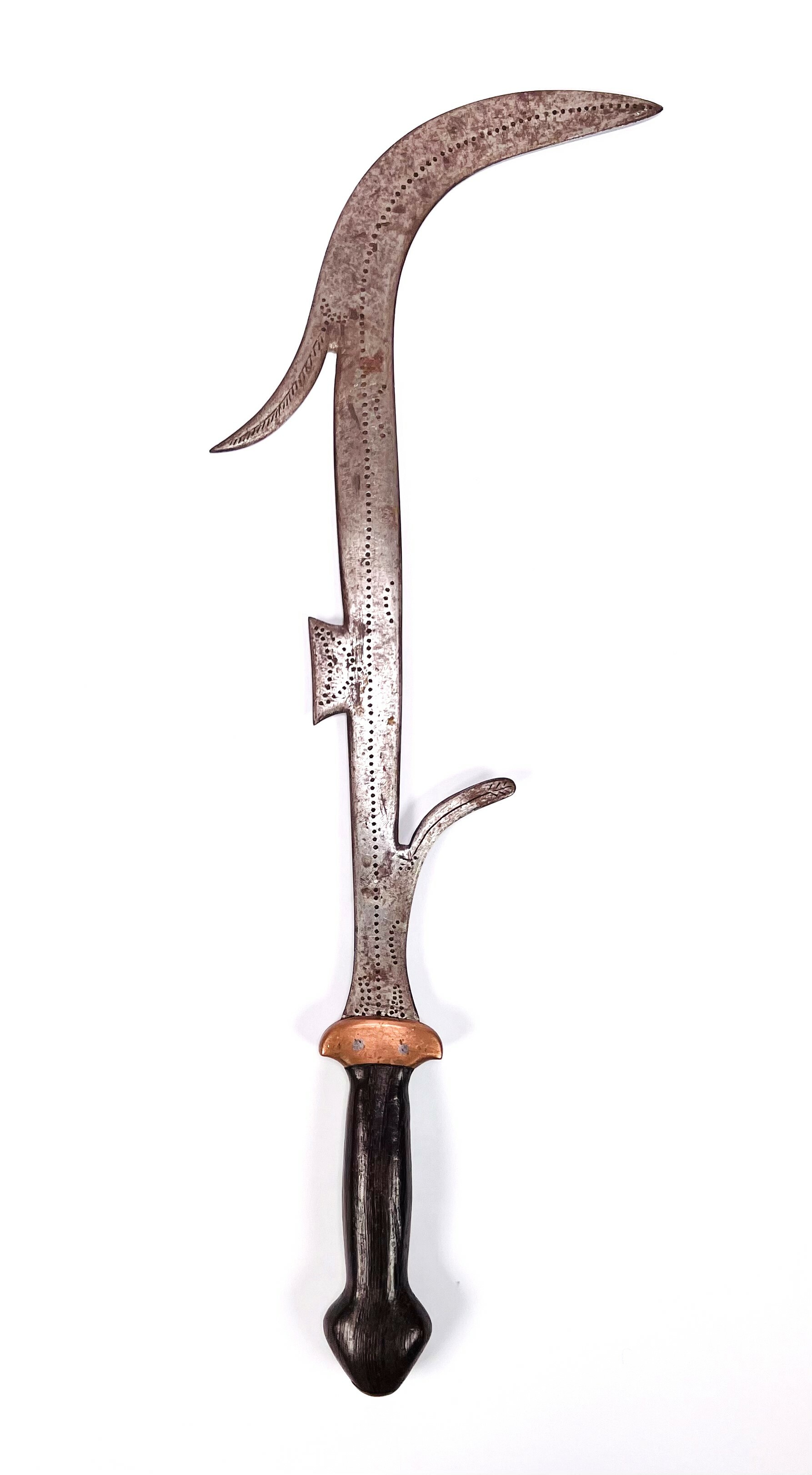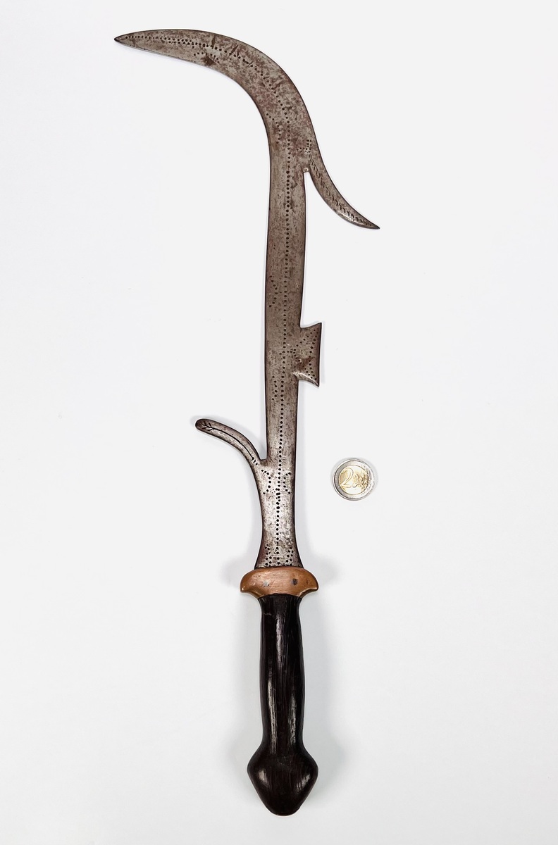 Tribaal sikkelmes van de Ngombé/Doko en Ngbandi stam opgebouwd uit ijzer, hout en koper. Functie ruilmiddel. Congo, begin 20e eeuw. |