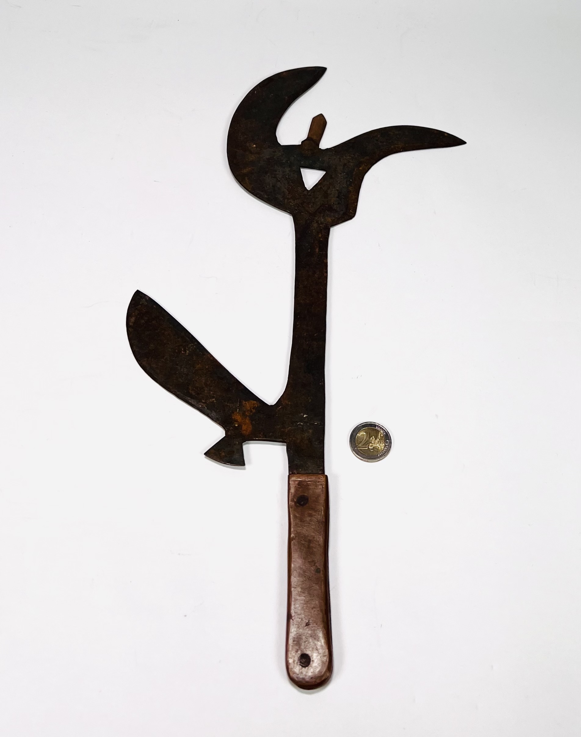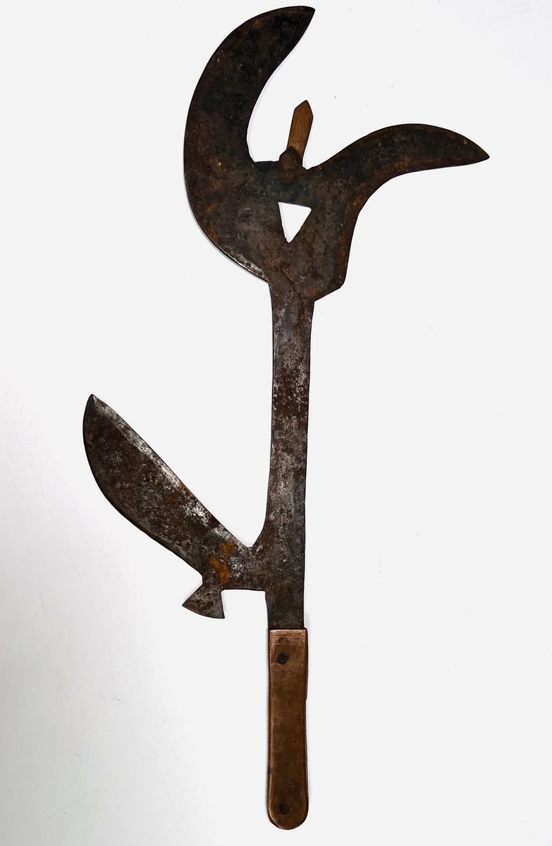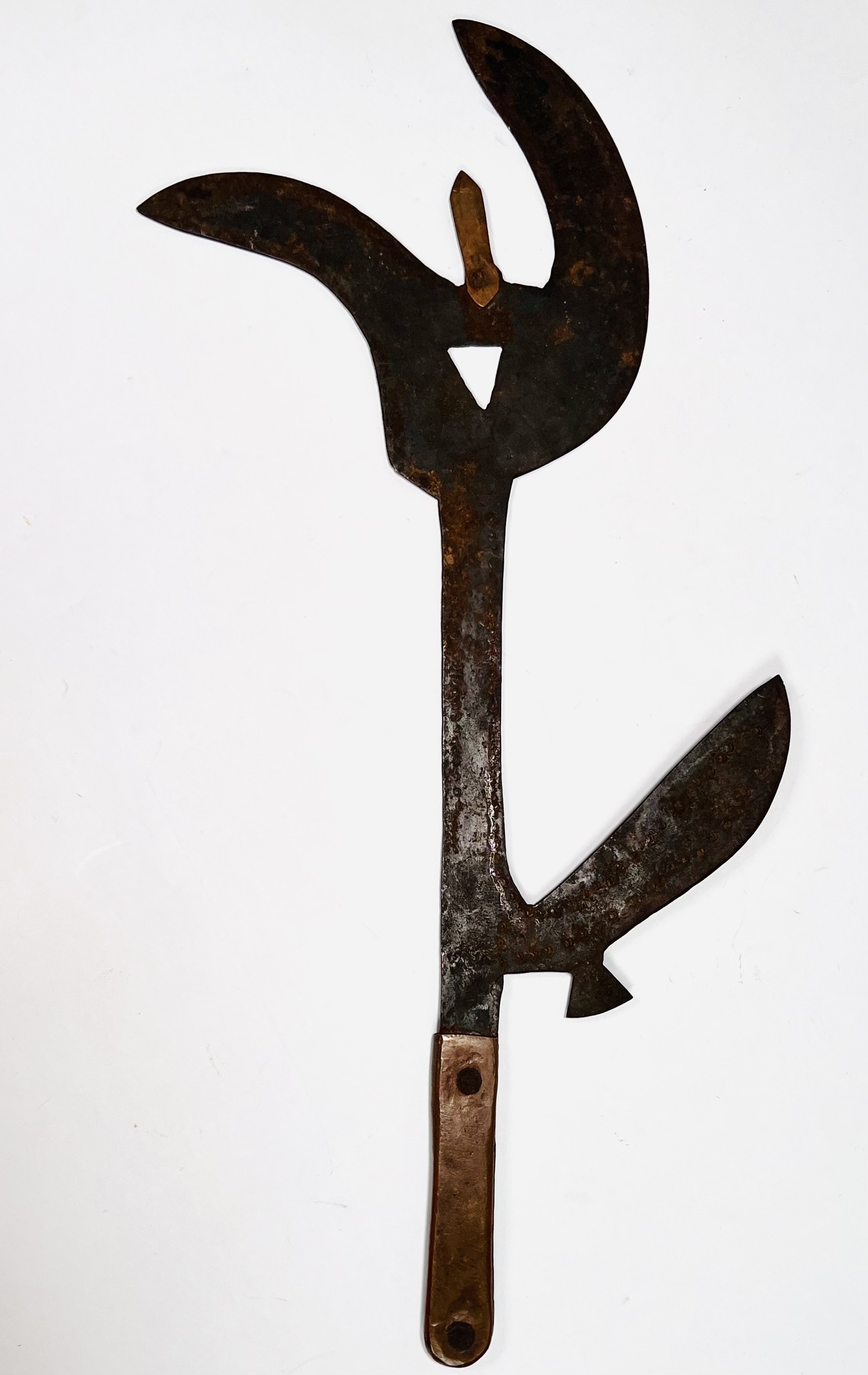 Tribaal sikkelmes van de Ngombé/Doko en Ngbandi stam opgebouwd uit ijzer en hout, functie ruilmiddel. Congo, begin 20e eeuw. |