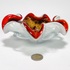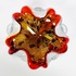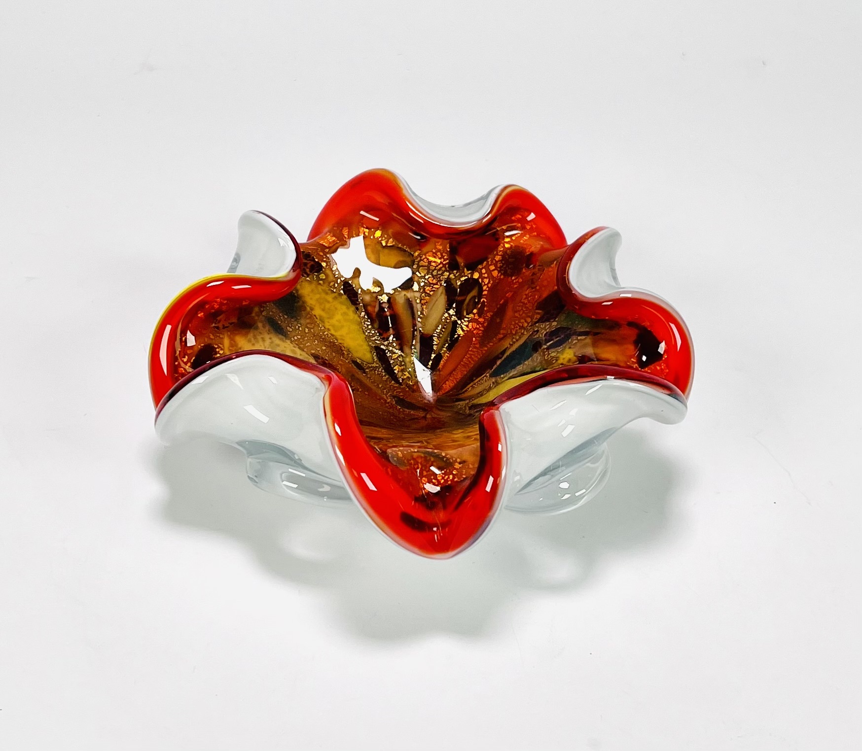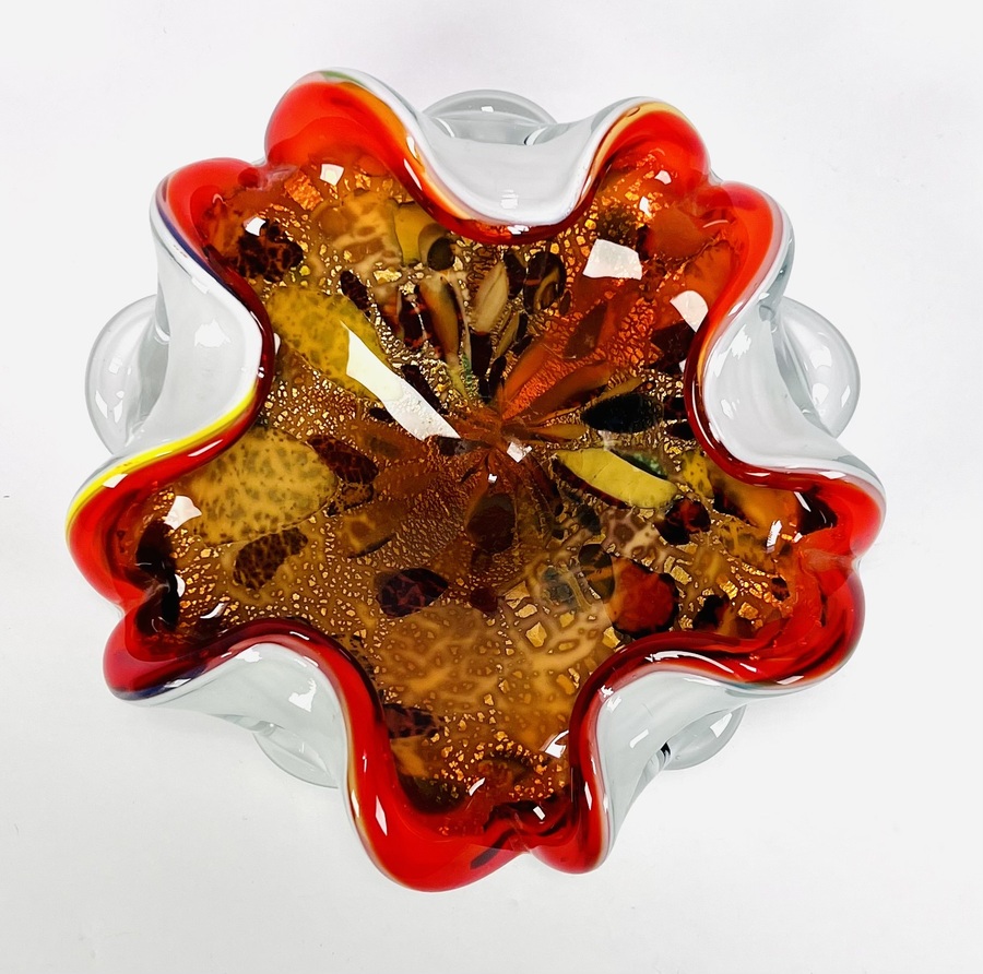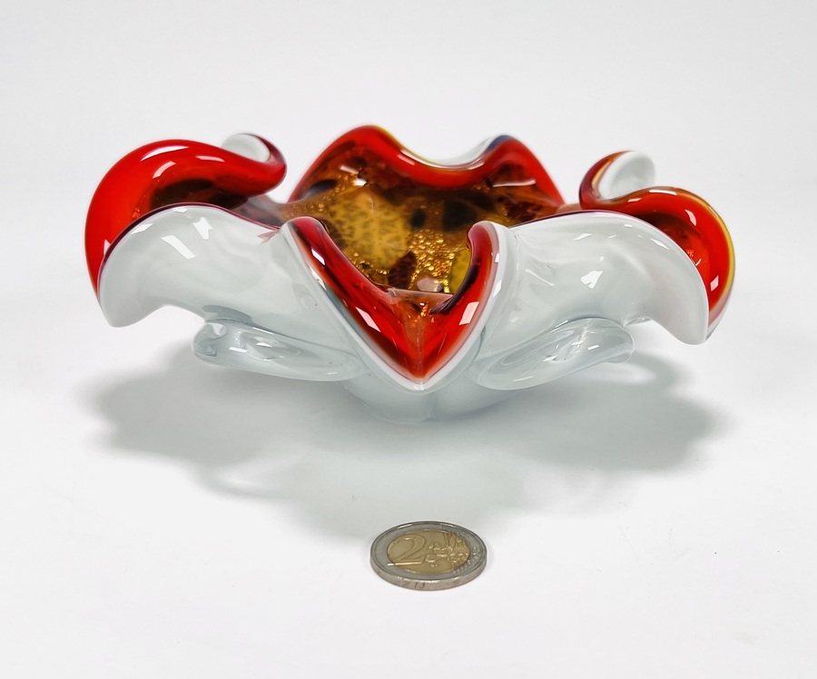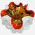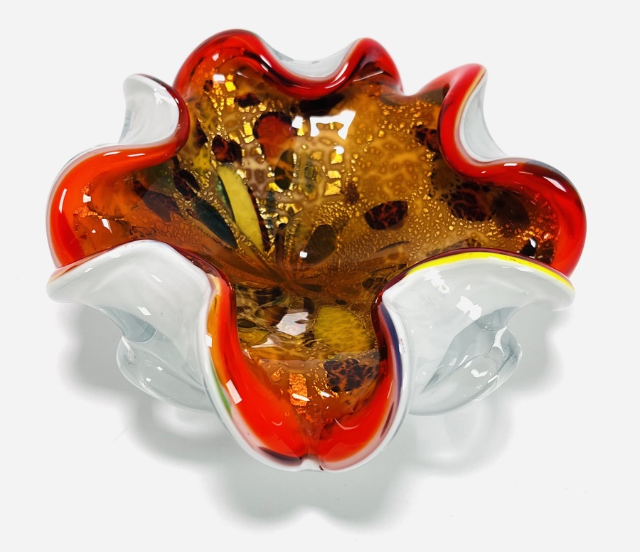 Glazen oranjerode Murano schaal met gelobde rand, uit meerde lagen opgebouwd met bladgoud verwerking. Italië, jaren 60. |