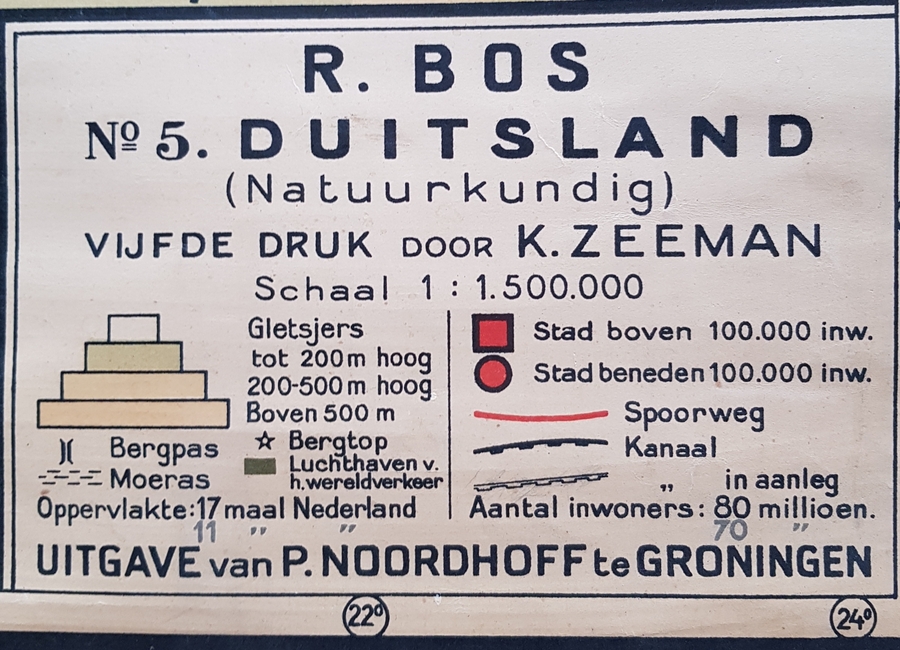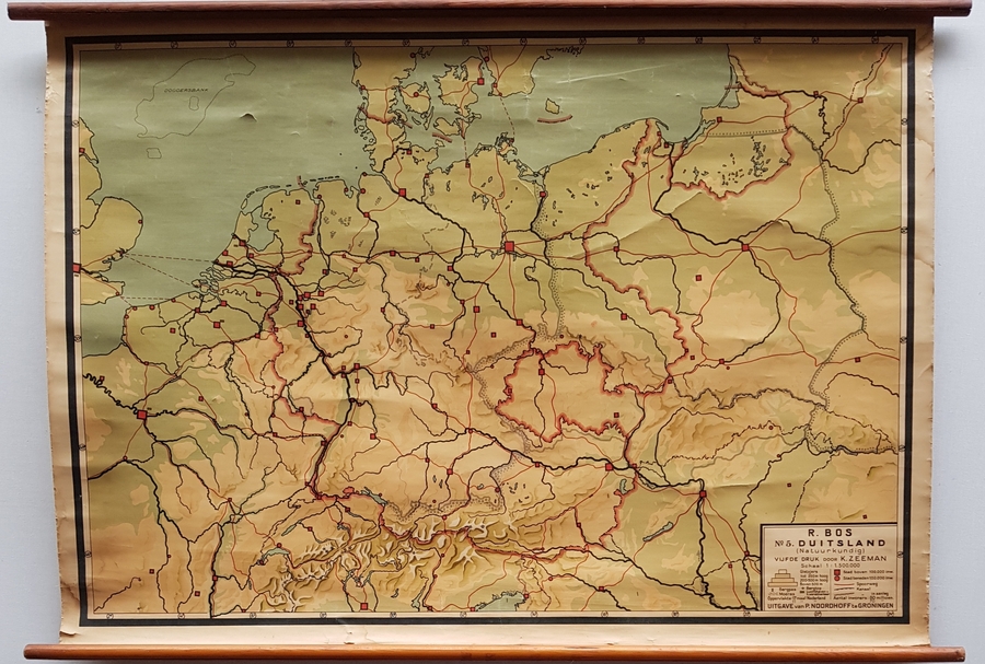 Schoolkaart Duitsland, vijfde druk door K. Zeeman en uitgave van P. Noordhoff te Groningen. Tweede helft 20 eeuw. |