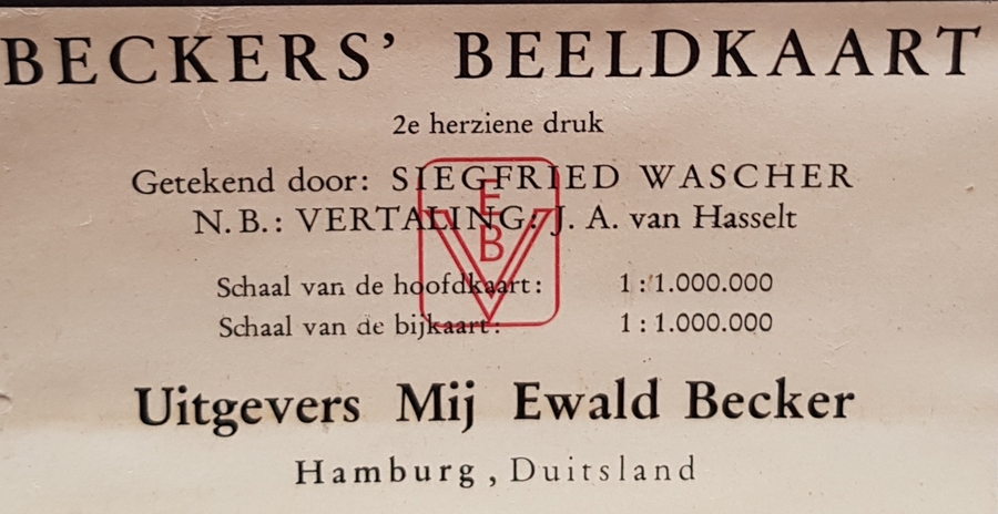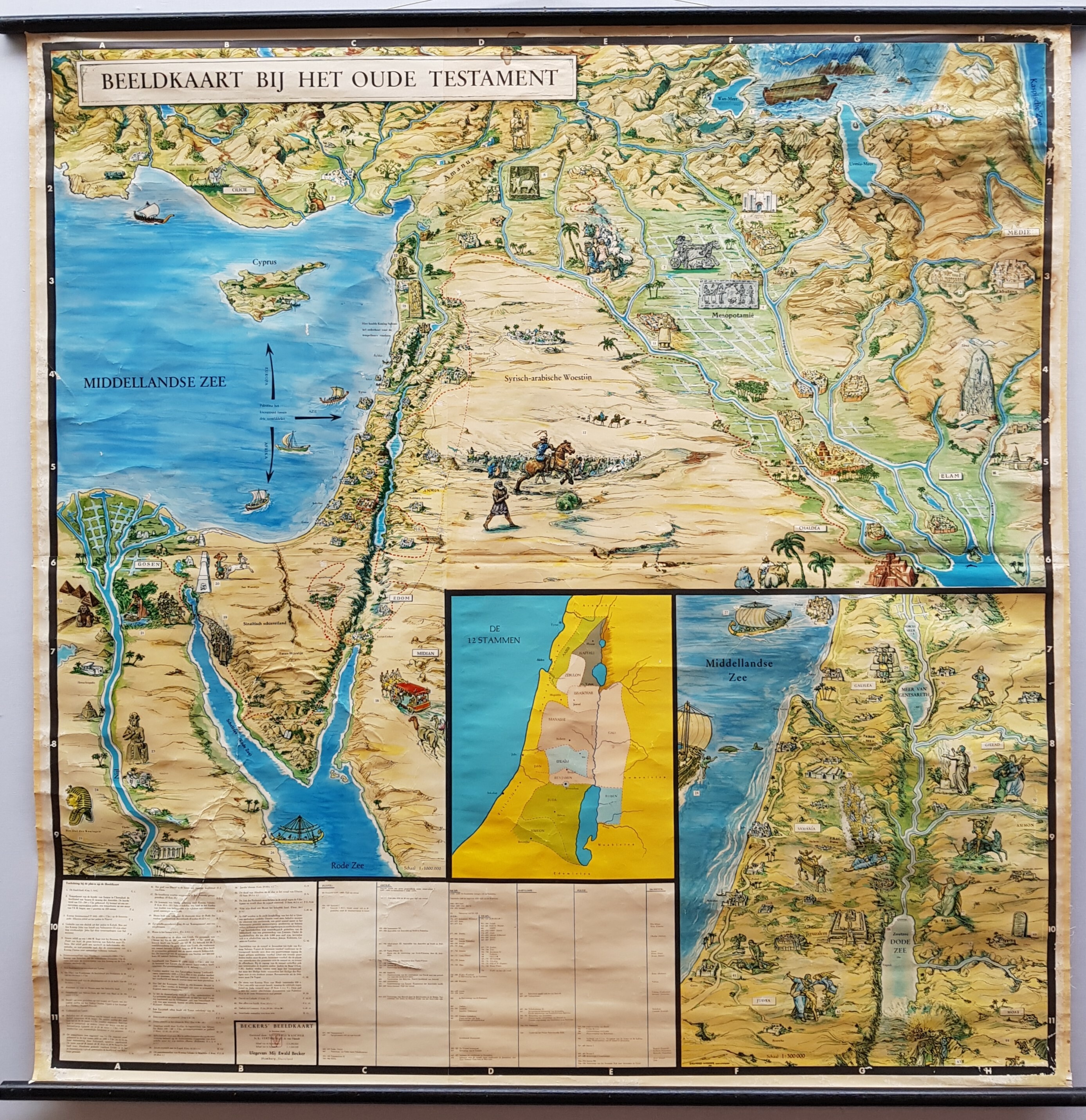 Schoolkaart op groot formaat met de titel “Beeldkaart bij het oude Testament”. Papier op linnen, Uitgeverij Beckers. |