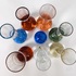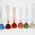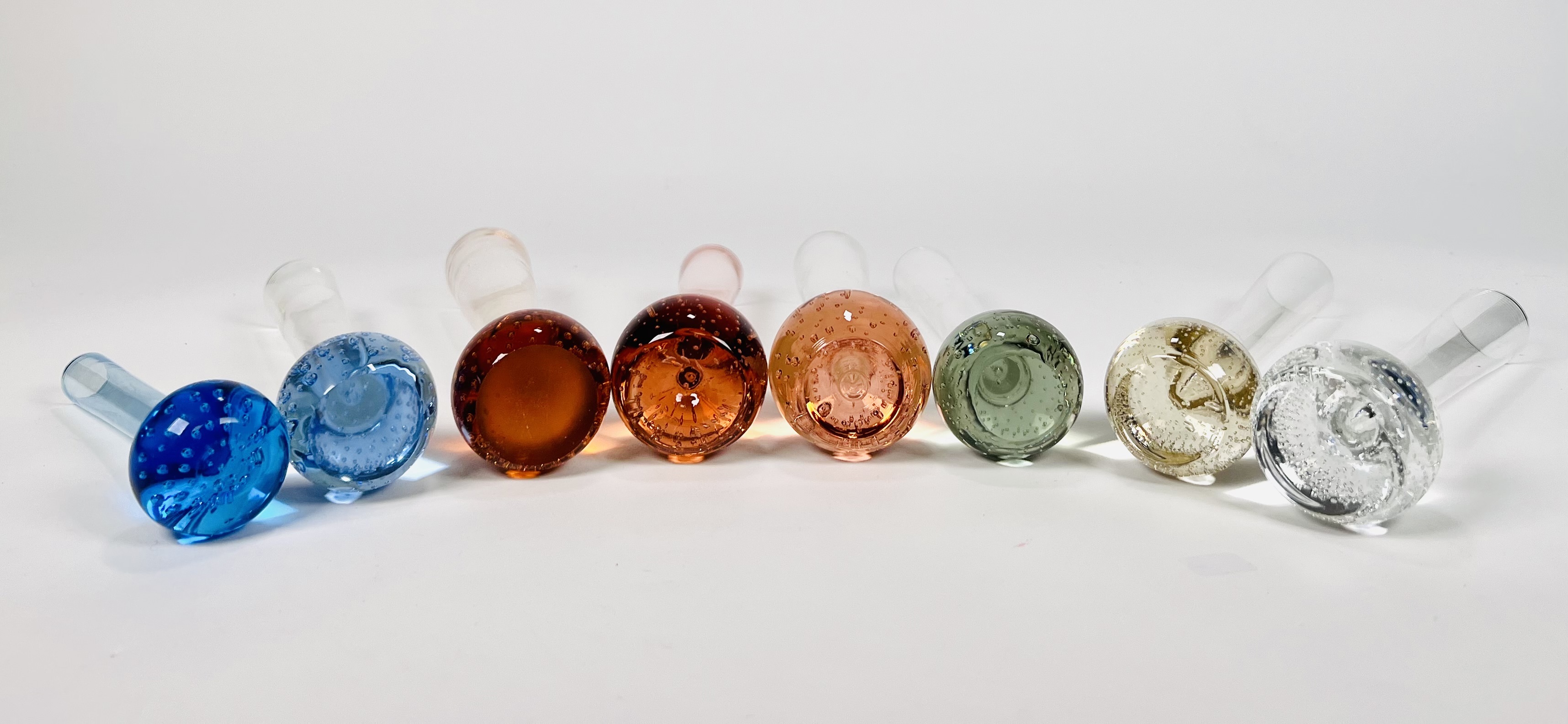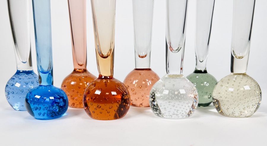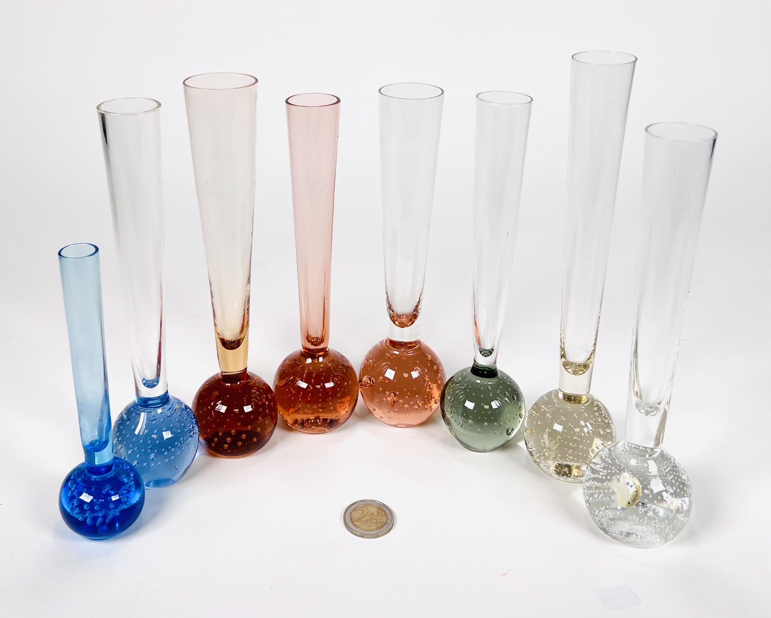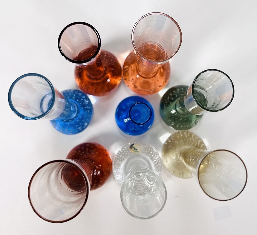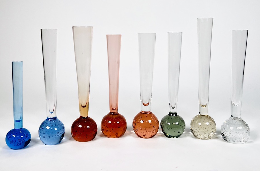 Acht Boheemse solifleur vaasjes in verschillende kleuren met spijkerbol basis. Heldere vaas sticker aanwezig Bohemia Harrachov. Tsjechoslovakije jaren 70/80. |