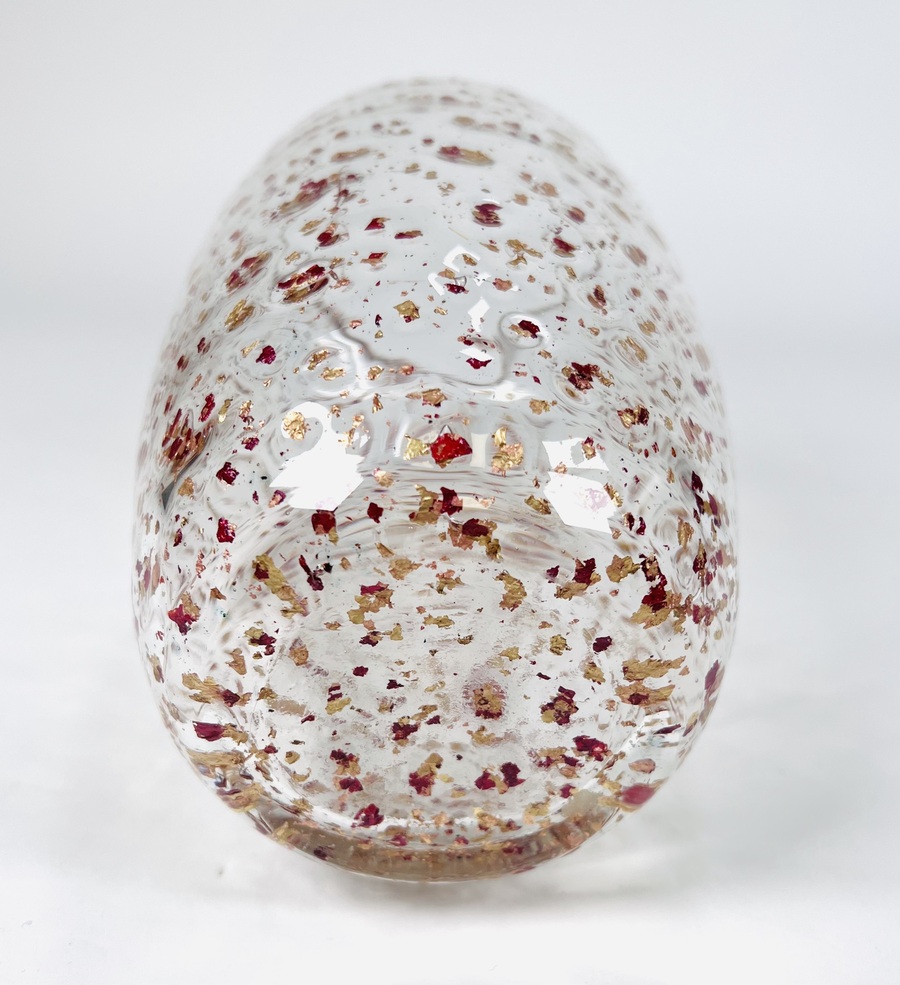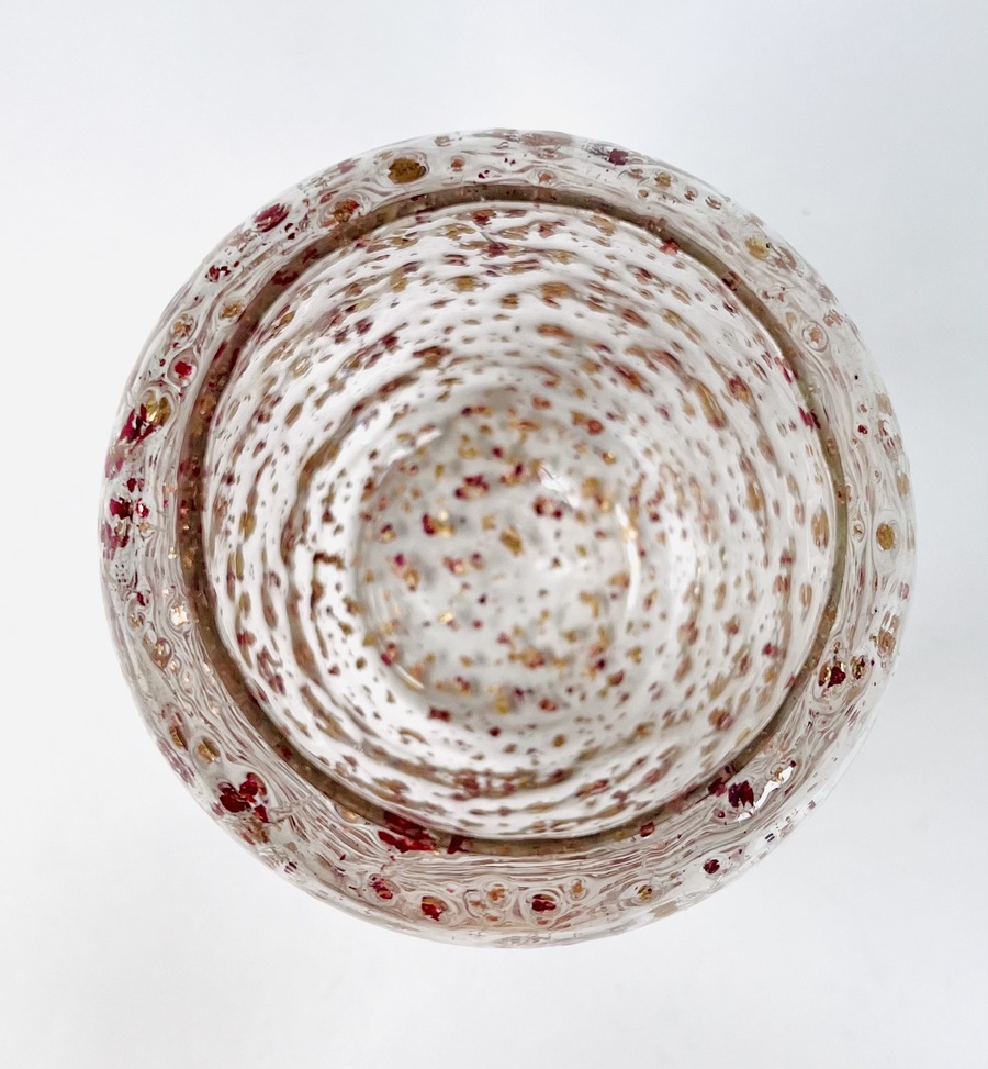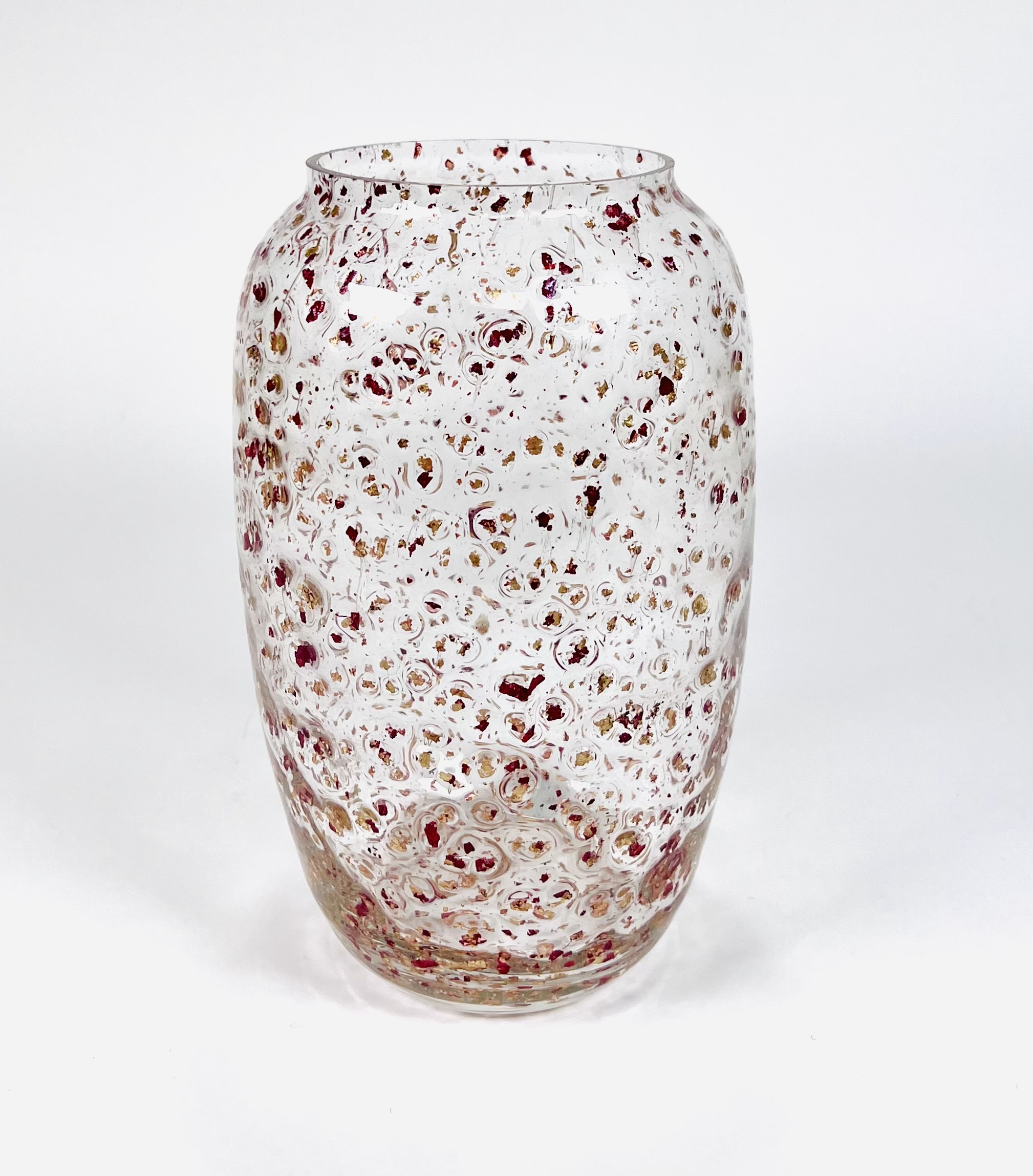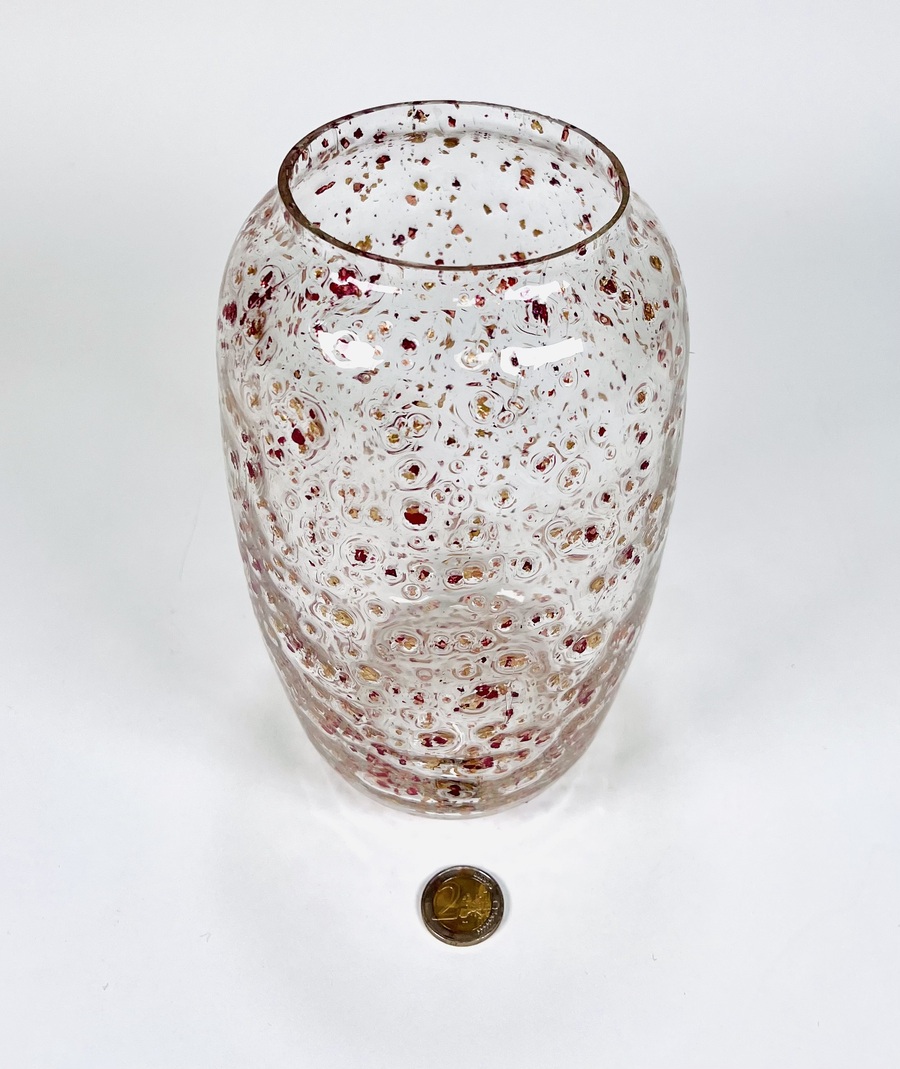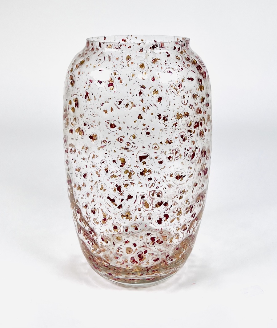 Helderglazen vaas met goudkleurige- en rode insluitsels. 21e eeuw. |