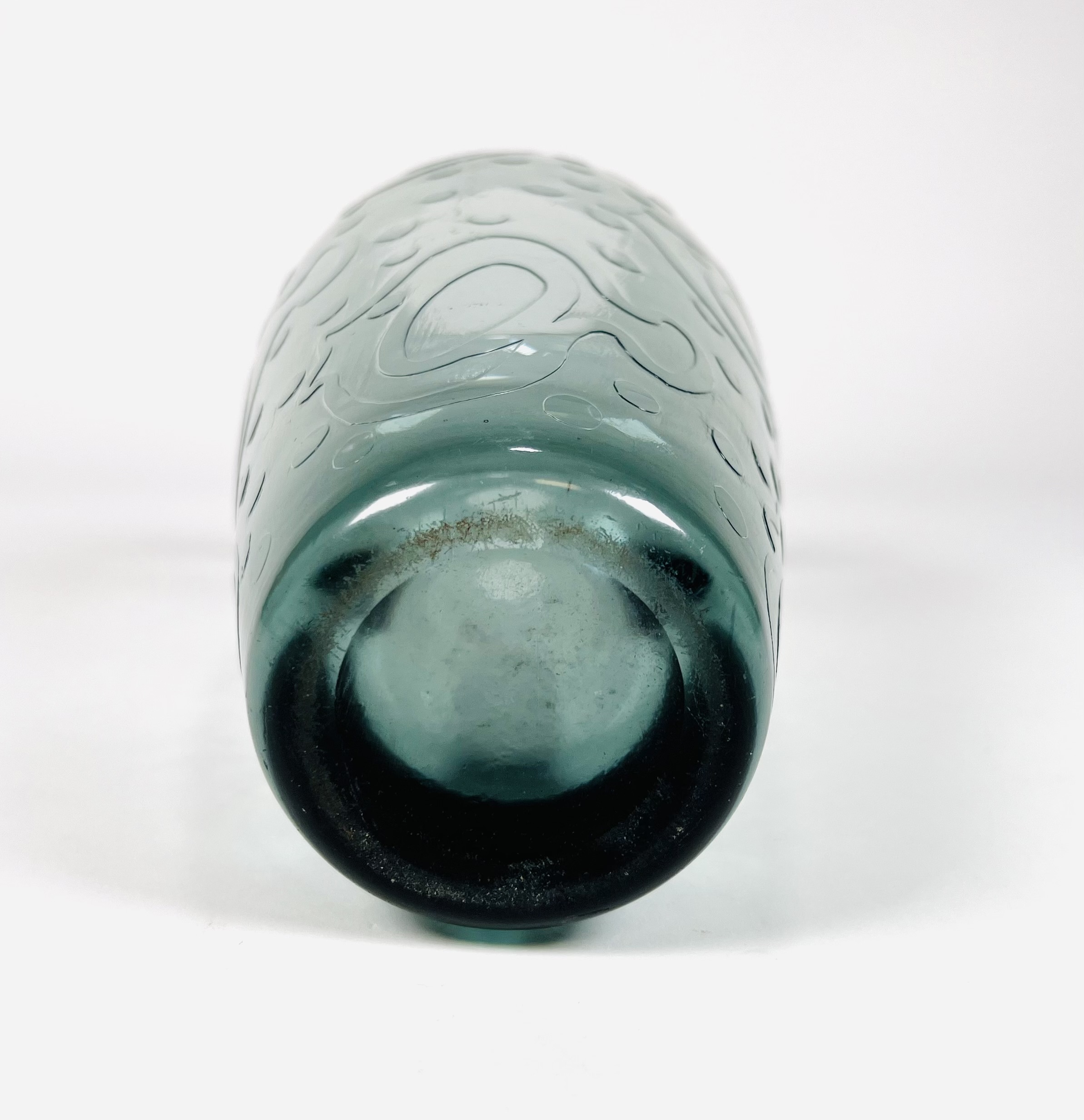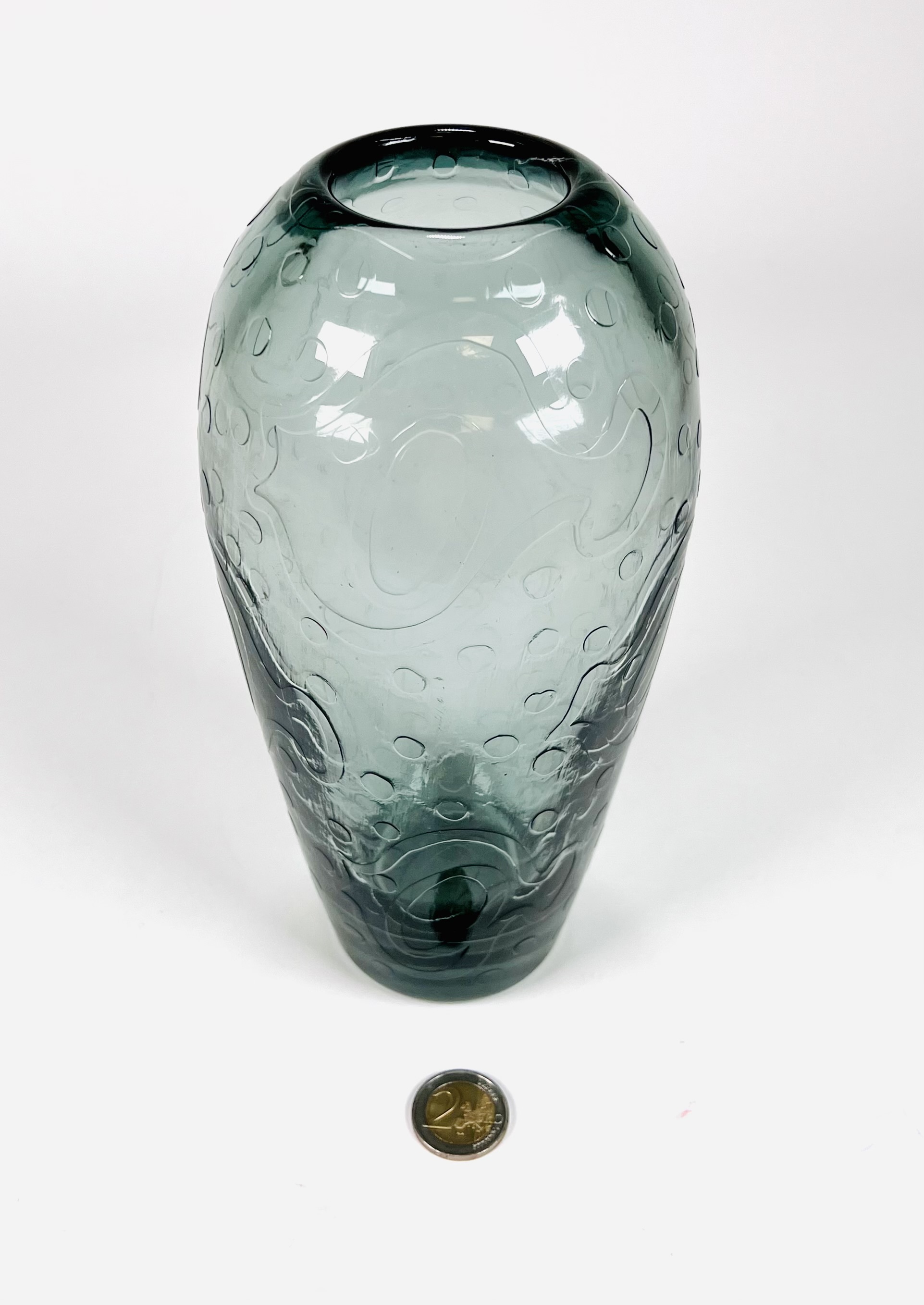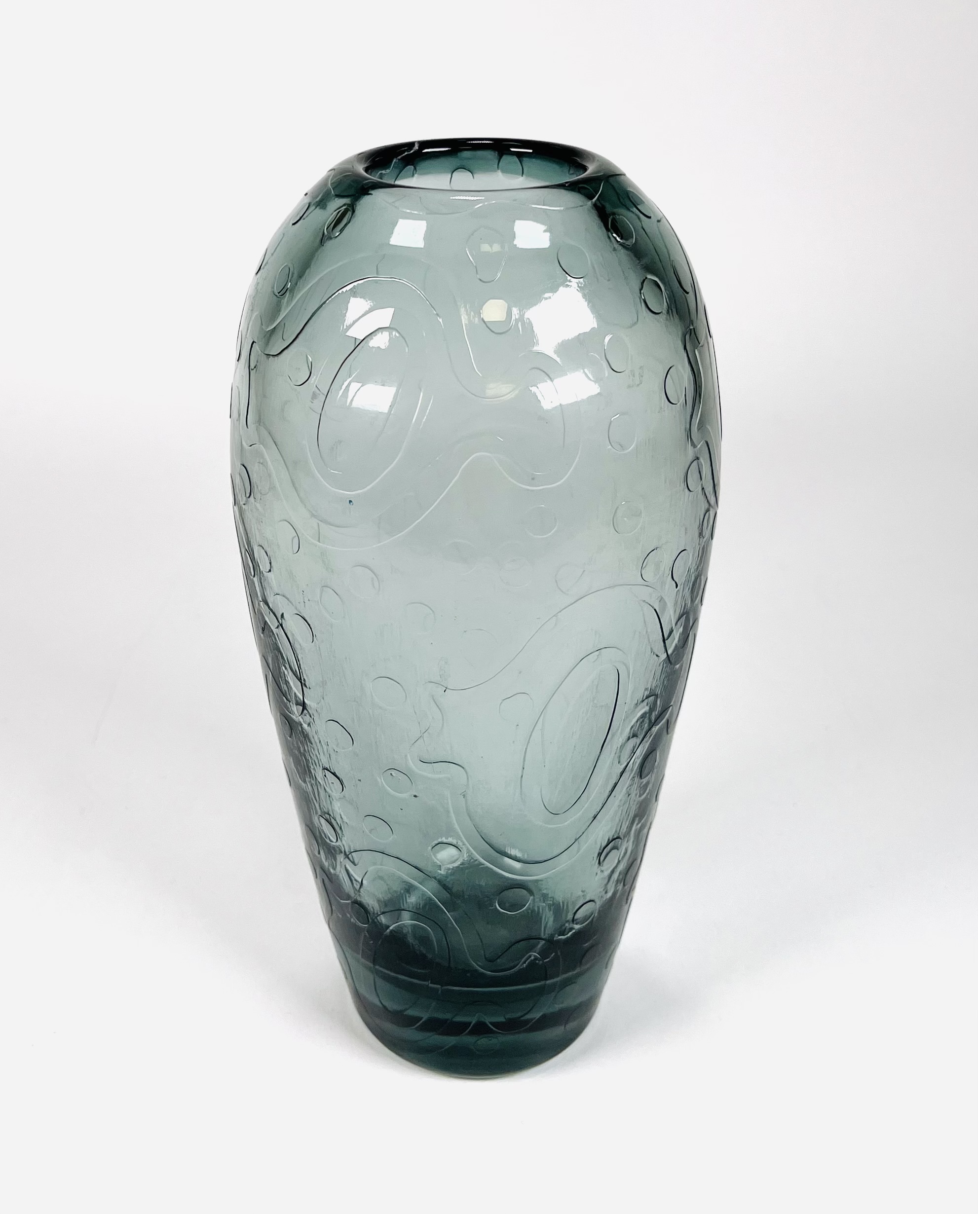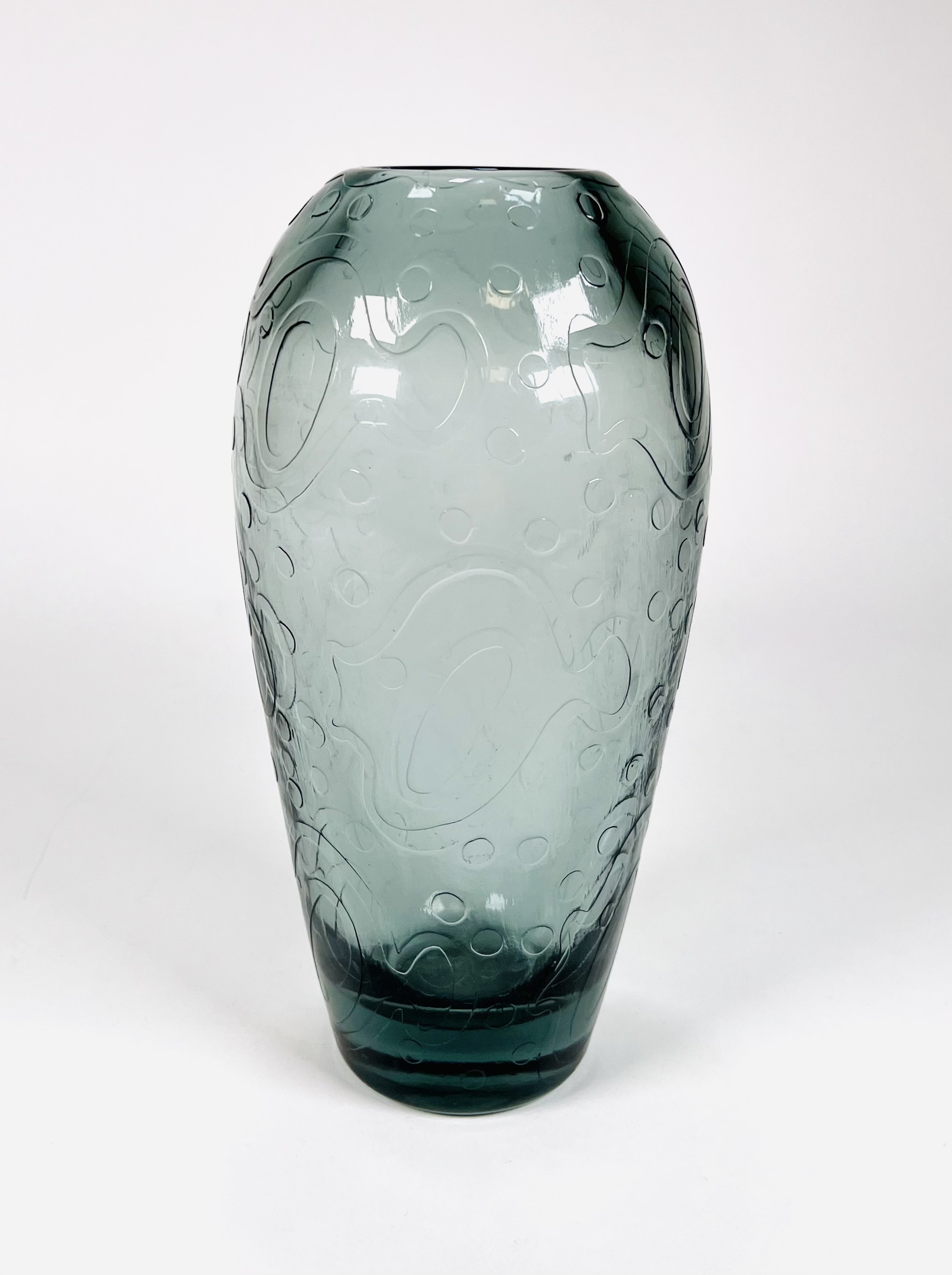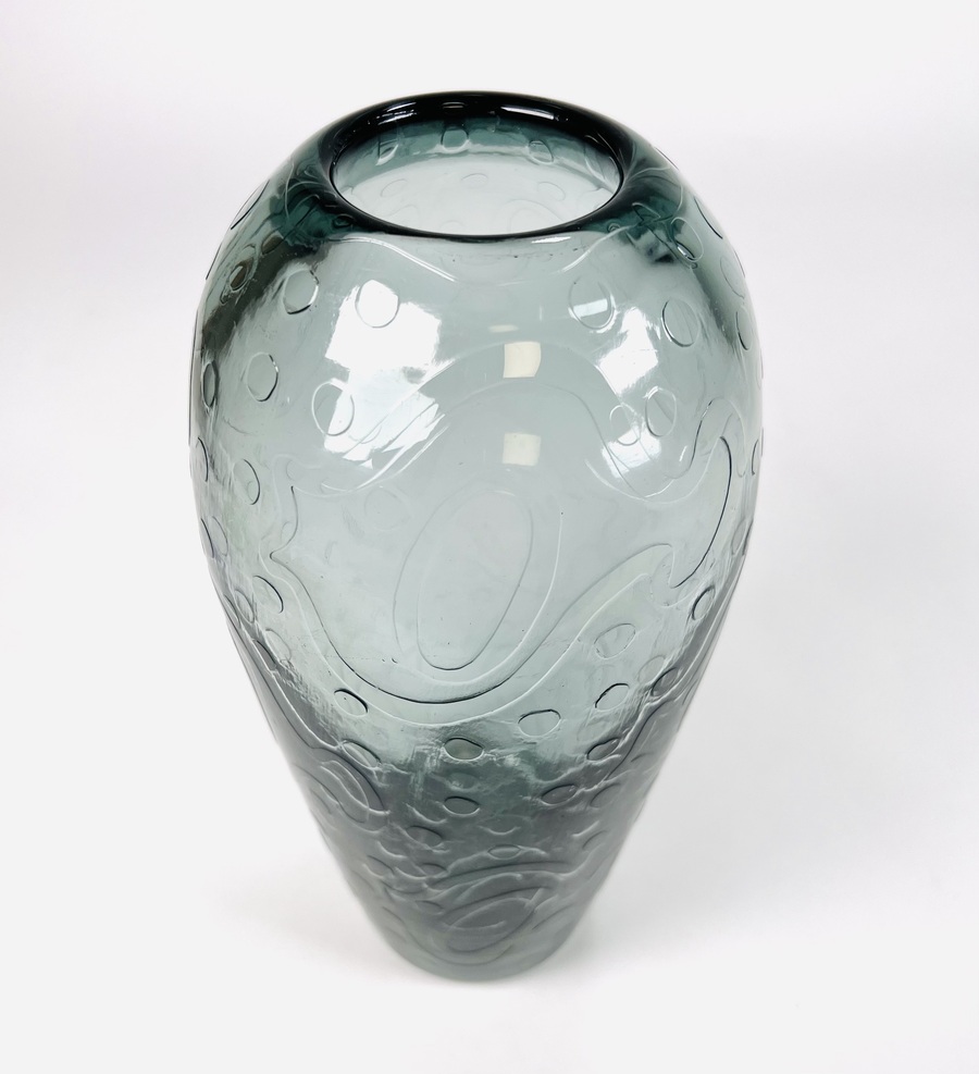 Grijsblauwe glazen vaas gedecoreerd met vissen en luchtbellen door Andries Dirk Copier en uitgevoerd door glasfabriek Leerdam. Ontwerp omstreeks 1956. |