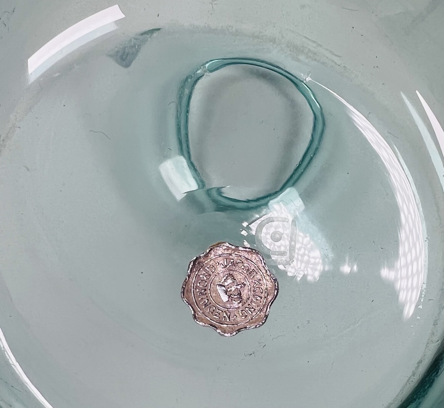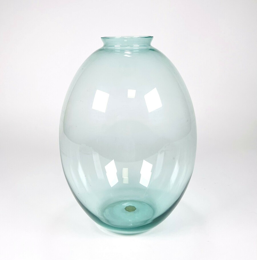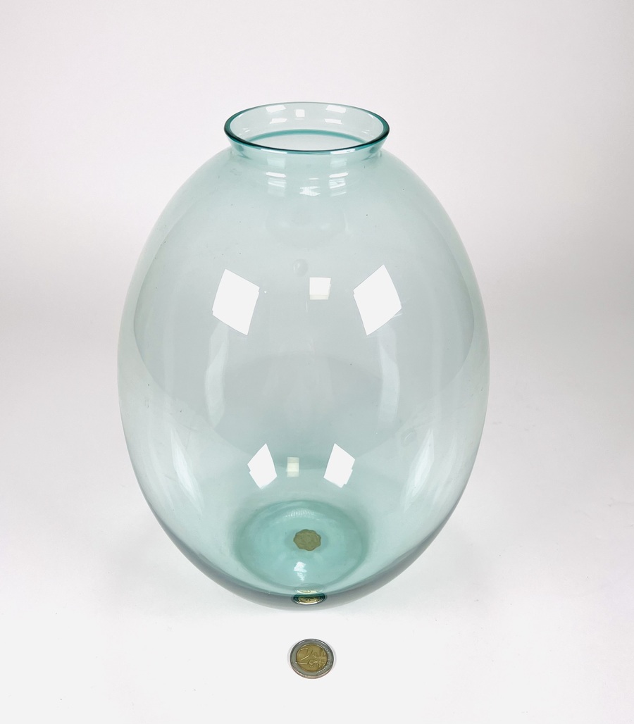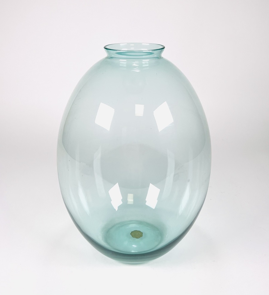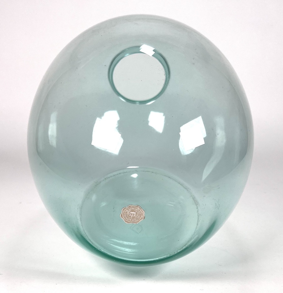Glazen meerblauw vaas door Andries Dirk Copier en vervaardigd door Glasfabriek Leerdam. Aan de onderzijde voorzien van geëtst CL. Tweede helft 20e eeuw. |
