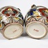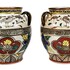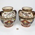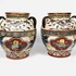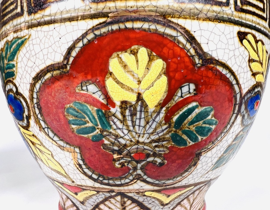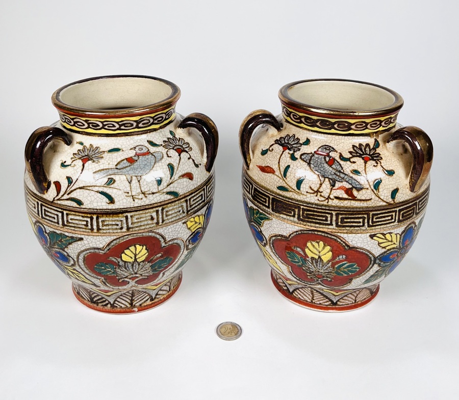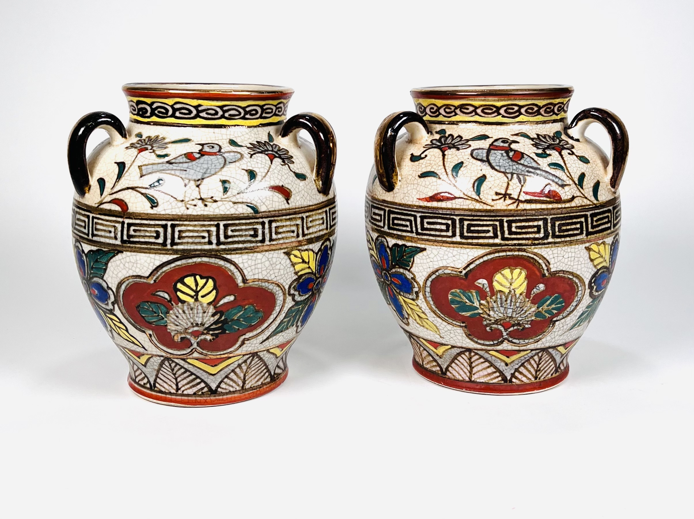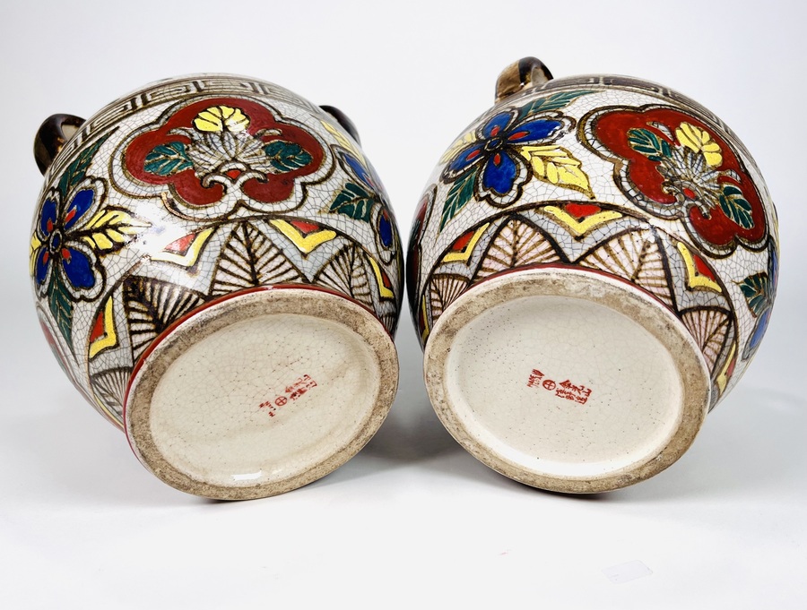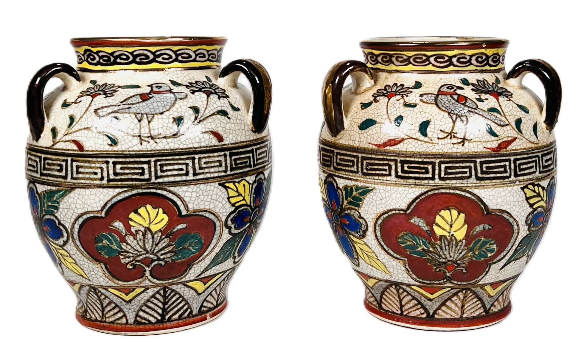 Twee Japanse keramieken Kyoto vazen met craquelé glazuur en handbeschilderde florale motieven en vogels, vazen voorzien van drie handvatten met goud glazuur. Aan de onderzijde gemerkt met zes karakters en made in Japan. Tweede kwart 20e eeuw. |