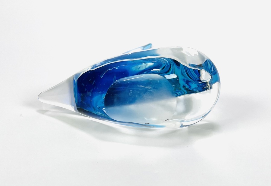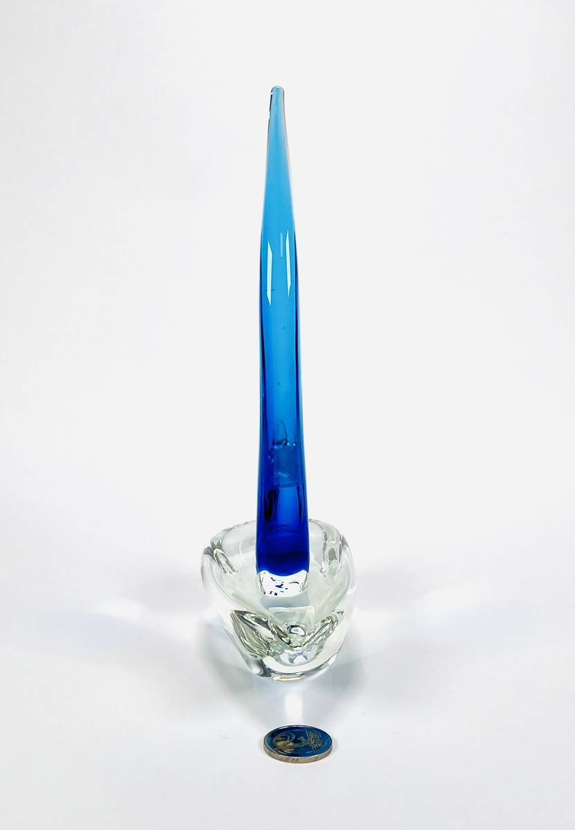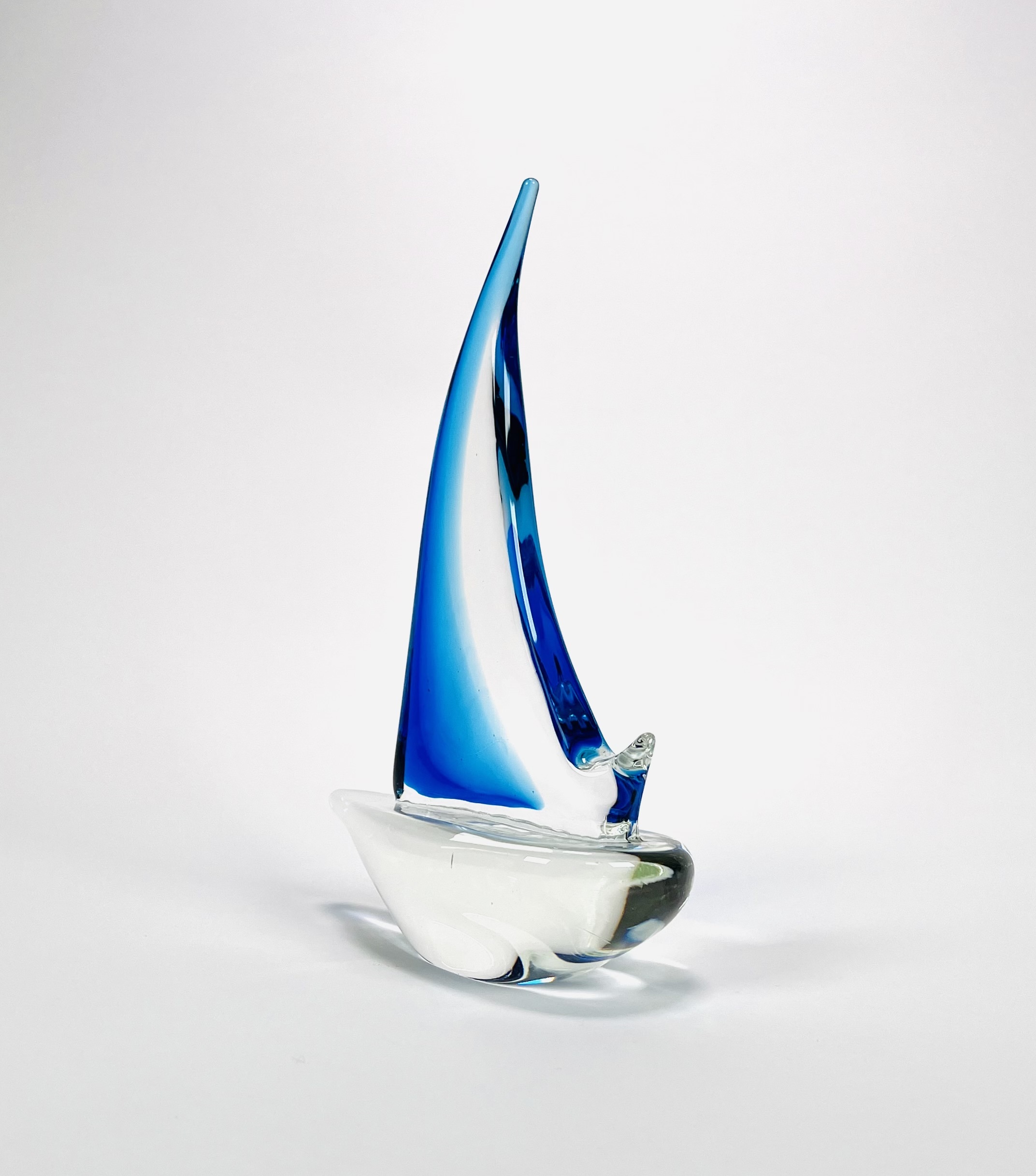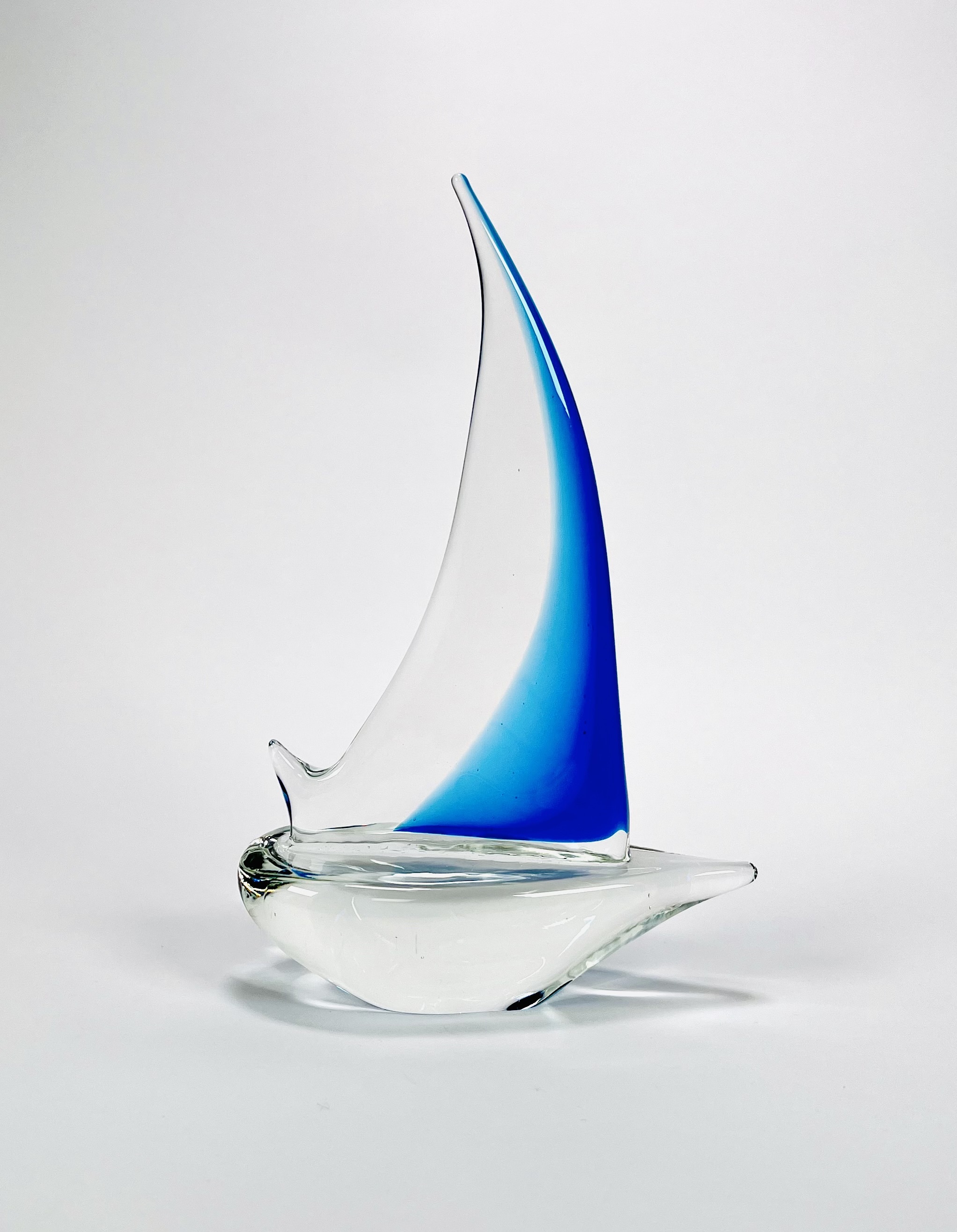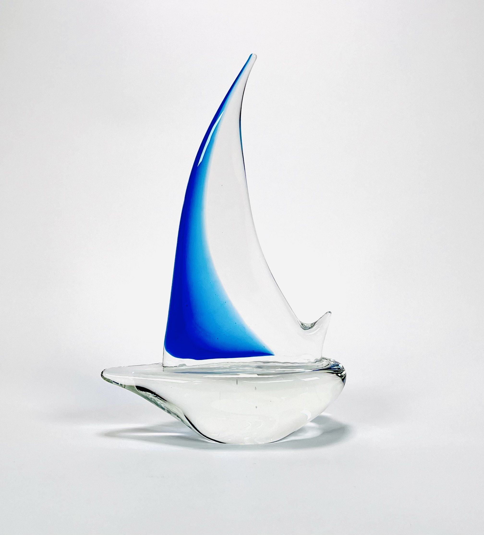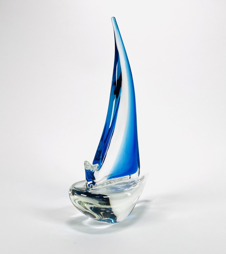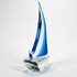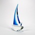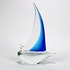 Helderglazen Murano stijl glazen zeilboot met helderblauw kleurige fok, 21e eeuw. |