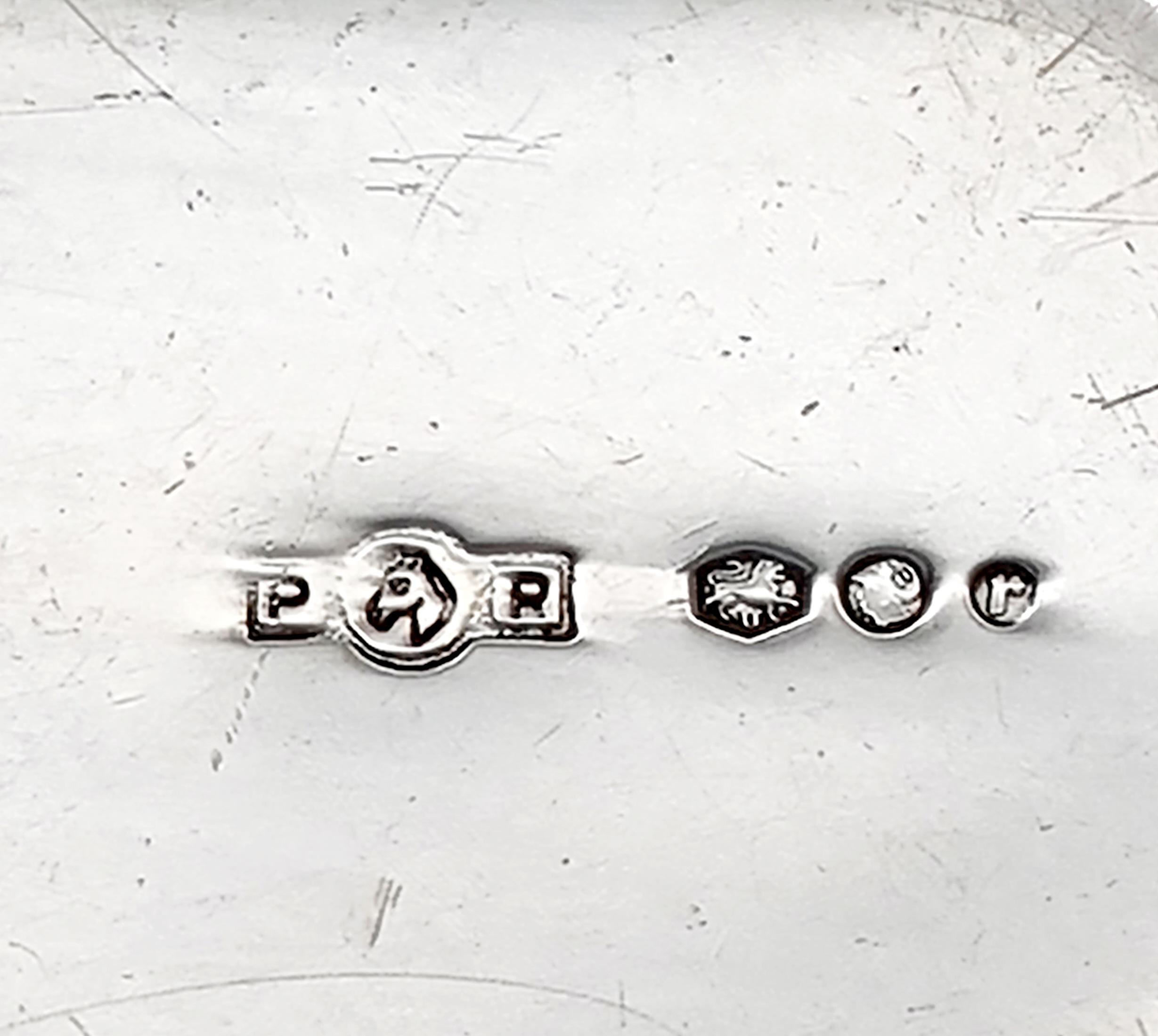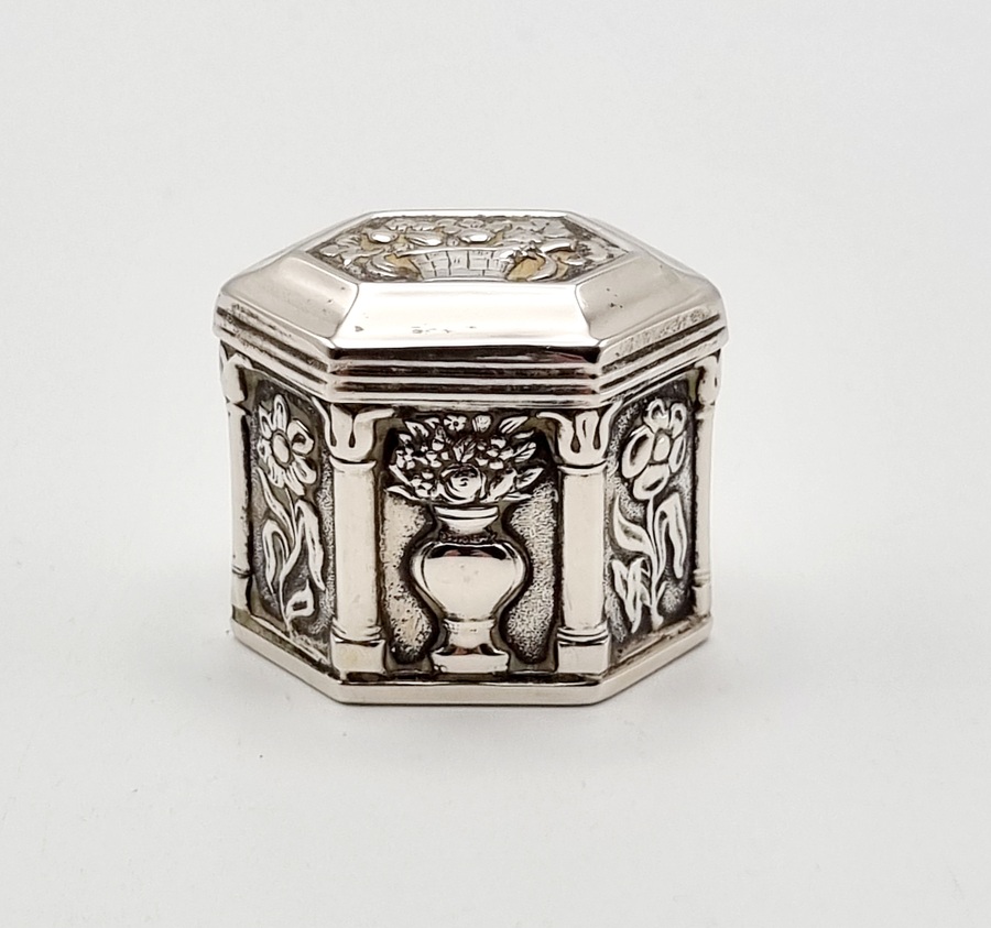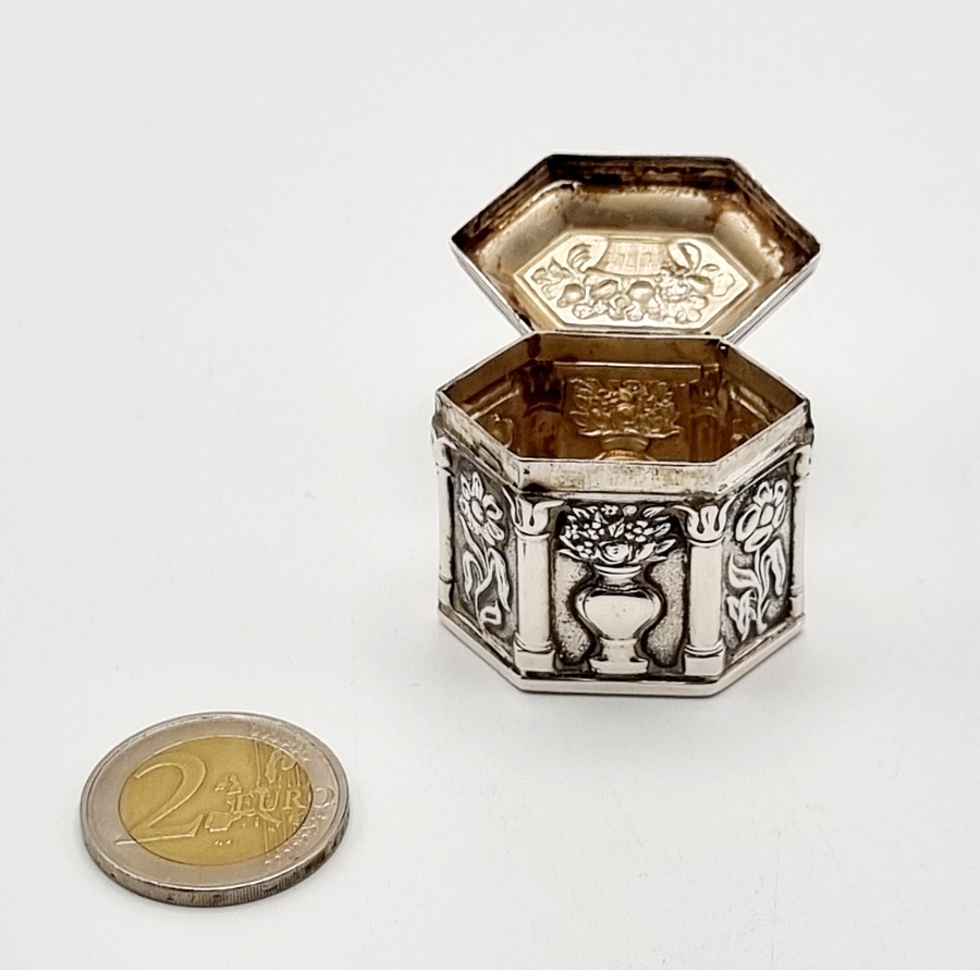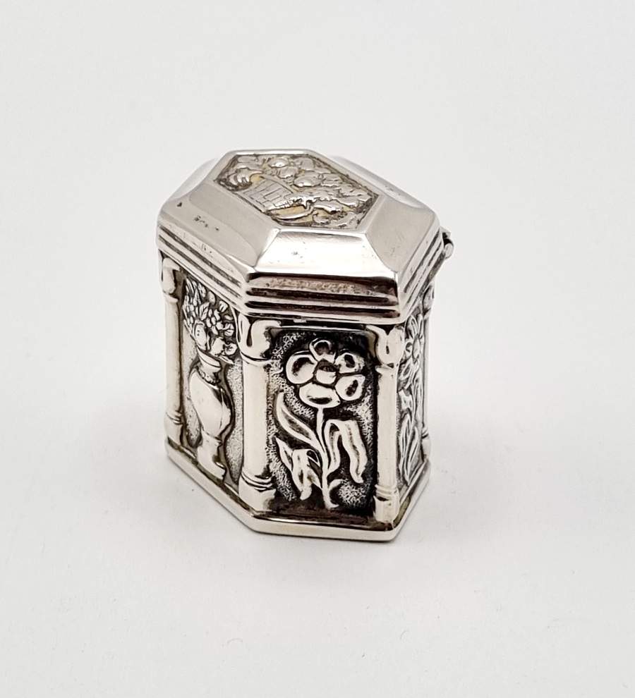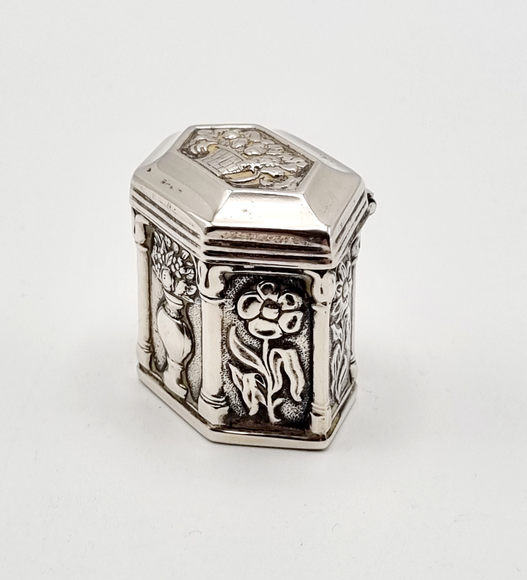 Zilveren lodereindoosje. Gemerkt met lopende leeuw II, meesterteken p r en een paard, minervakop met B (Utrecht) en de jaarletter r (1876). |