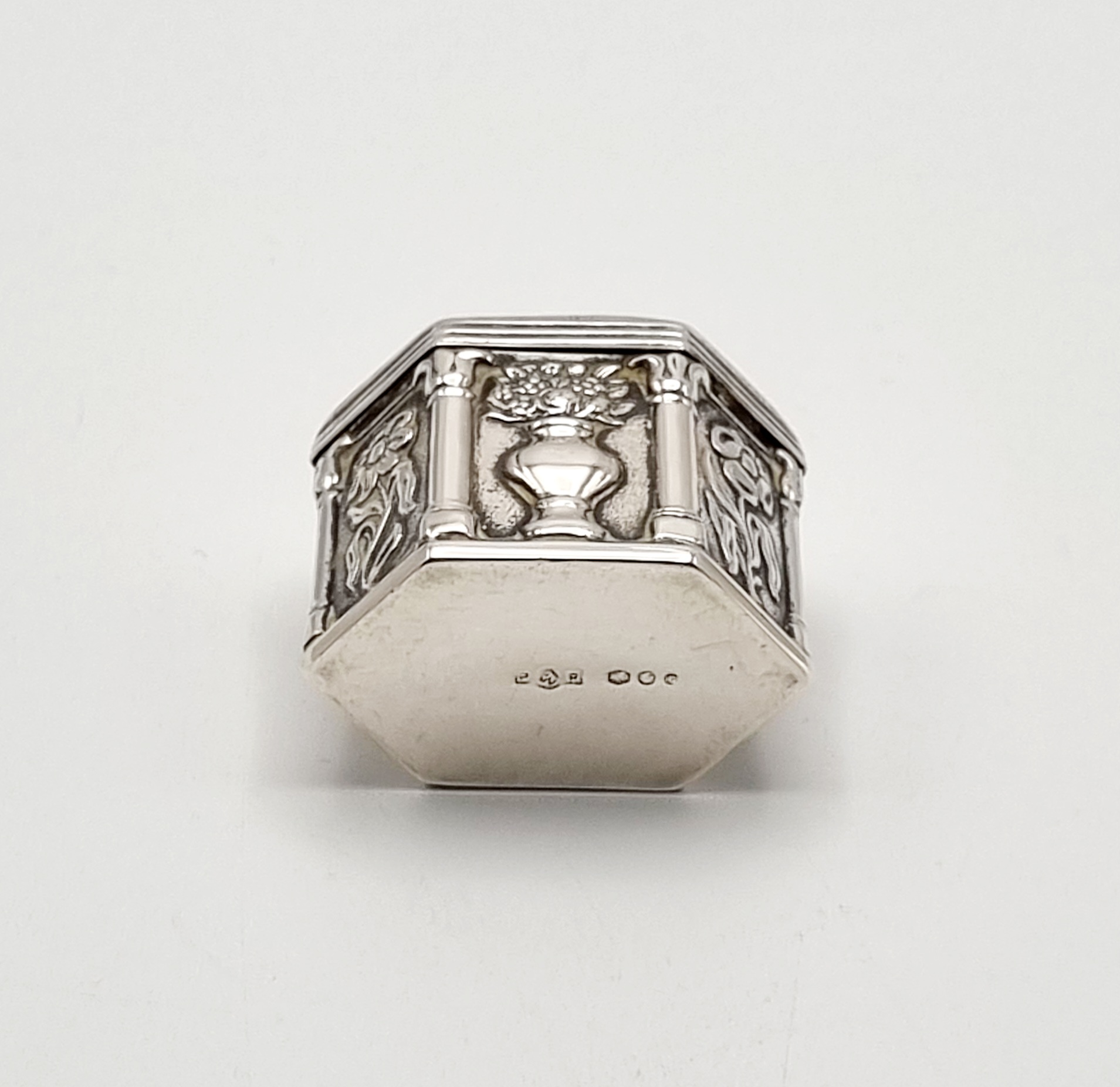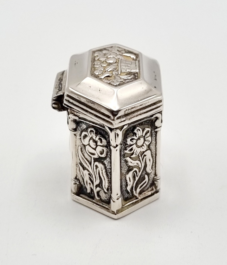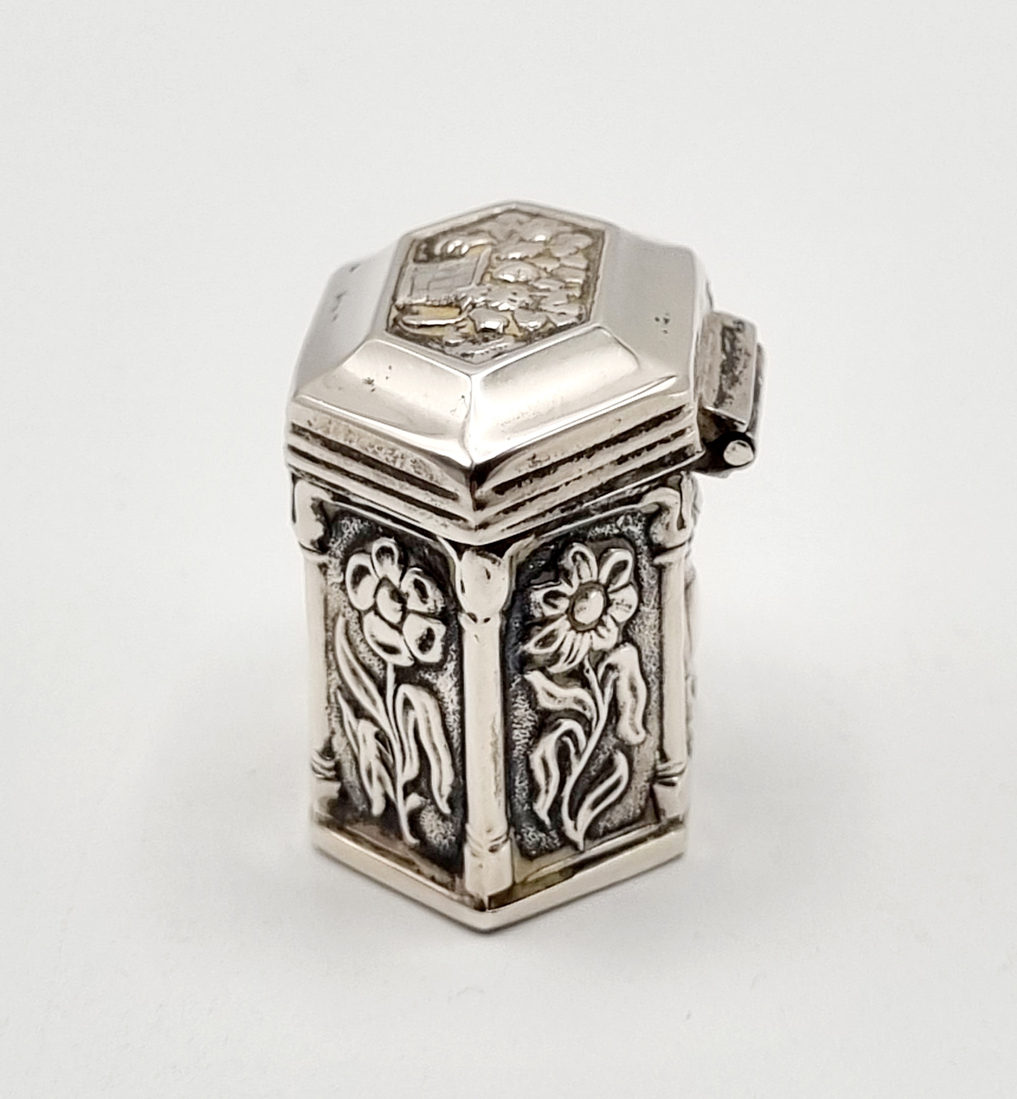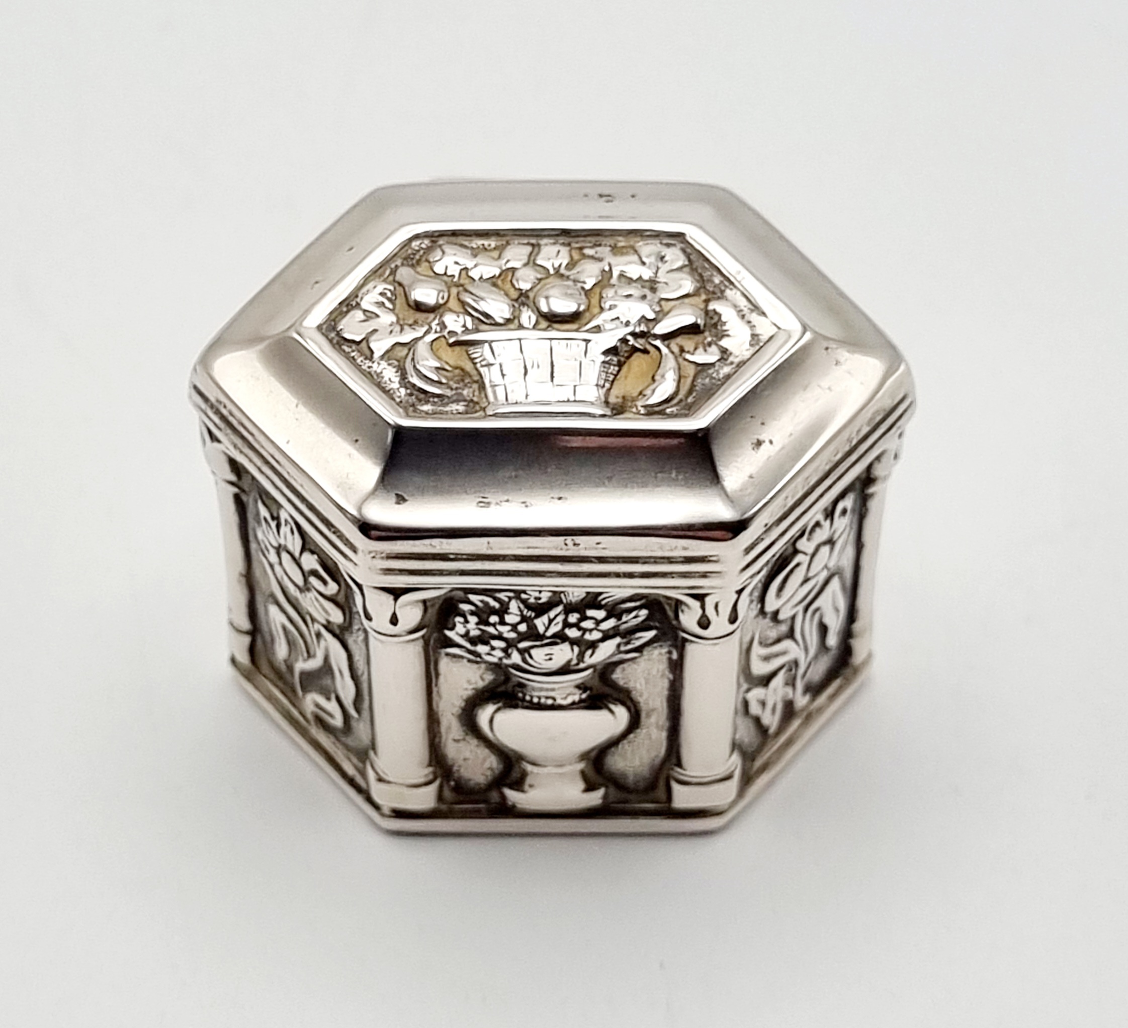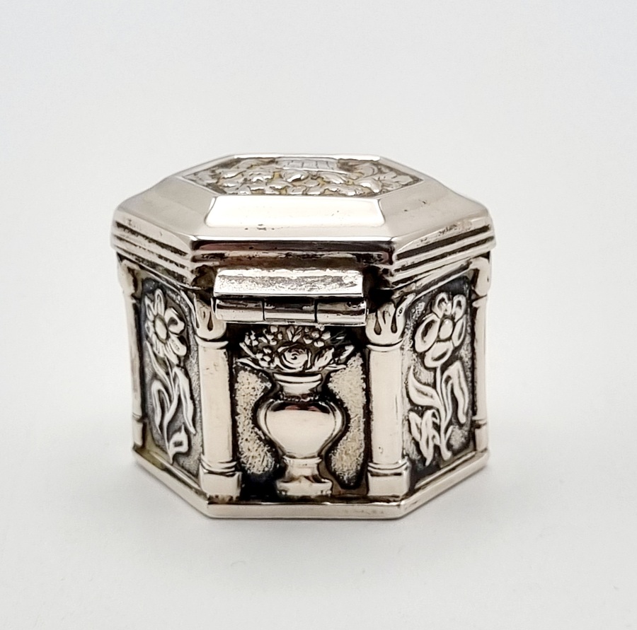Zilveren lodereindoosje. Gemerkt met lopende leeuw II, meesterteken p r en een paard, minervakop met B (Utrecht) en de jaarletter r (1876). |