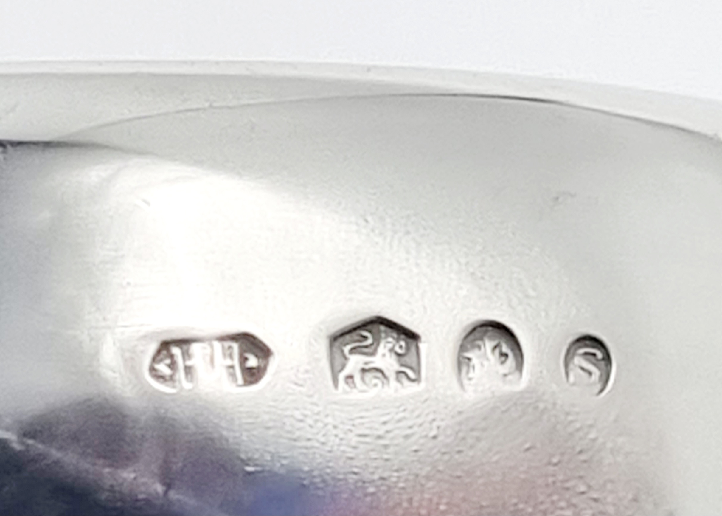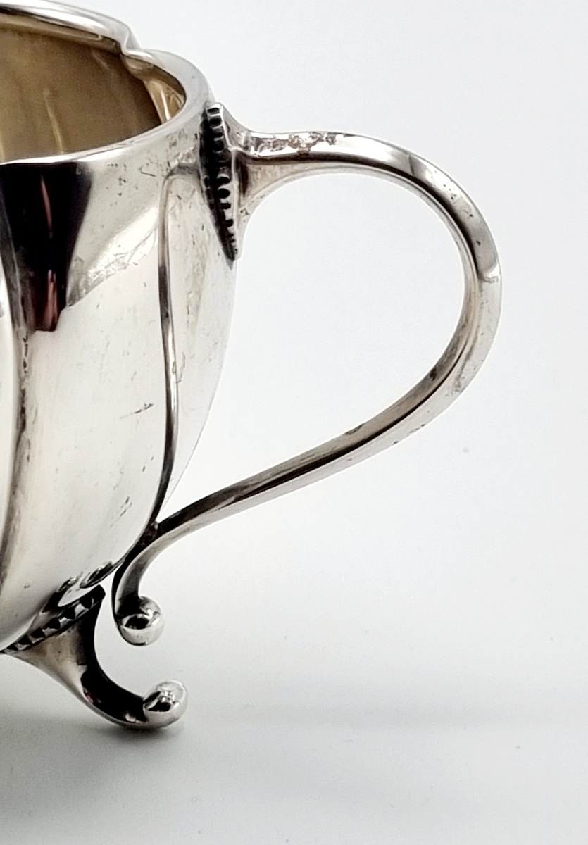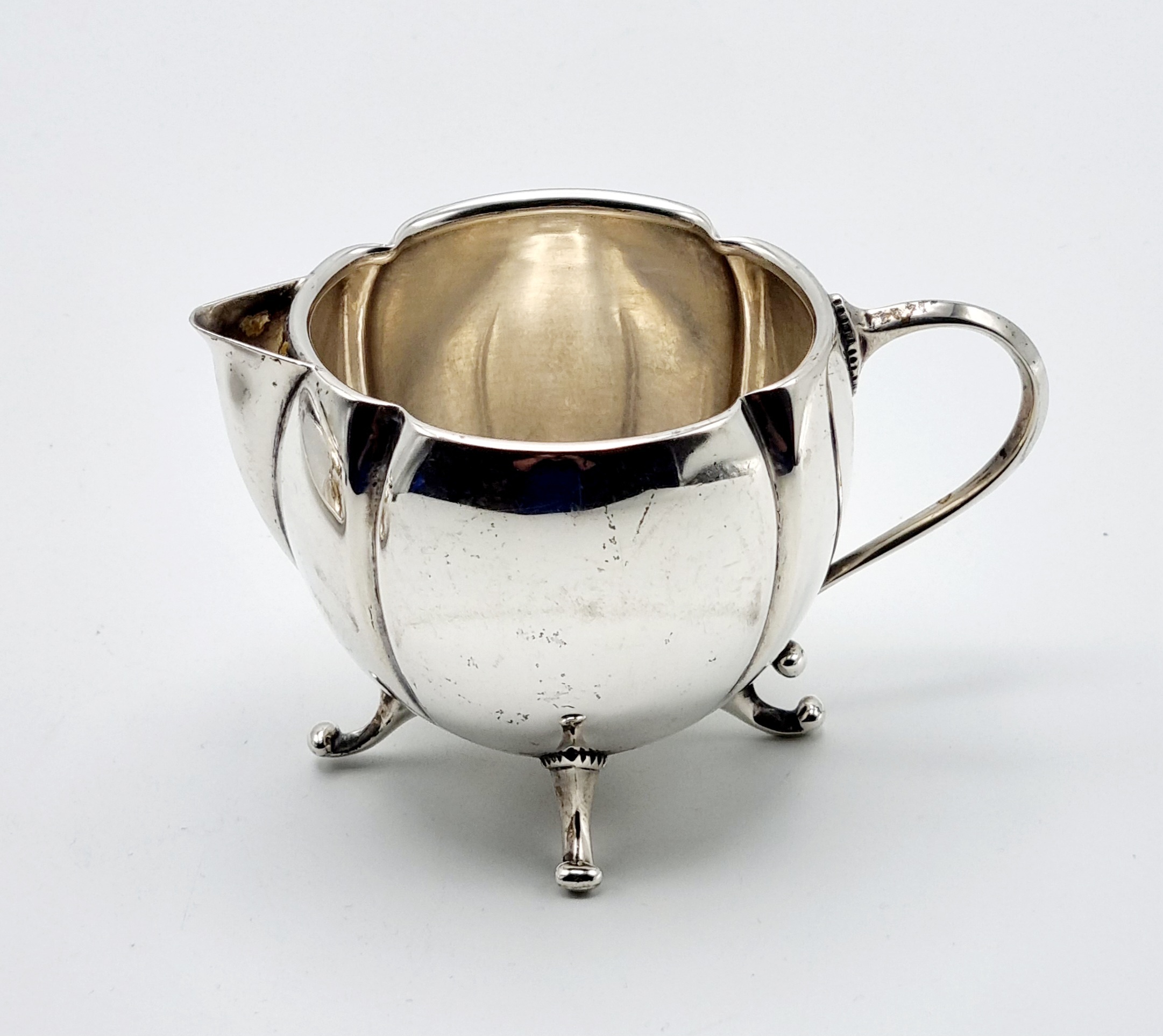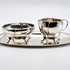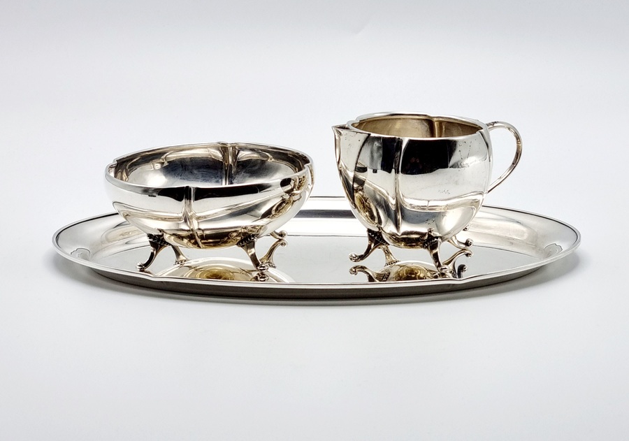 Zilveren suiker- en melkstel met dienblaadje gemerkt met lopende leeuw 2, meesterteken HH (H. Hooijkaas te Schoonhoven), minervakop en jaarletter S (1953). |