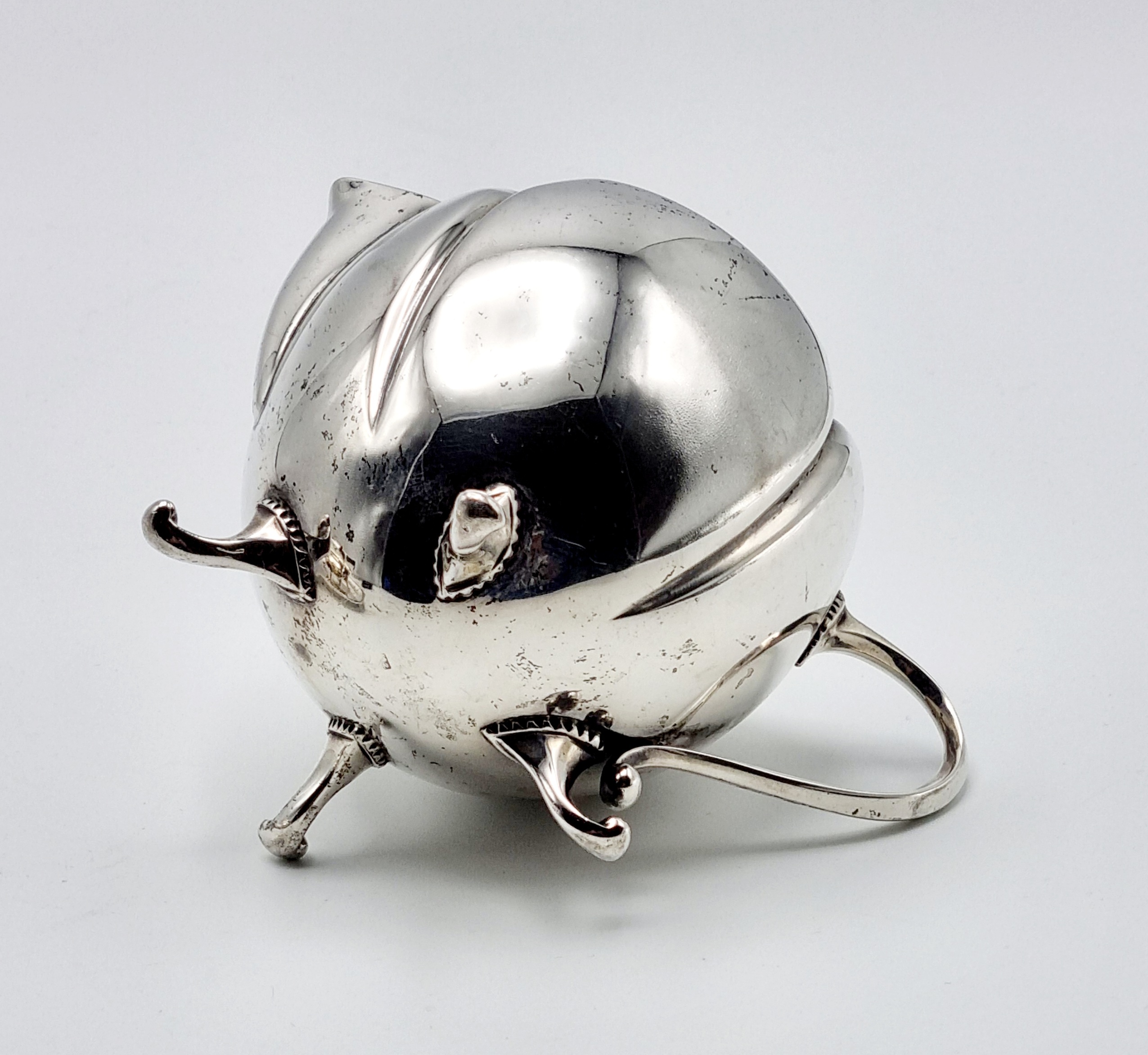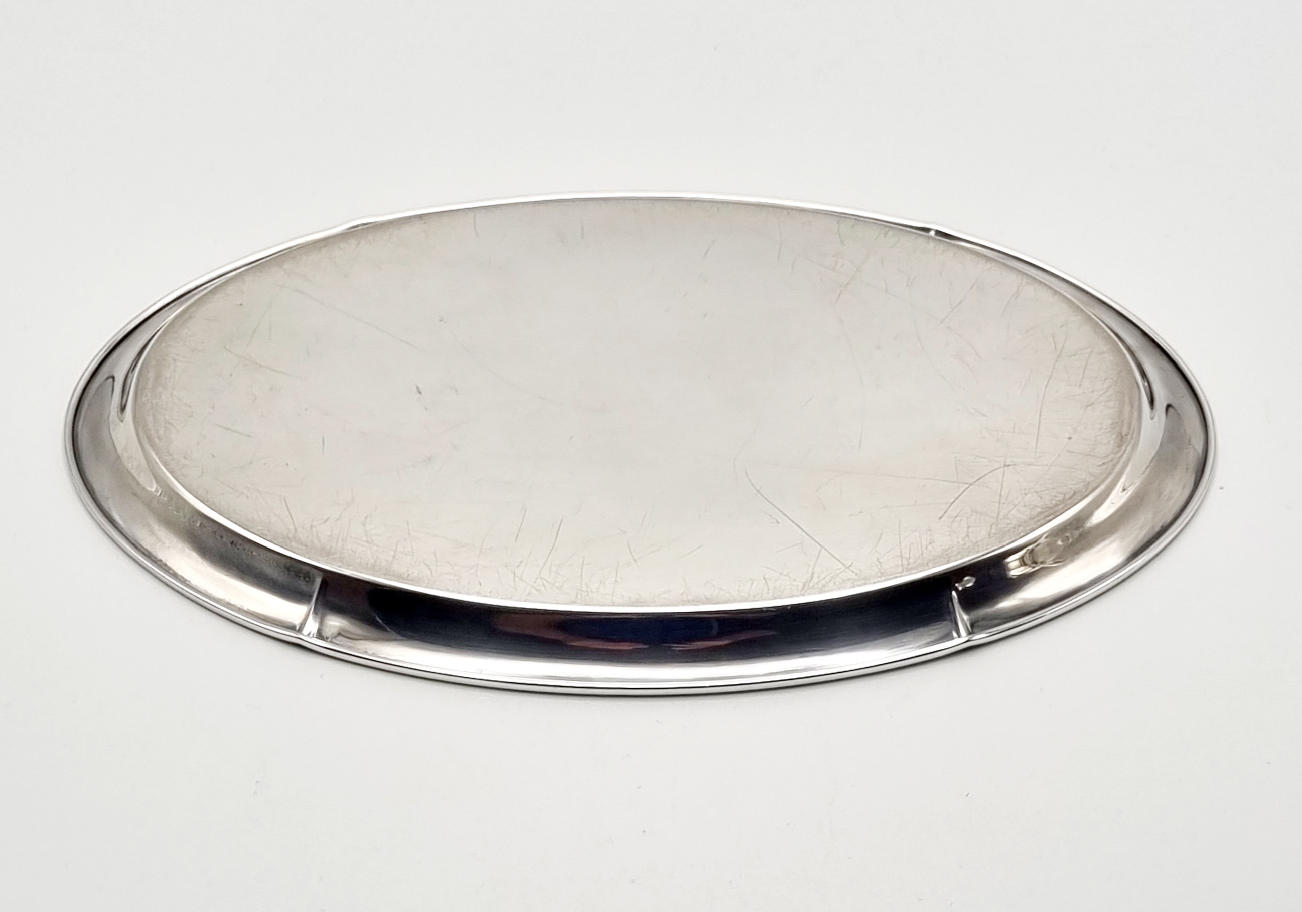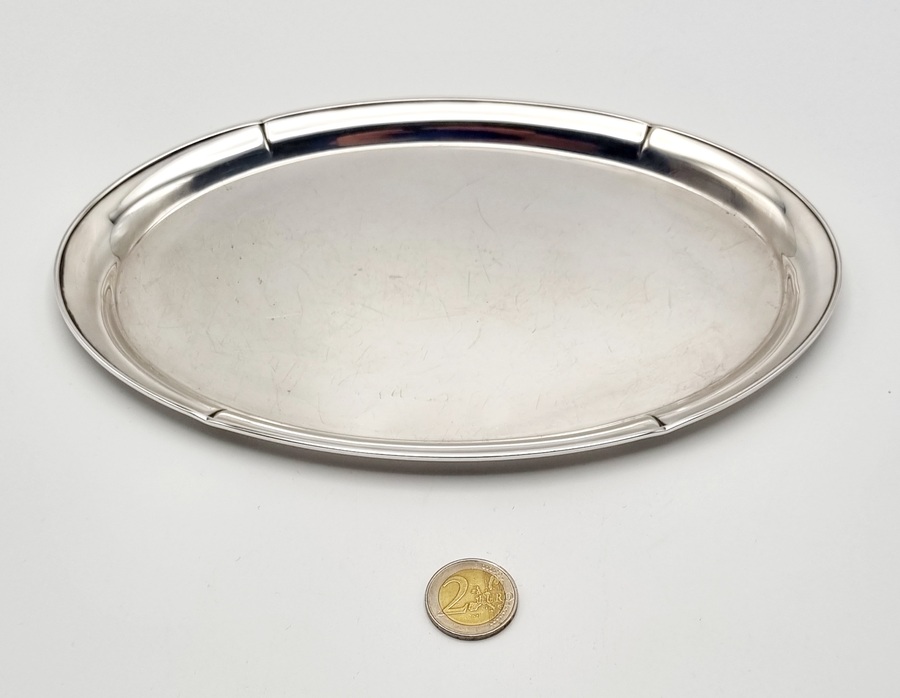 Zilveren suiker- en melkstel met dienblaadje gemerkt met lopende leeuw 2, meesterteken HH (H. Hooijkaas te Schoonhoven), minervakop en jaarletter S (1953). |