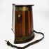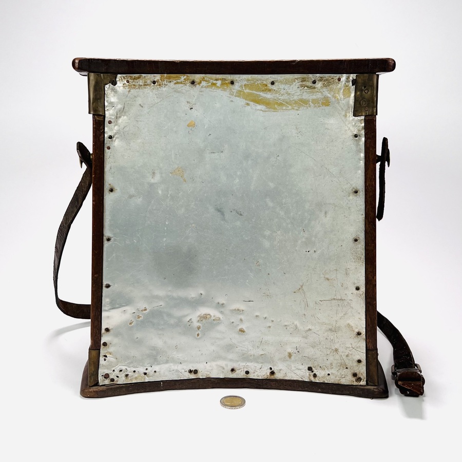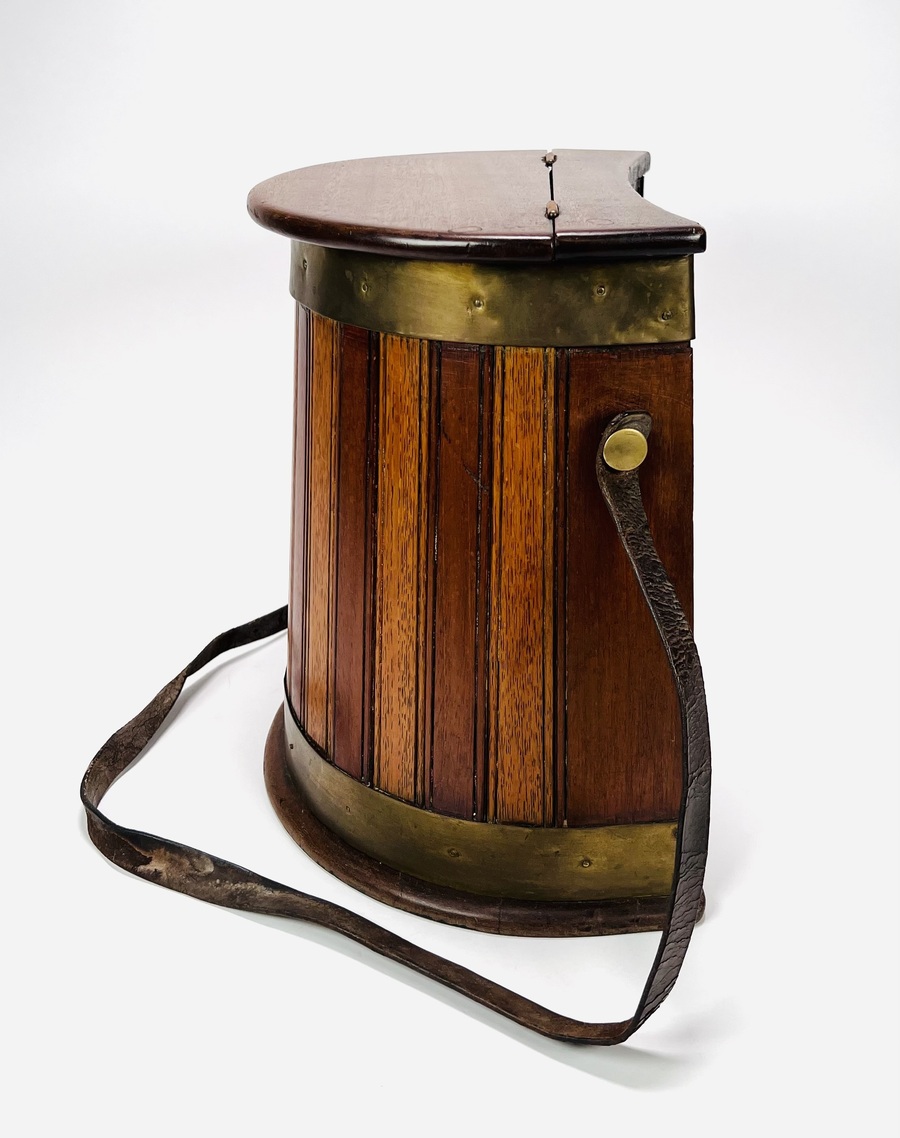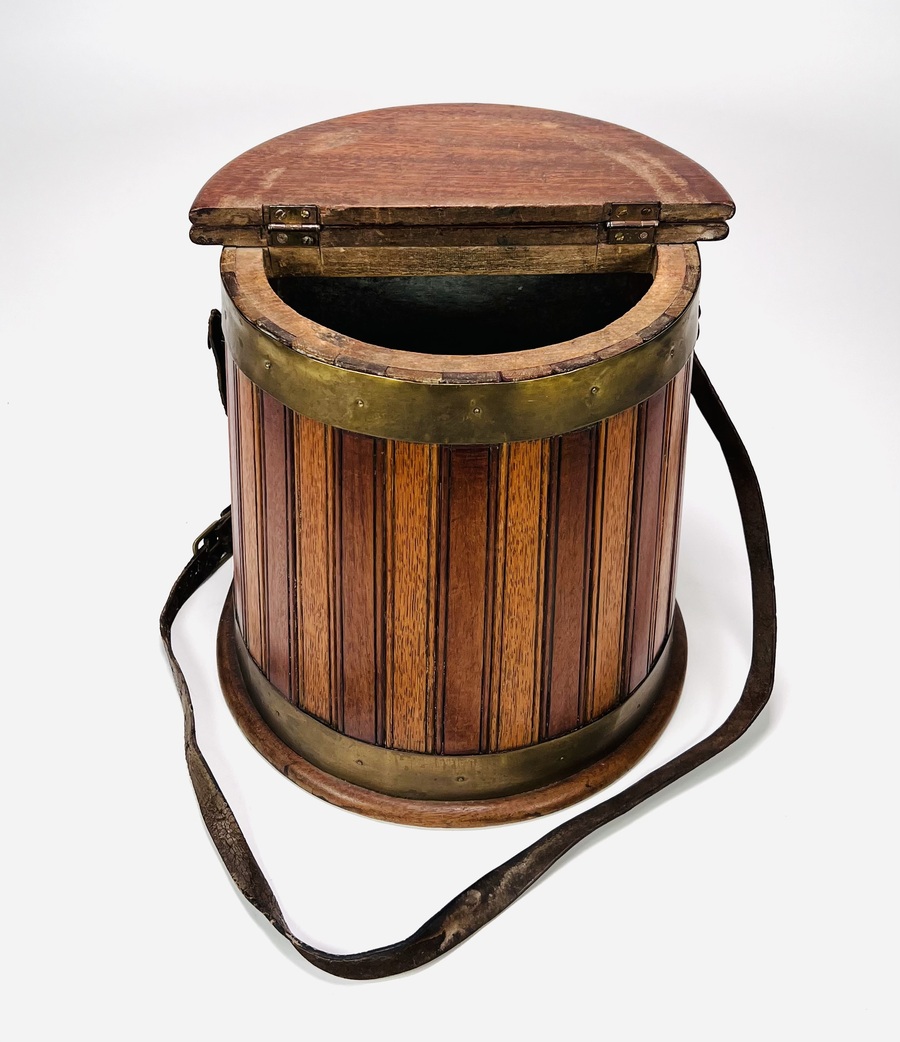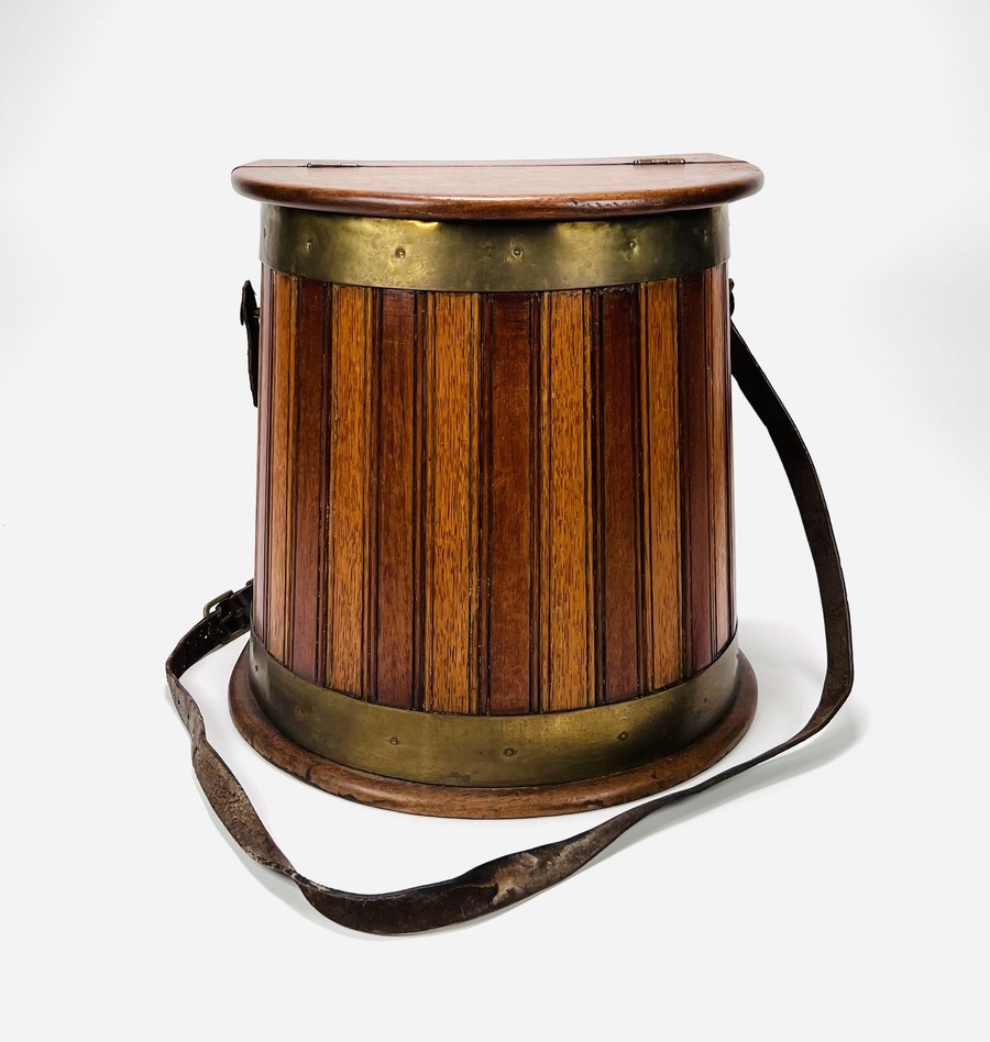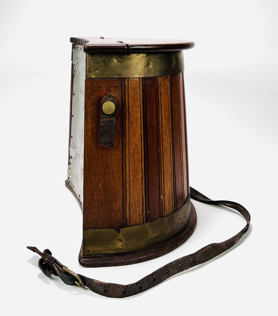 Houten viskoffer met messing spanbanden en lederen draagband, voor vissers tevens te gebruiken als kruk. Engeland, eerste helft 20e eeuw. |