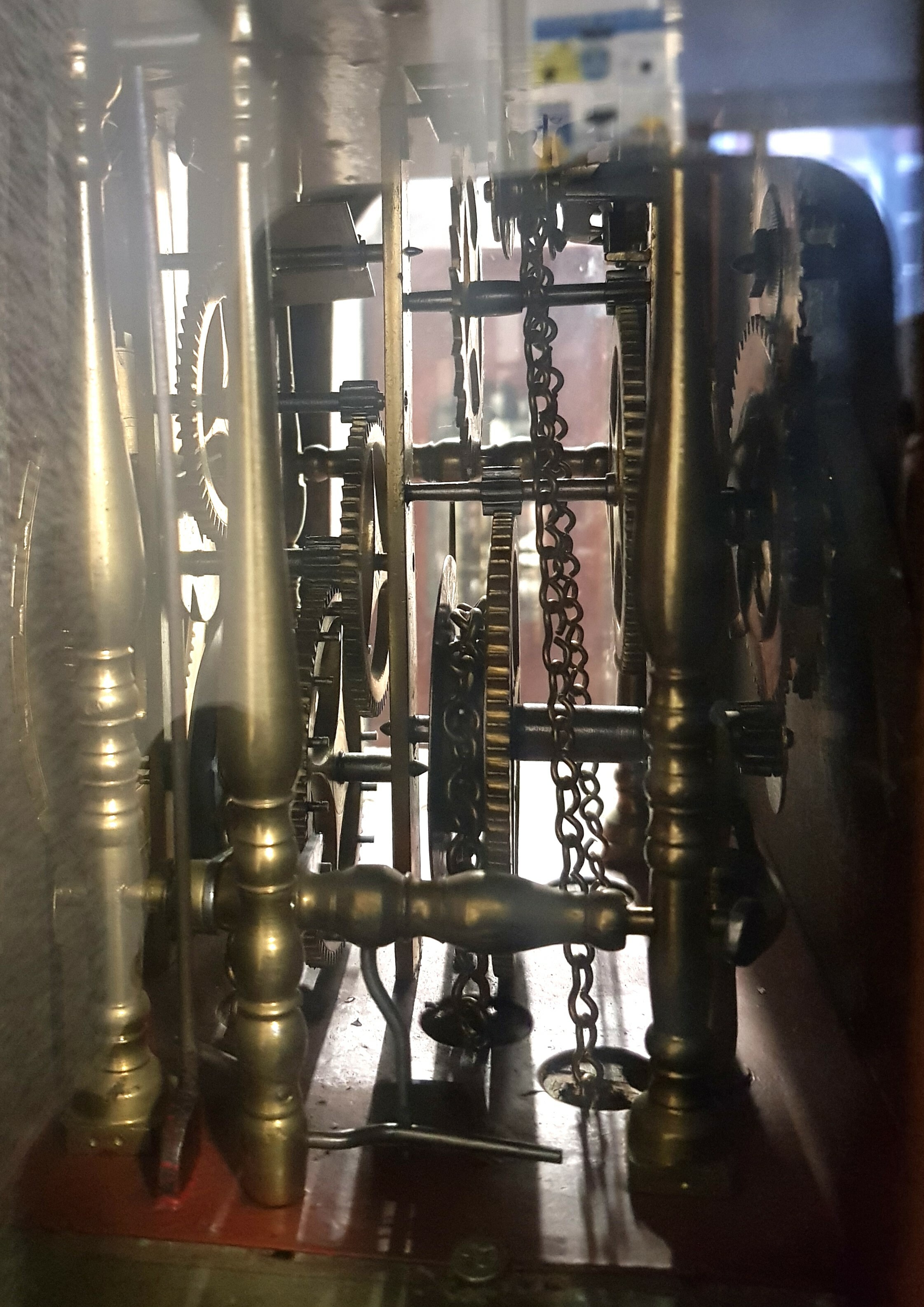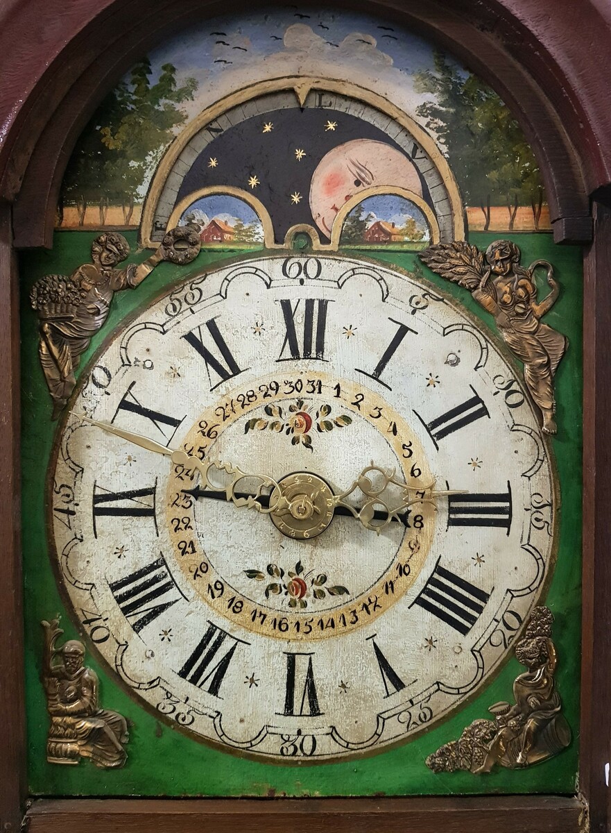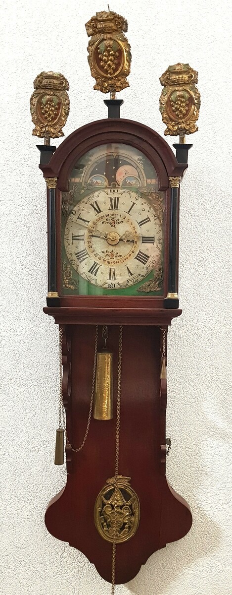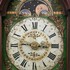 Friese staartklok met handbeschilderde wijzerplaat met datumaanduiding en maanmechanisme, op de kap latoenkoperen rozetten. Eind 19e eeuw. |
