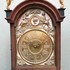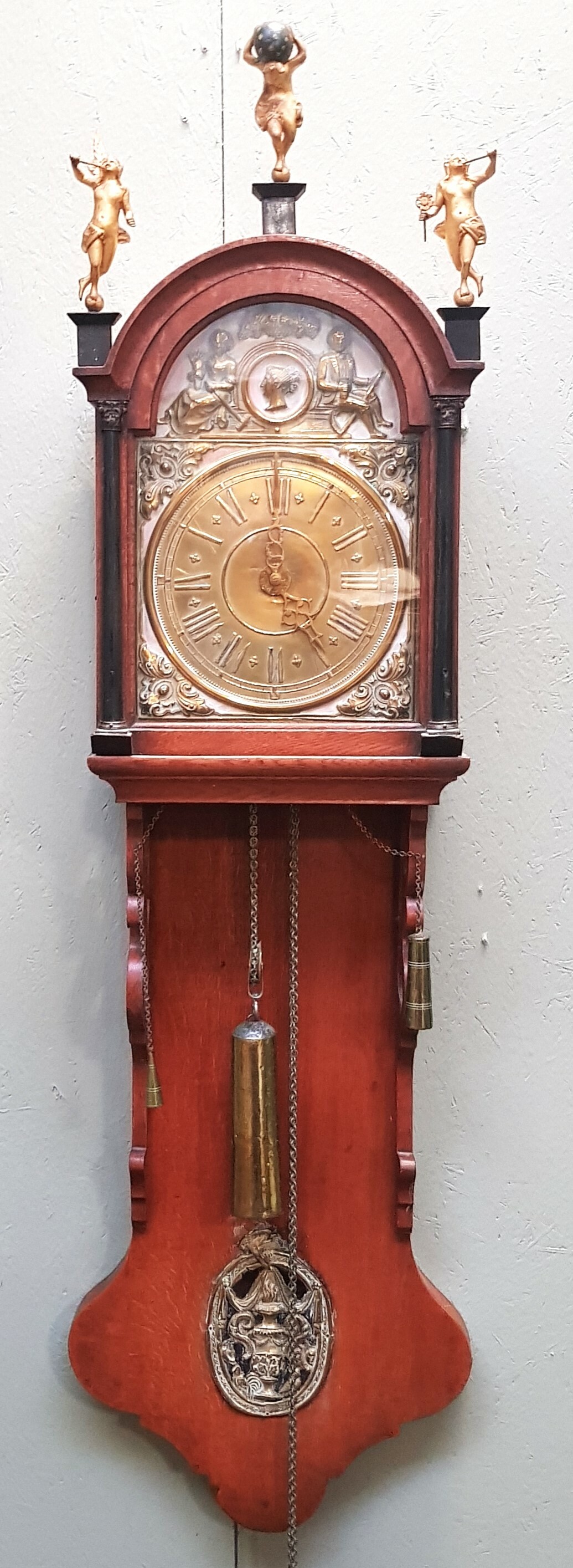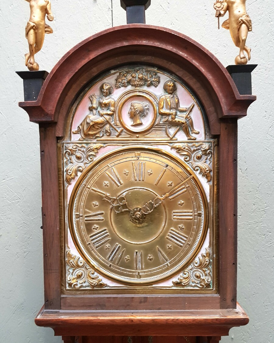 Friese staartklok met een gebogen kap en drie beelden, een Atlas figuur en twee keer de faam. De latoenkoperen wijzerplaat is uitgevoerd met messing Romeinse cijfers en krulornamenten in de hoeken. Hierboven een Empire vrouwenhoofd in een rond medaillon met daarnaast een boer en boerin met oogstgereedschap. 19e eeuw. |