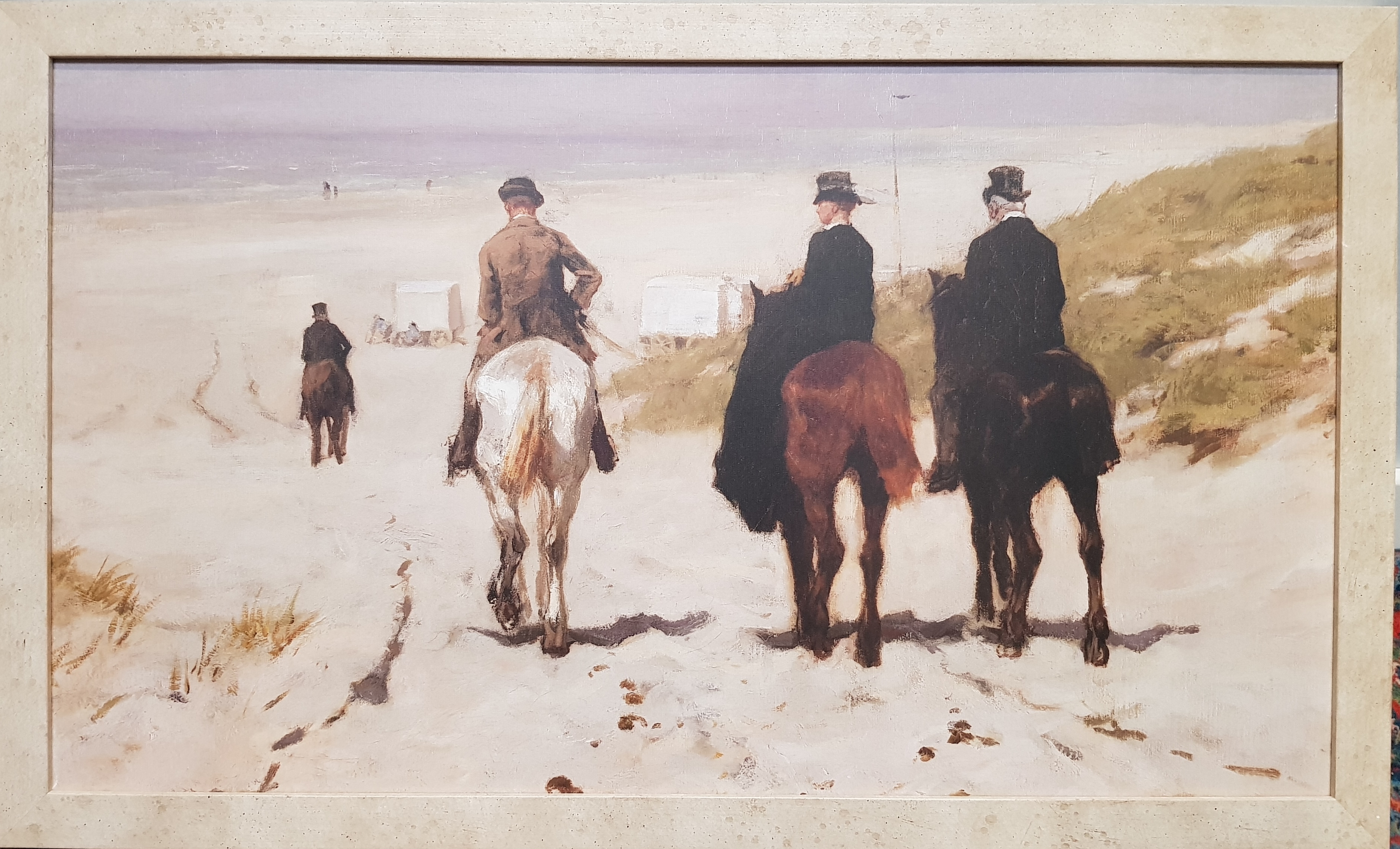 Giclée, kunstdruk van een strand met ruiters getiteld “Morgenrit langs het stand” naar Anton Mauve. 21e eeuw. |