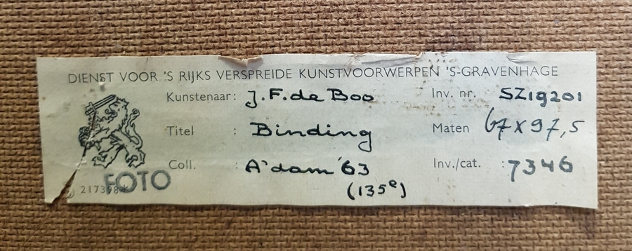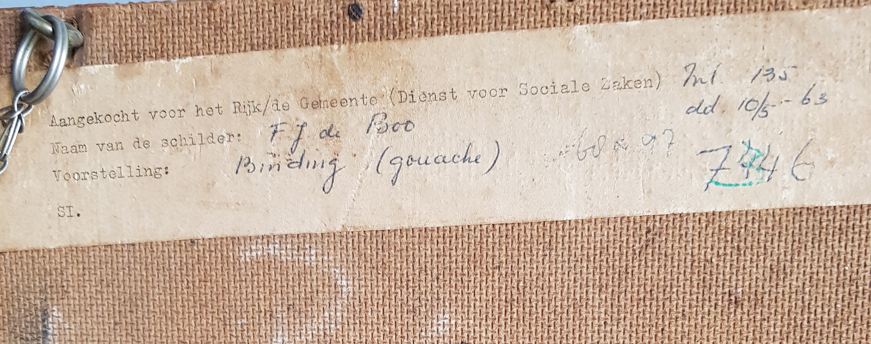 Gouache getiteld “Binding” door Frans (Franciscus Josephus) de Boo (1925-1999). Rechtsonder gesigneerd en gedateerd 1963. Verso informatie. |