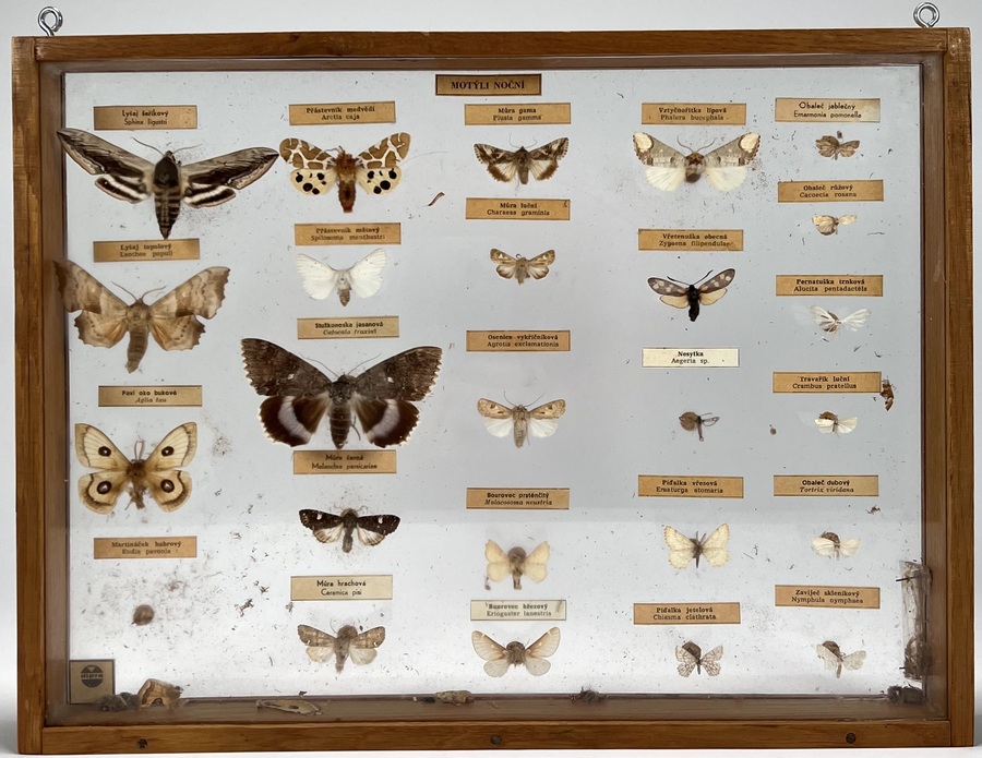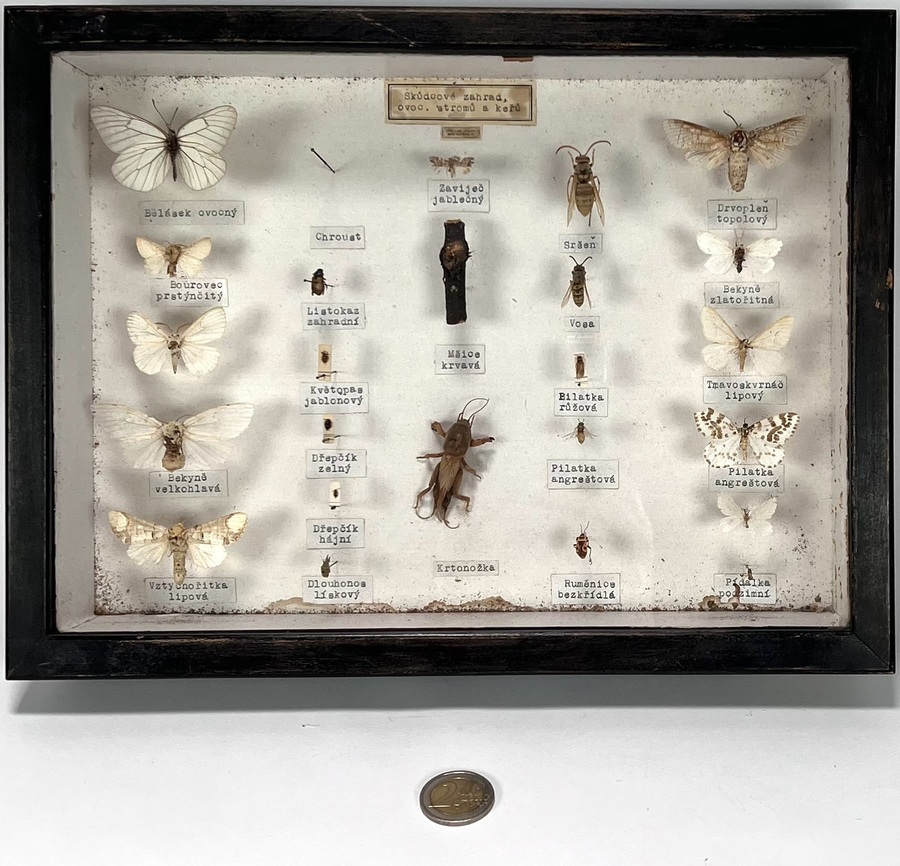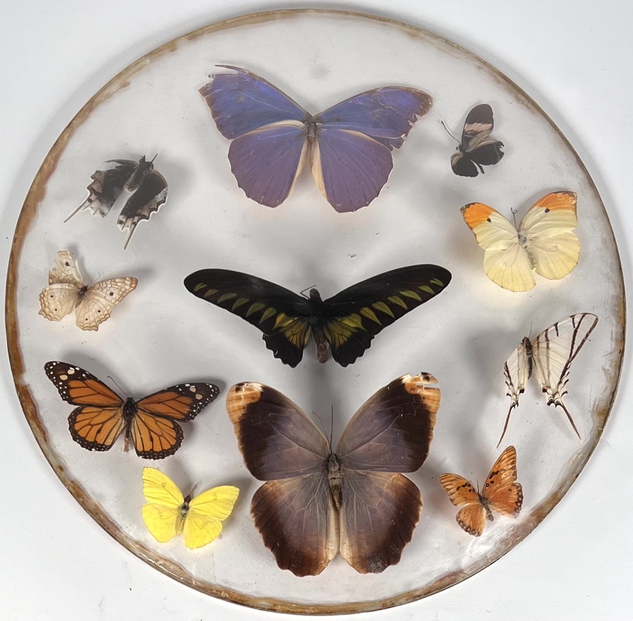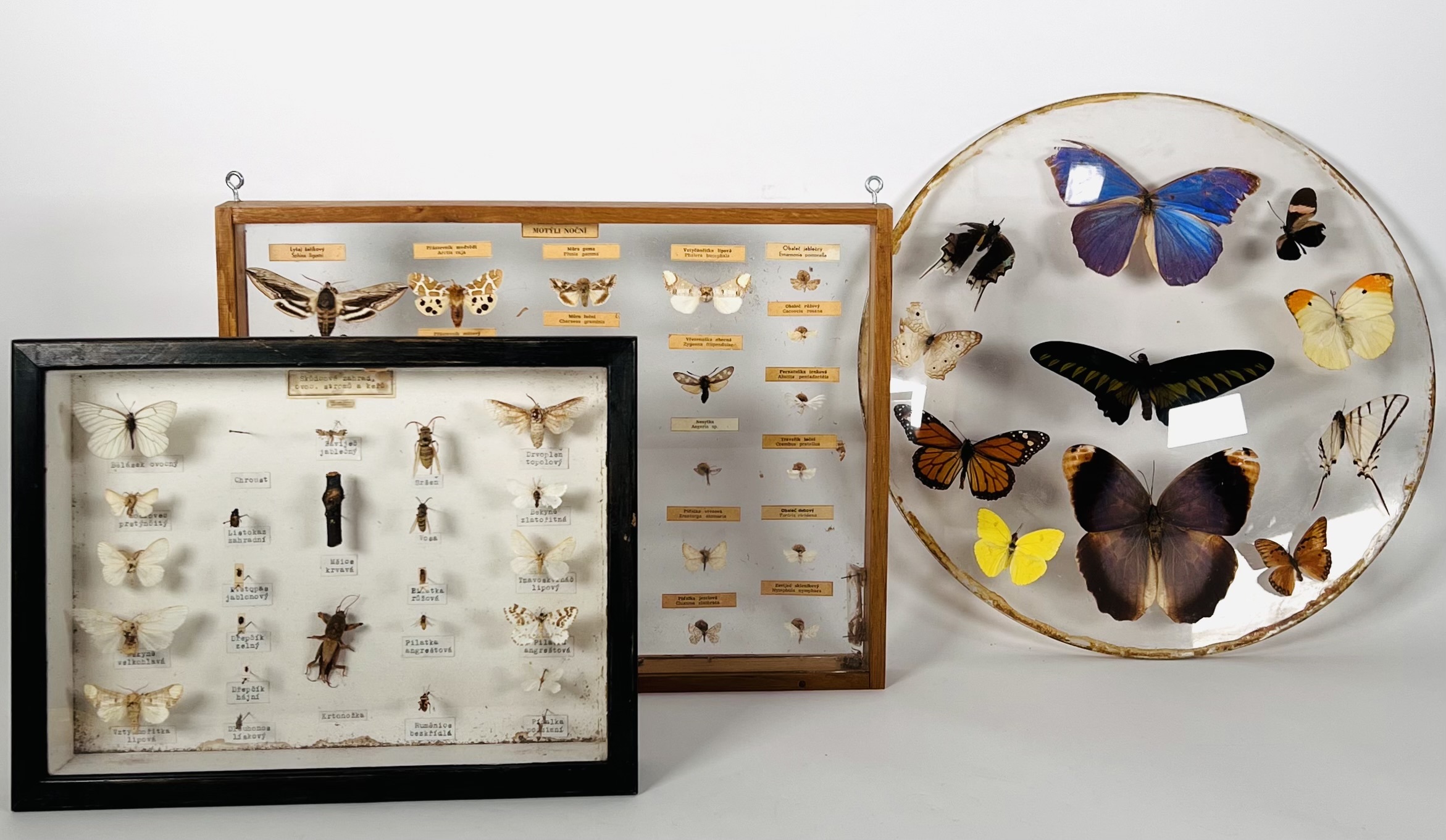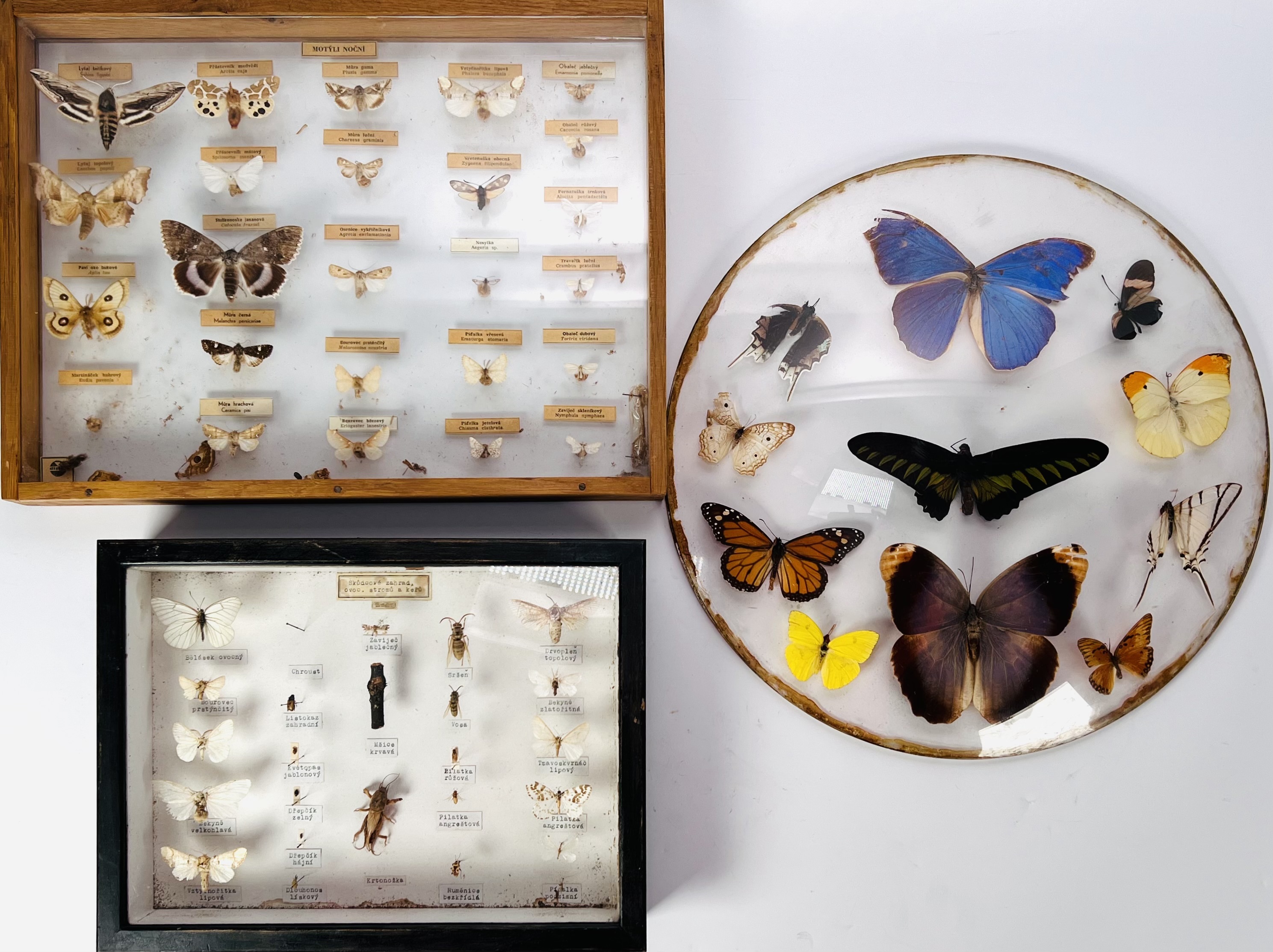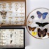 Twee kastjes met vlinders, motten en andere insecten. Tevens een ronde glashouder met vlinders. 20e eeuw. |