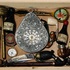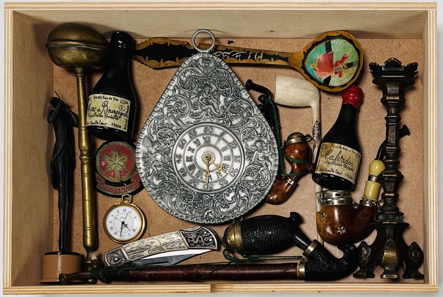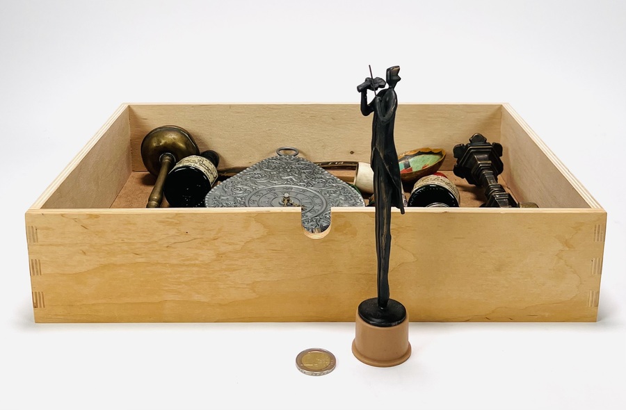 Lot curiosa met pijpen, kandelaar, beeldje vioolspeler, zakmes en klok. 20e eeuw. |