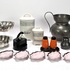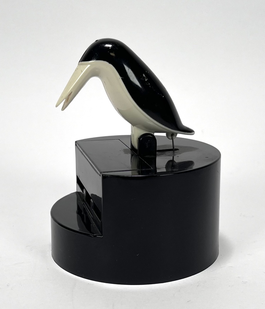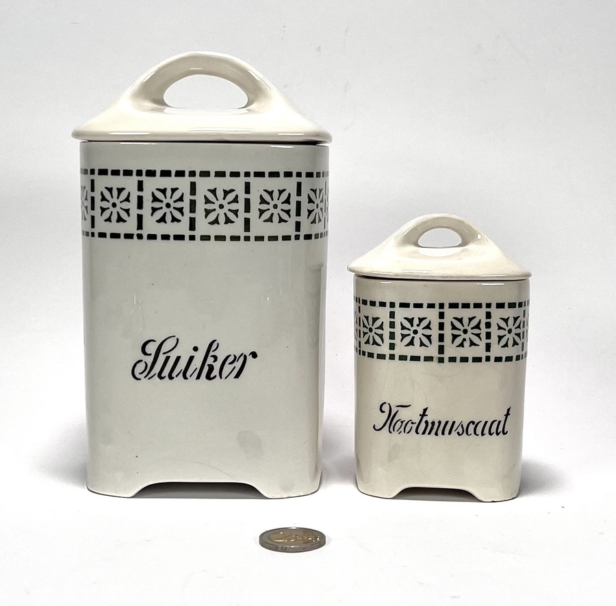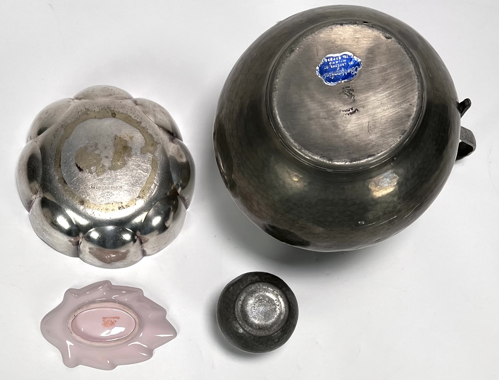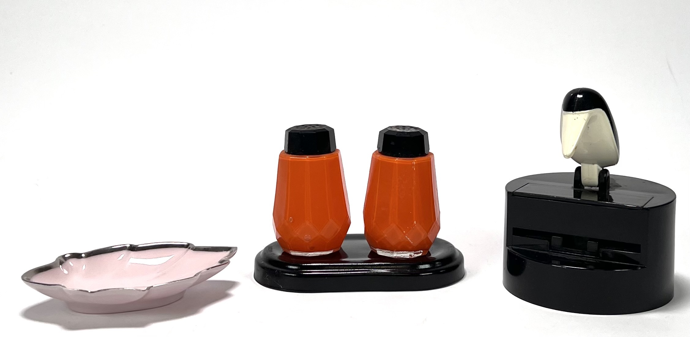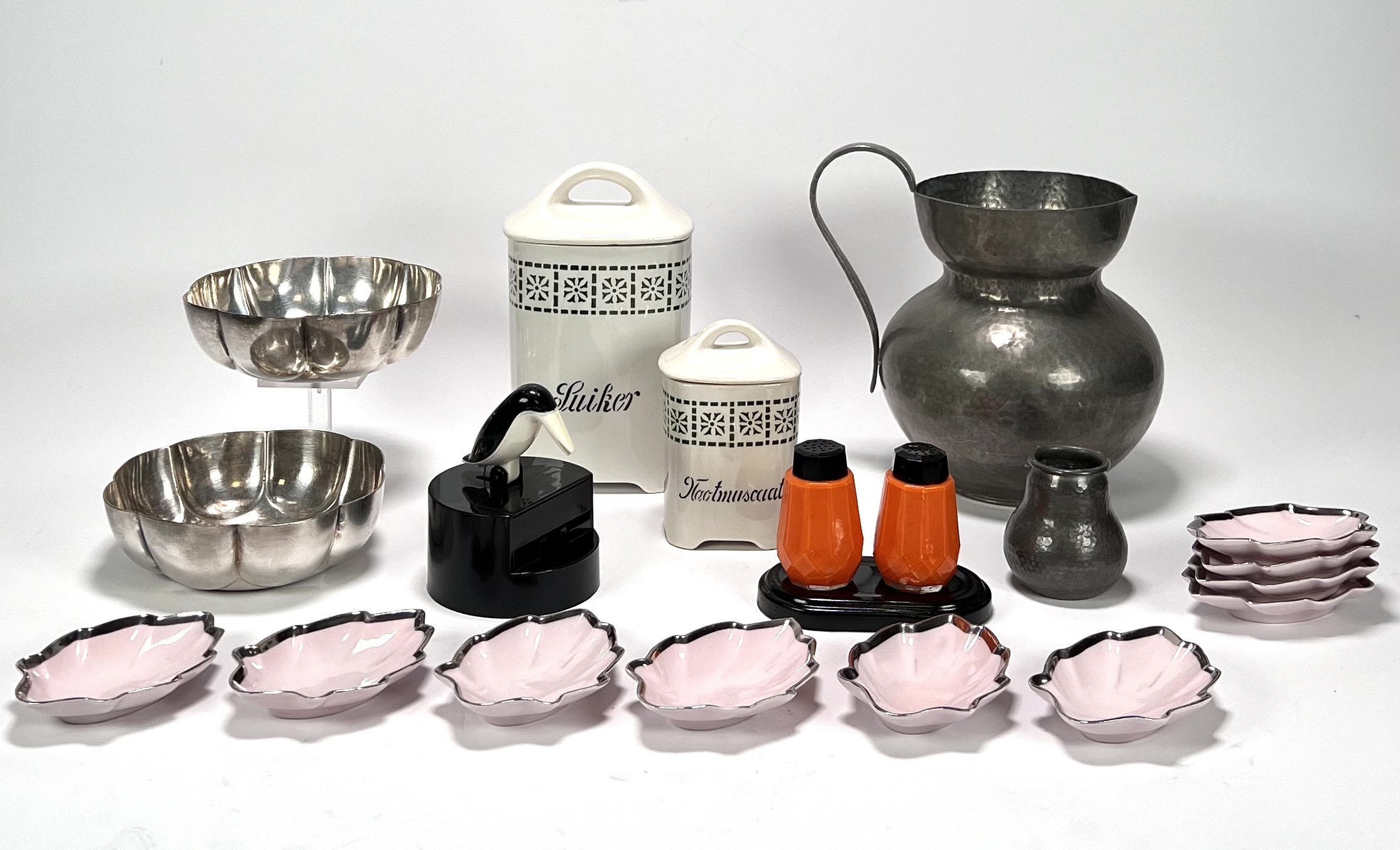 Lot curiosa met vogelmodel sigaretten box, voorraadpotten, tinnen schenkkan en vaasje, Art Deco peper- en zoutstel, keramieken pindabakjes en twee gelobd verzilverde schalen. 20e eeuw. |