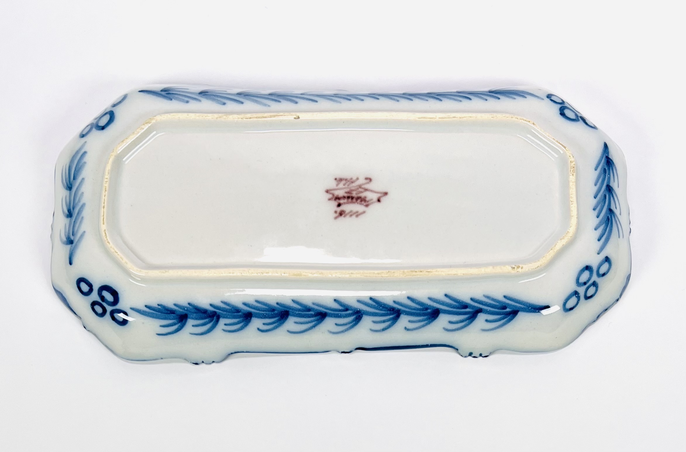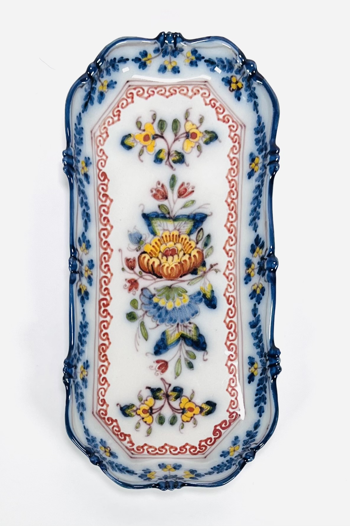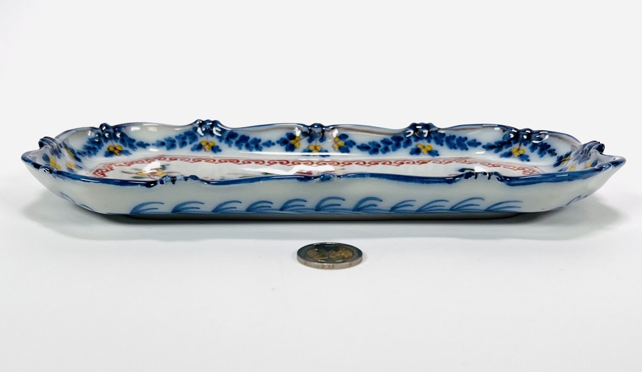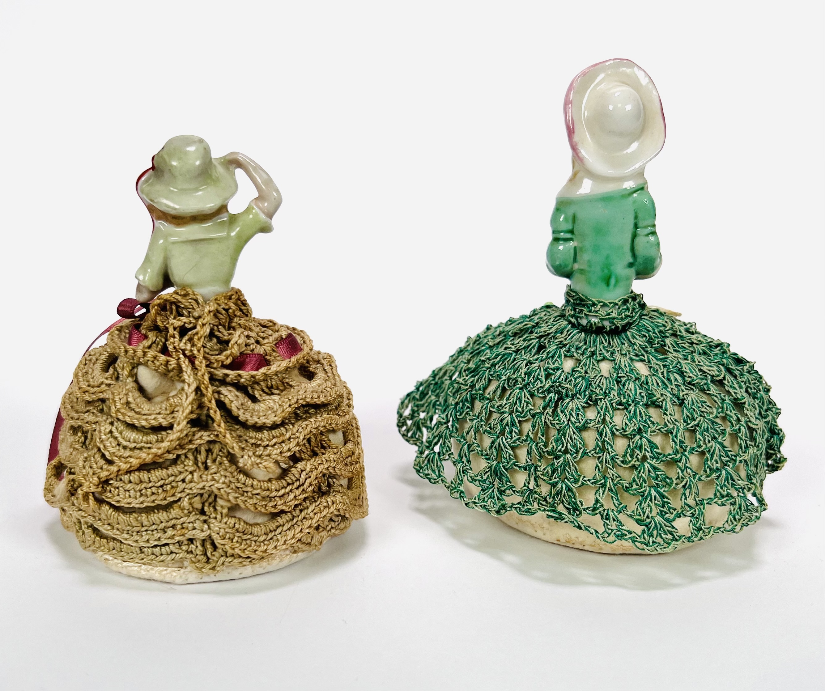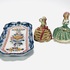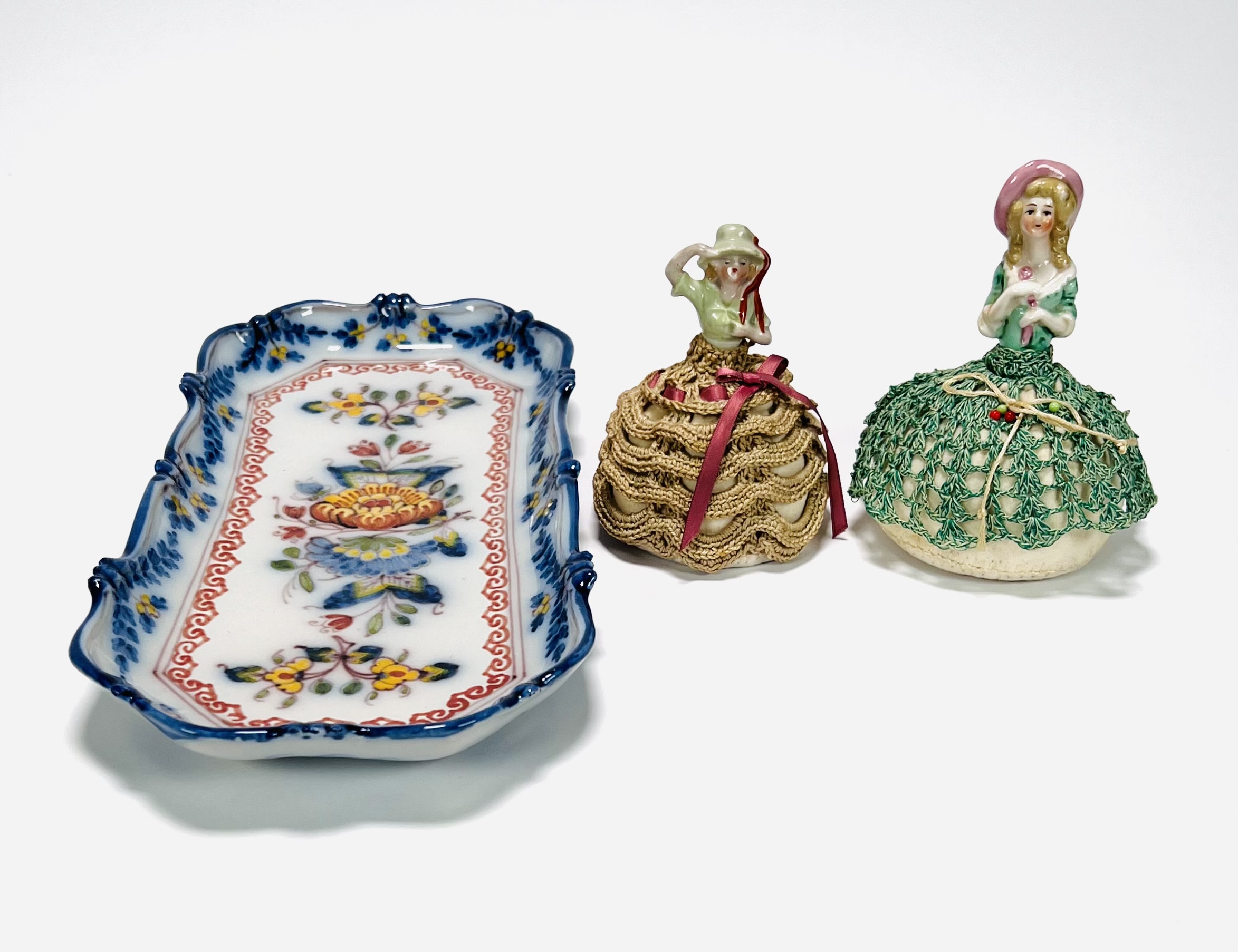 Twee Duitse half dolls met porseleinen bovenlijf. Alsook een aardewerken cakeschaal met floraal handbeschilderd motief door Aardewerkfabriek Makkum, aan de onderzijde gesigneerd. 20e eeuw. |