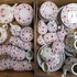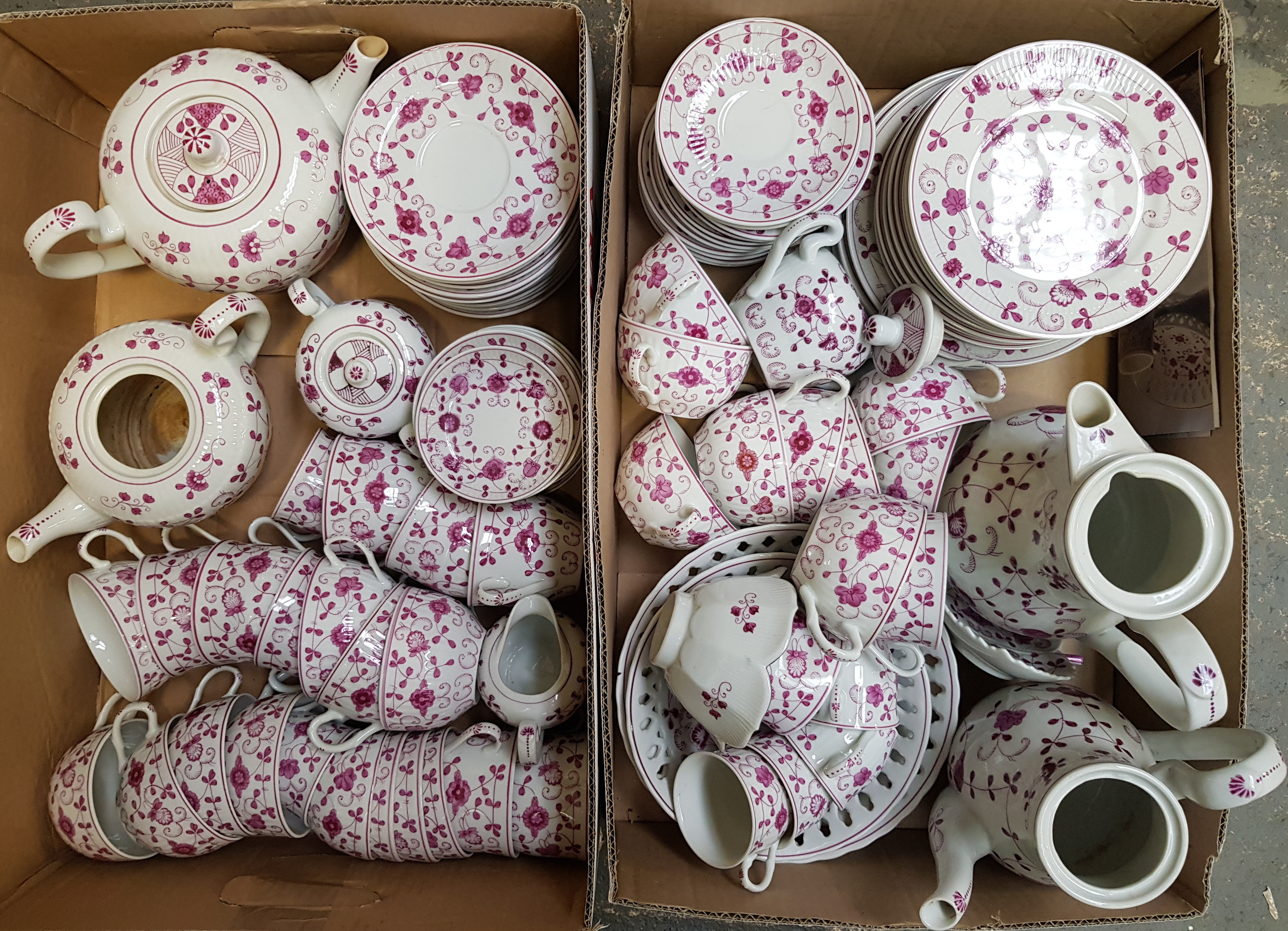 Porseleinen koffie-en theeservies, modelnaam China Purpur, van August Warnecke. Met onder andere serveerborden, melkkan, suikerpot, serveerschalen, vele kop-en-schotels en gebaksbordjes. Aan de onderzijde gemerkt, midden 20e eeuw. |