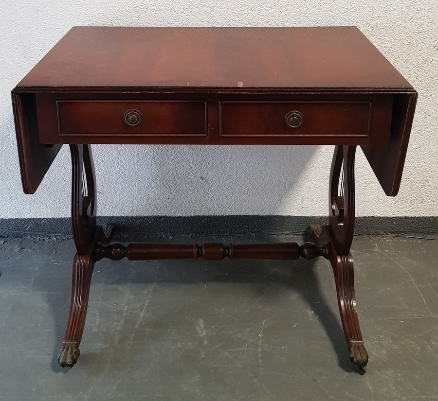Pembroke tafel met bronzen klauwpoten en voorzien van twee laden met bronskleurig beslag. Tweede helft 20e eeuw. |