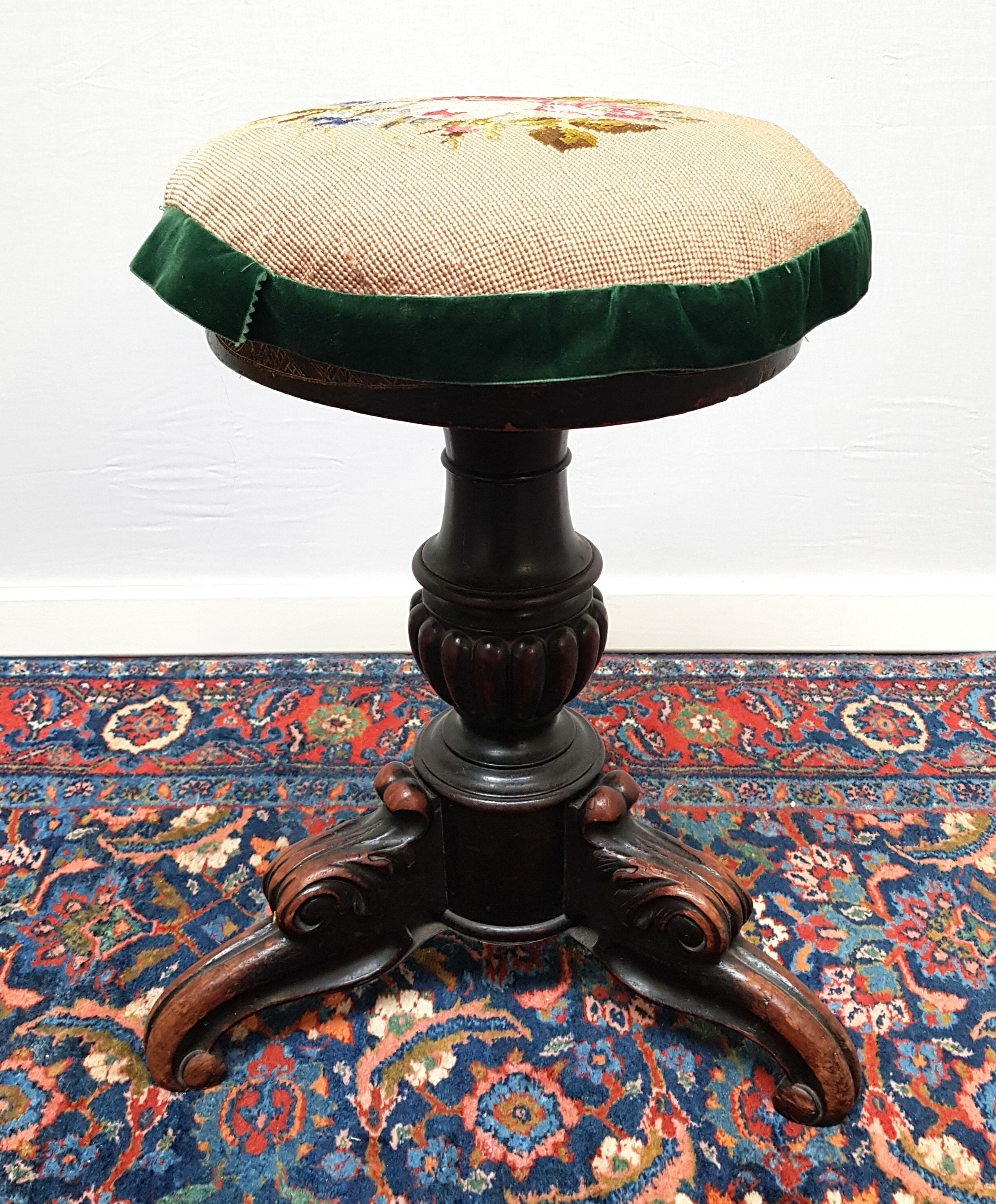 Mahoniehouten pianokruk met stoffen geborduurde florale bekleding, omstreeks 1900. |