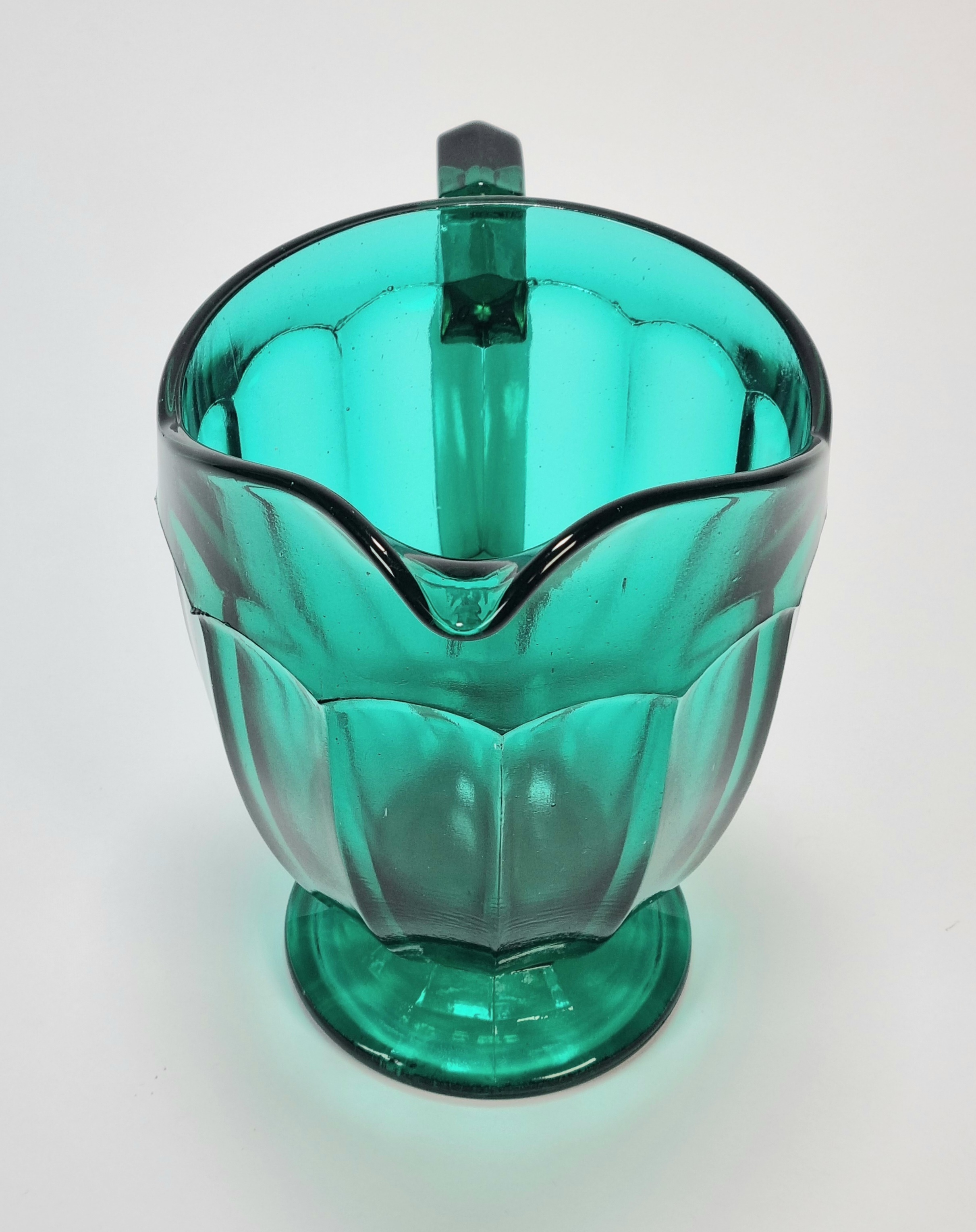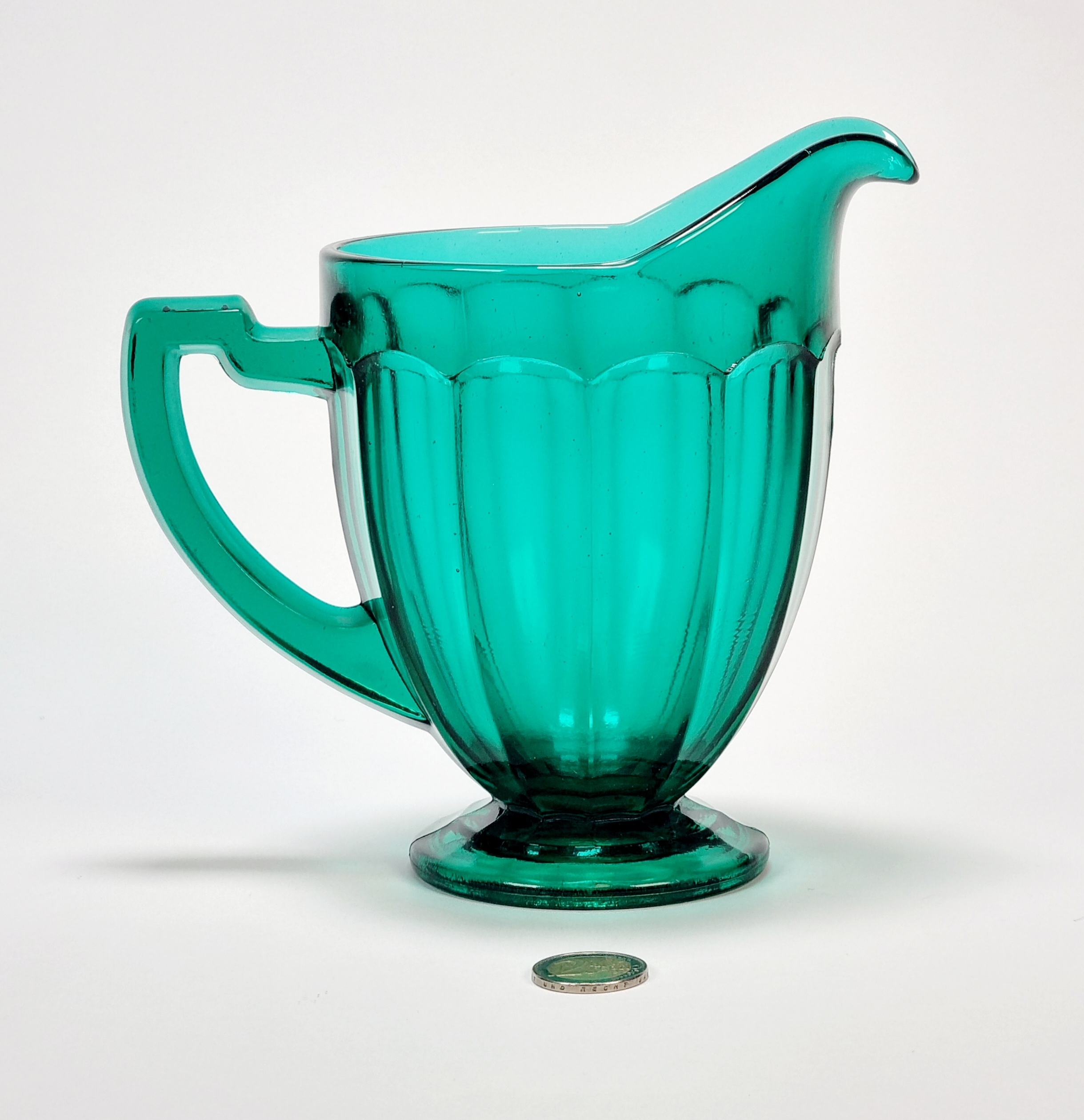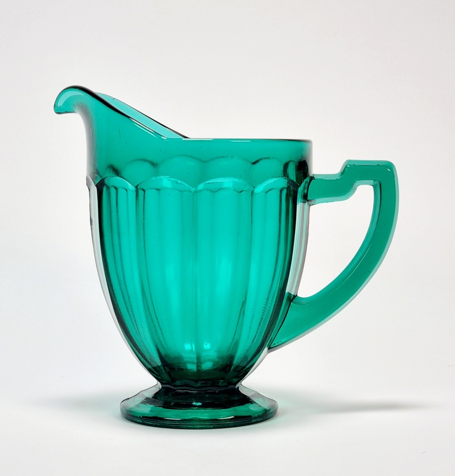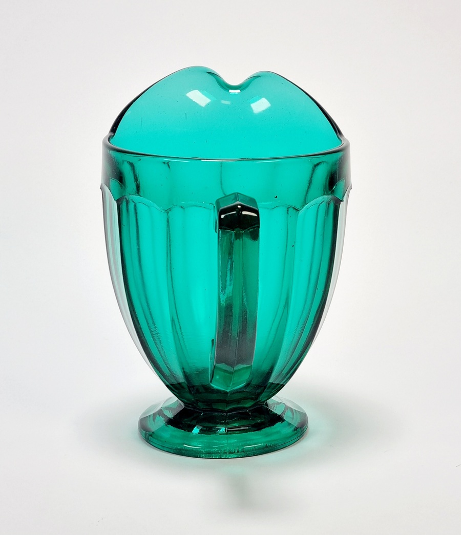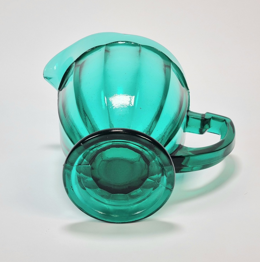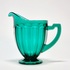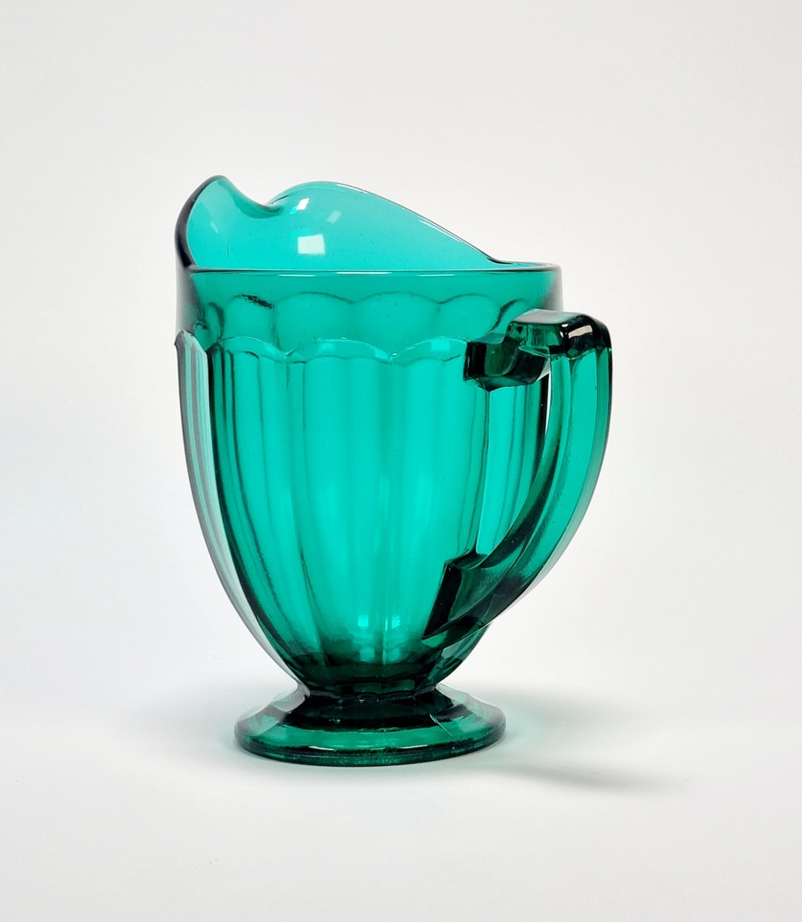 Petrolkleurige persglazen Art Deco schenkkan. Amerika, jaren 30. |