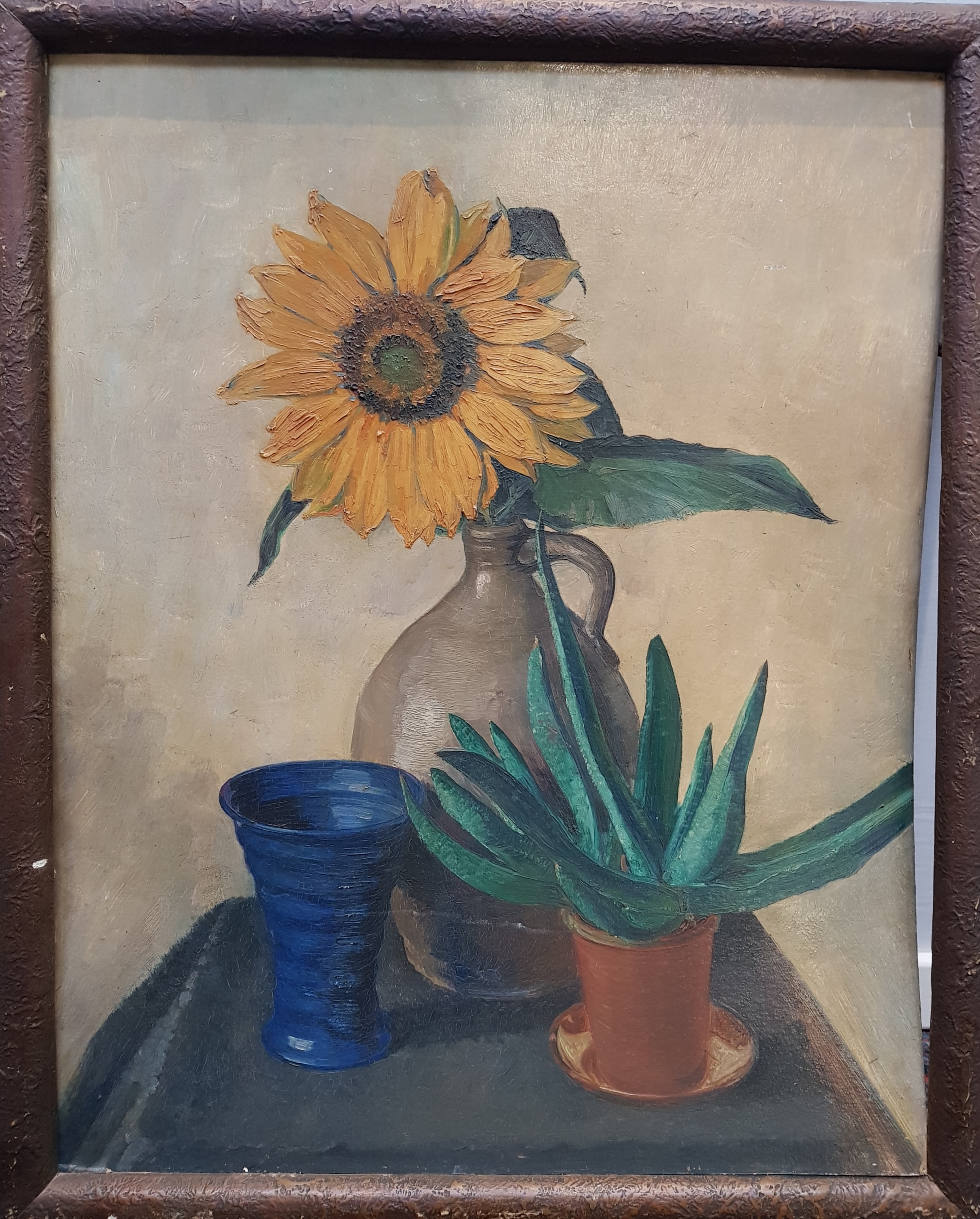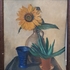 Schilderij van bloemstilleven met zonnebloem in kruik, vetplant en blauwe vaas, olieverfschilderij op karton. Anoniem, midden 20e eeuw. |