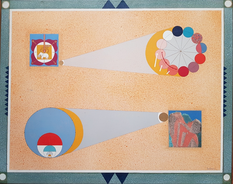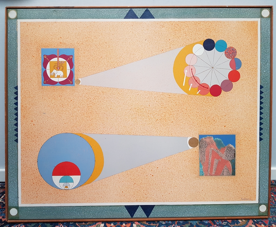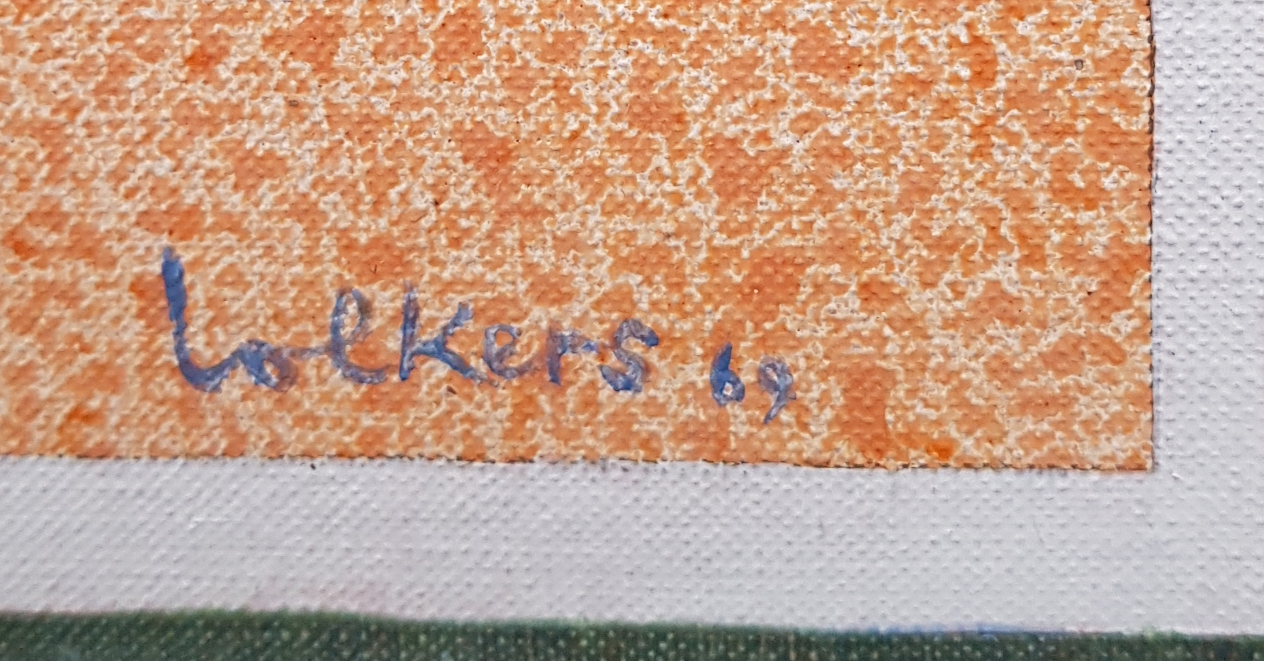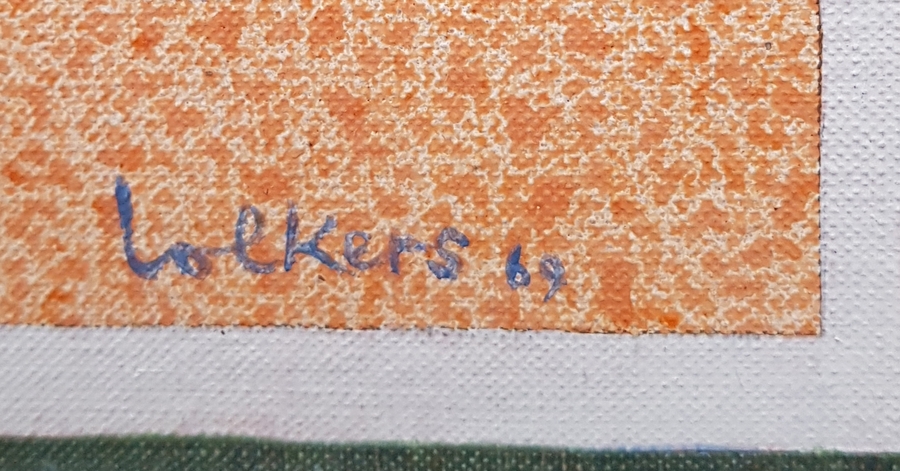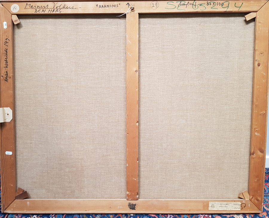 Schilderij getiteld “Naamloos” door Meinert Volkers (1927-2000), olieverfschilderij op linnen. Rechtsonder gesigneerd Volkers en gedateerd 1969. Verso informatie. |