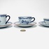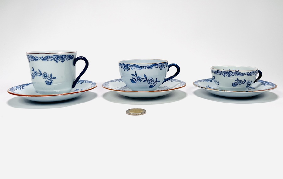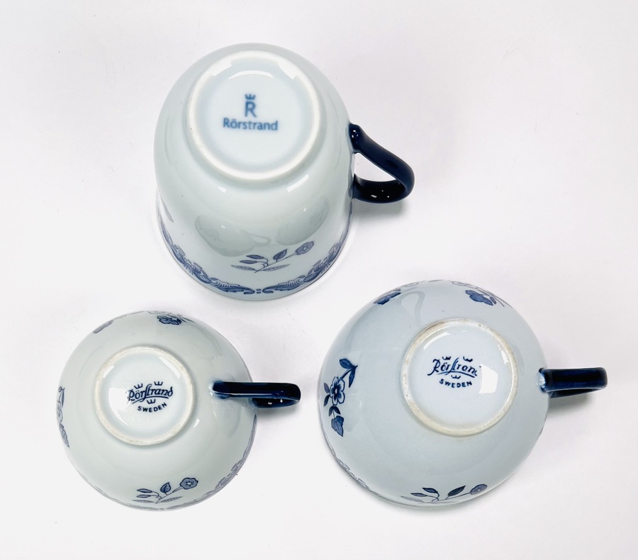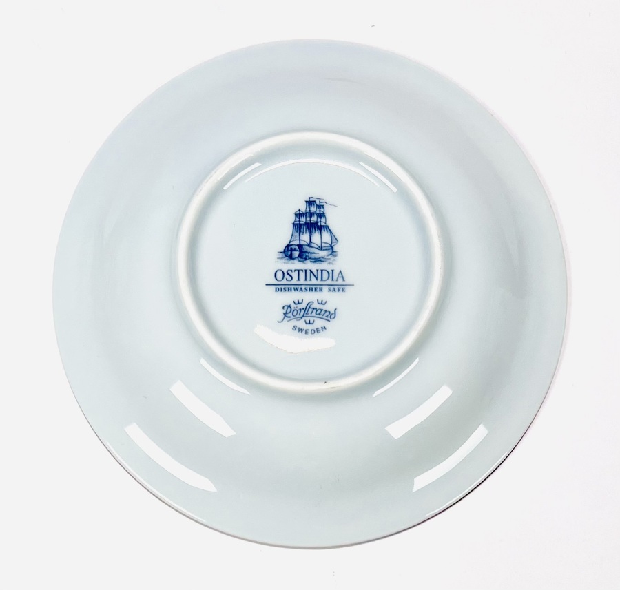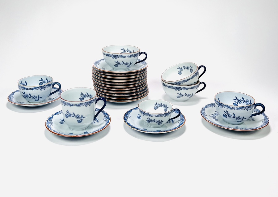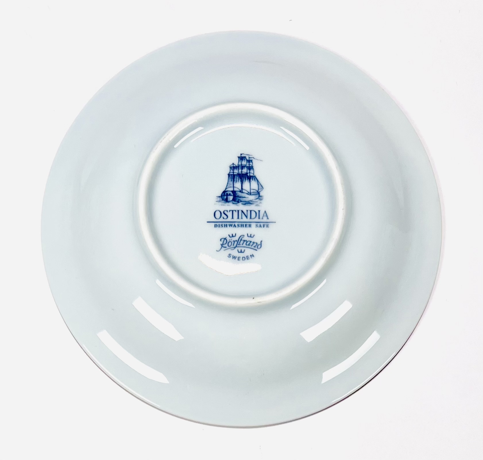 Porseleinen kop-en-schotels, decornaam Ostindia, Rörstrand. Vijftien schotels en zeven kopjes, aan de onderzijde gemerkt. Zweden, 20e eeuw. |