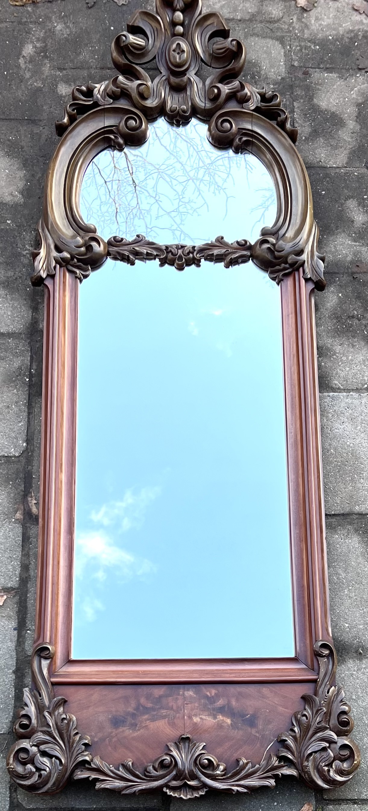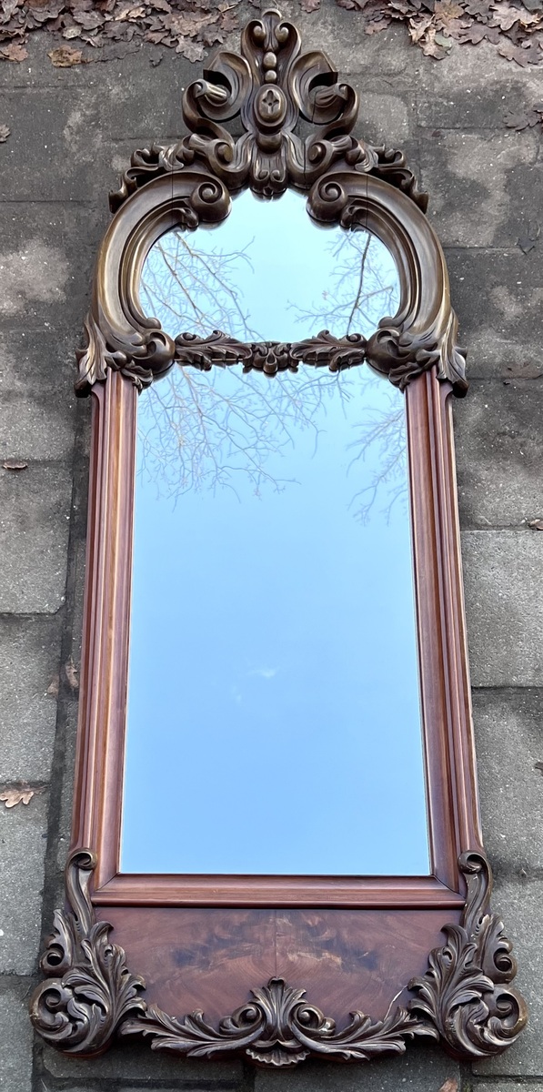 Mahoniehouten spiegel met botanisch gedecoreerde kuif en onderzijde. Eind 19e eeuw. |