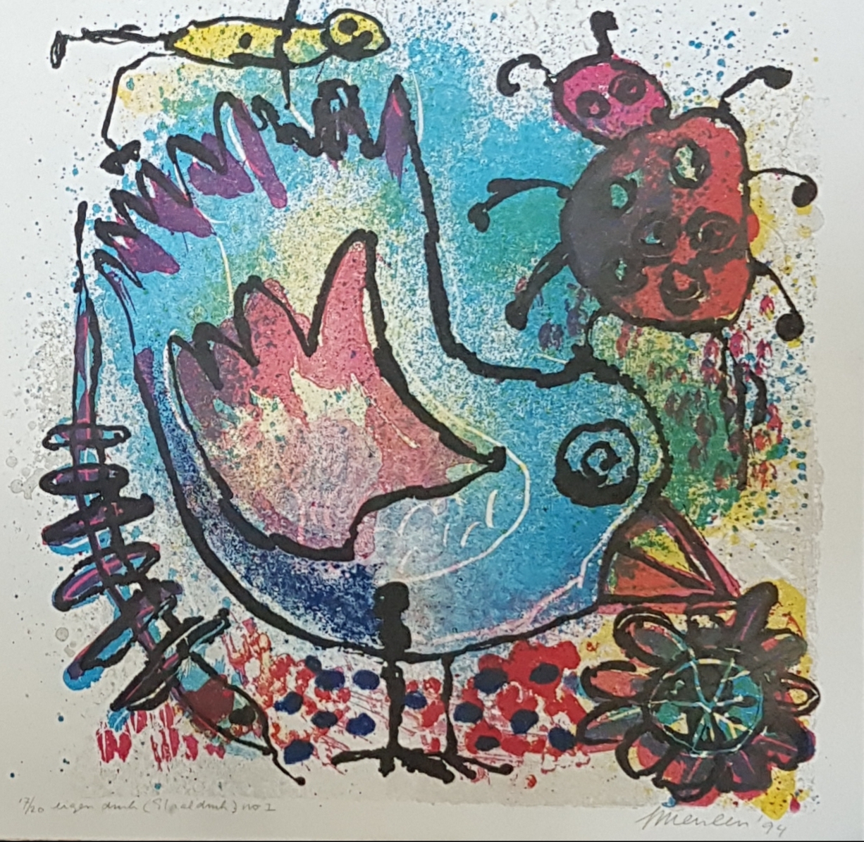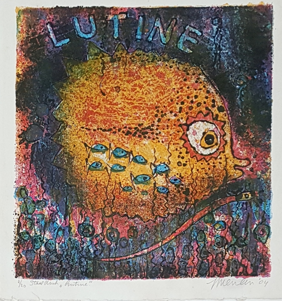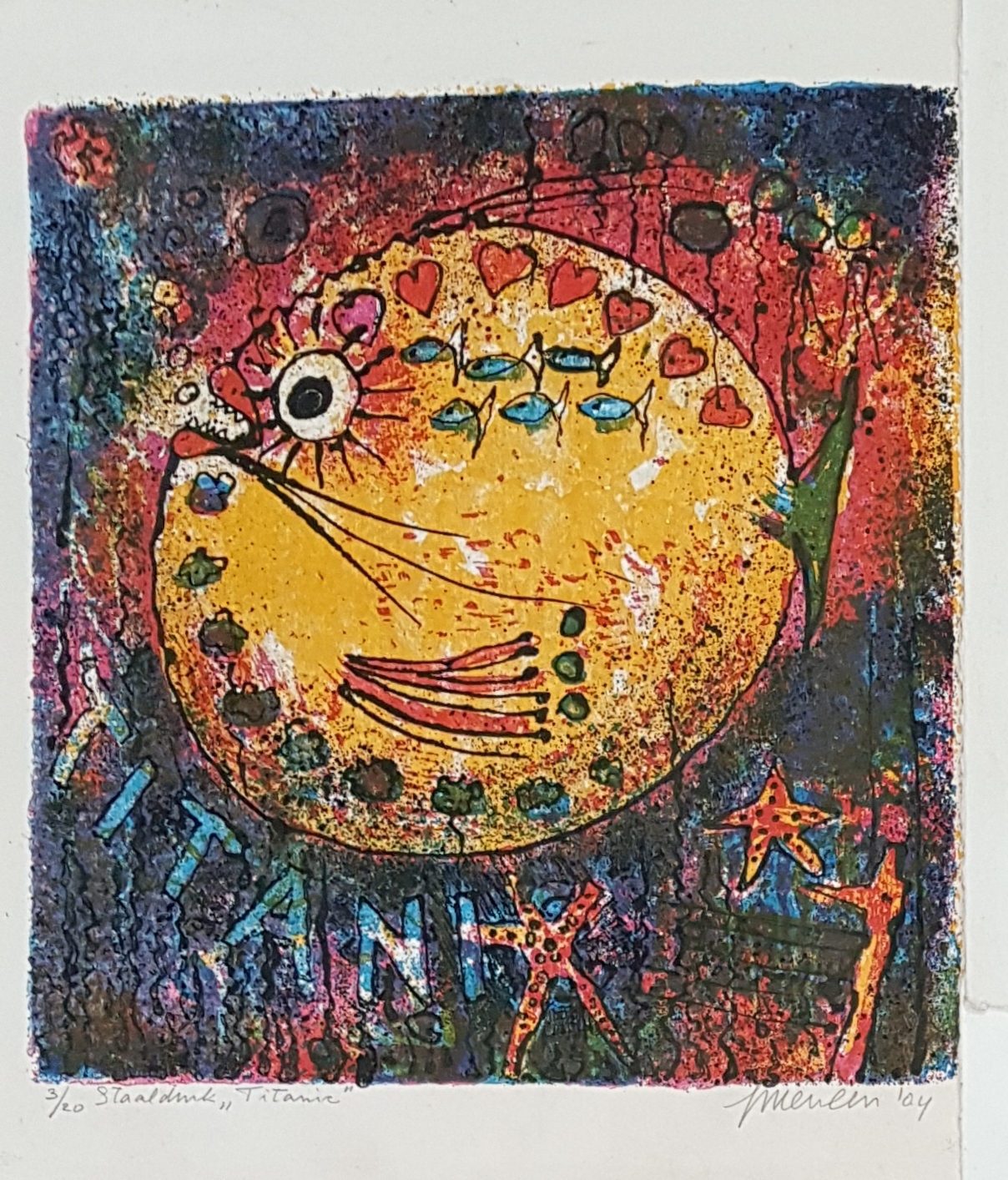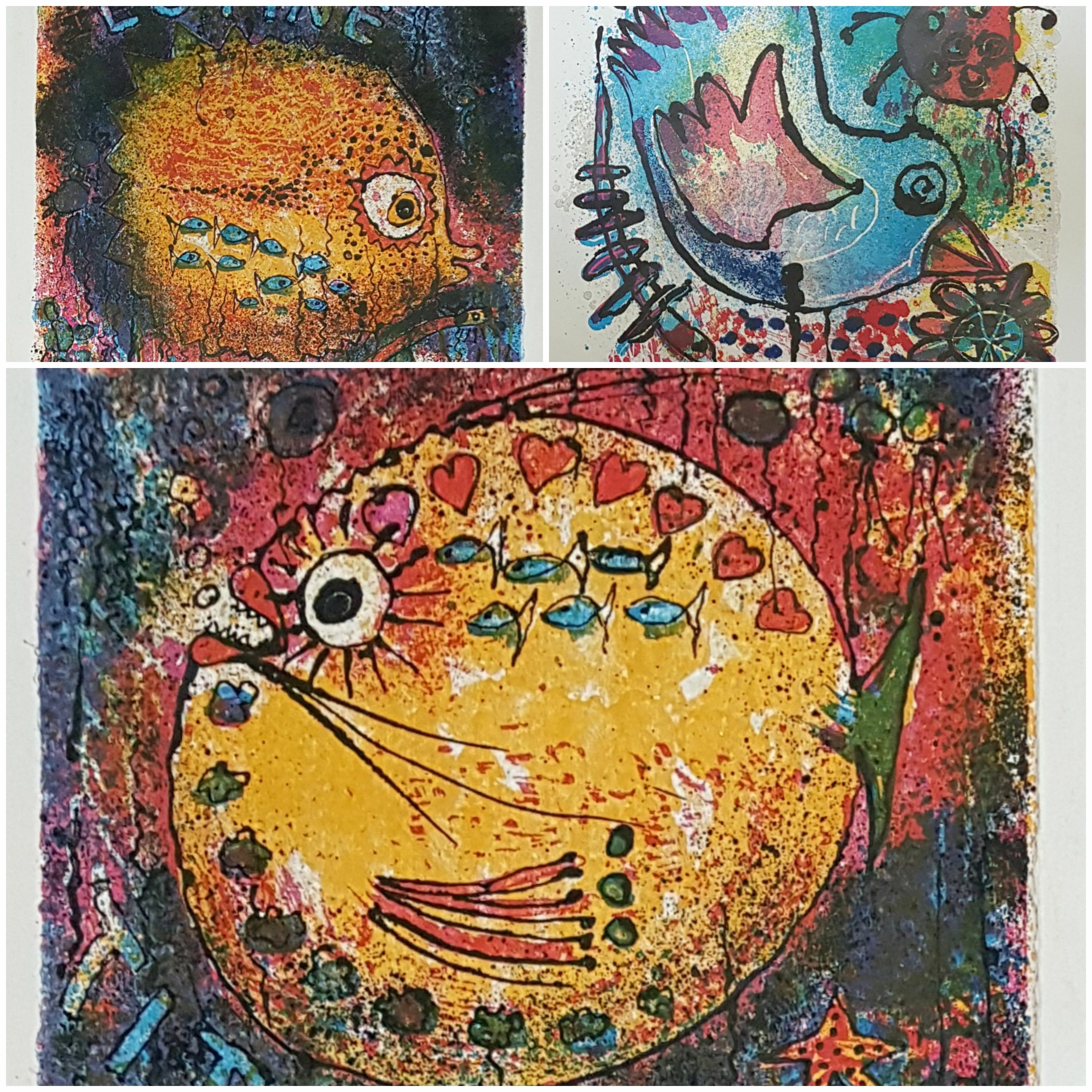 Drie staaldrukken met vissen en kip door Jan van der Meulen (1935). Rechtsonder gesigneerd en gedateerd 1994 en 2004. |