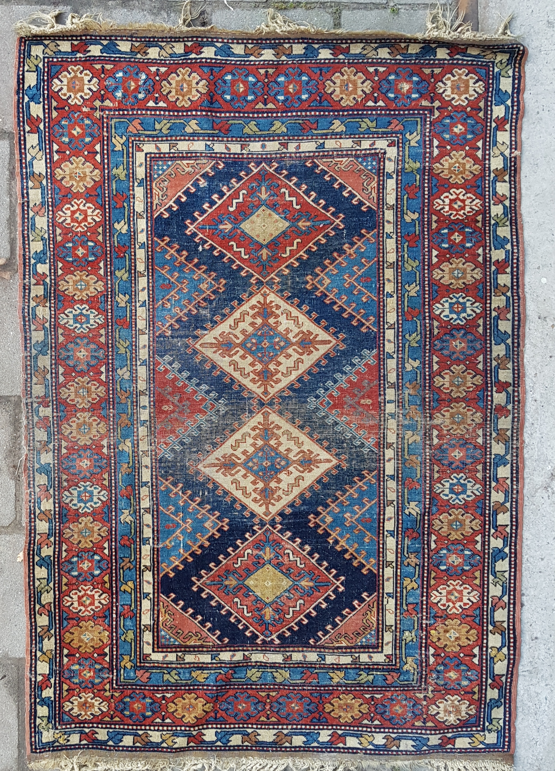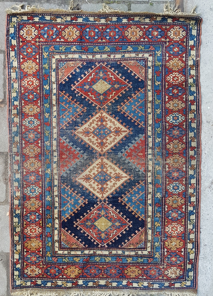 Handgeknoopt wollen Perzisch tapijt uit de eerste helft van de 20e eeuw in Kaukasische stijl, uitgevoerd in geometrische patronen met ruitvormige medaillons in rood, indigo en ivoor. Het tapijt is vervaardigd uit wol op katoenen ketting met natuurlijke kleurstoffen. Eerst dit tapijt zien voordat je biedt? Bezoek onze kijkdagen op 29, 30 en 31 augustus van 11:00 tot 17:00 uur! |