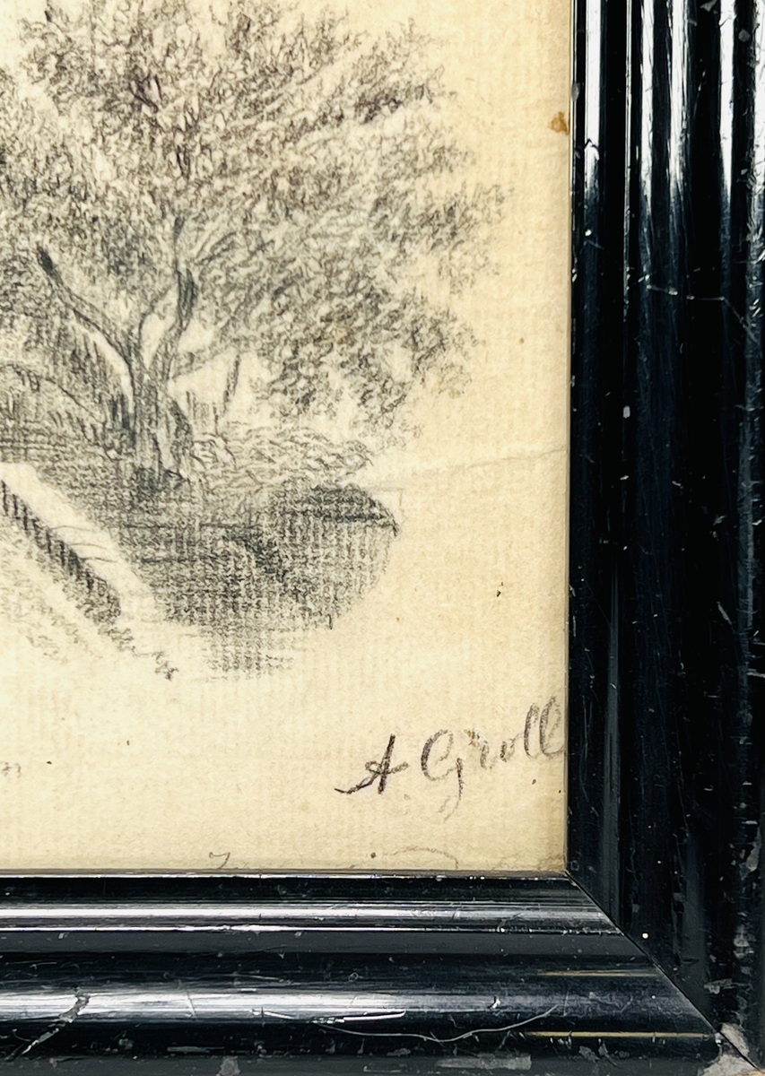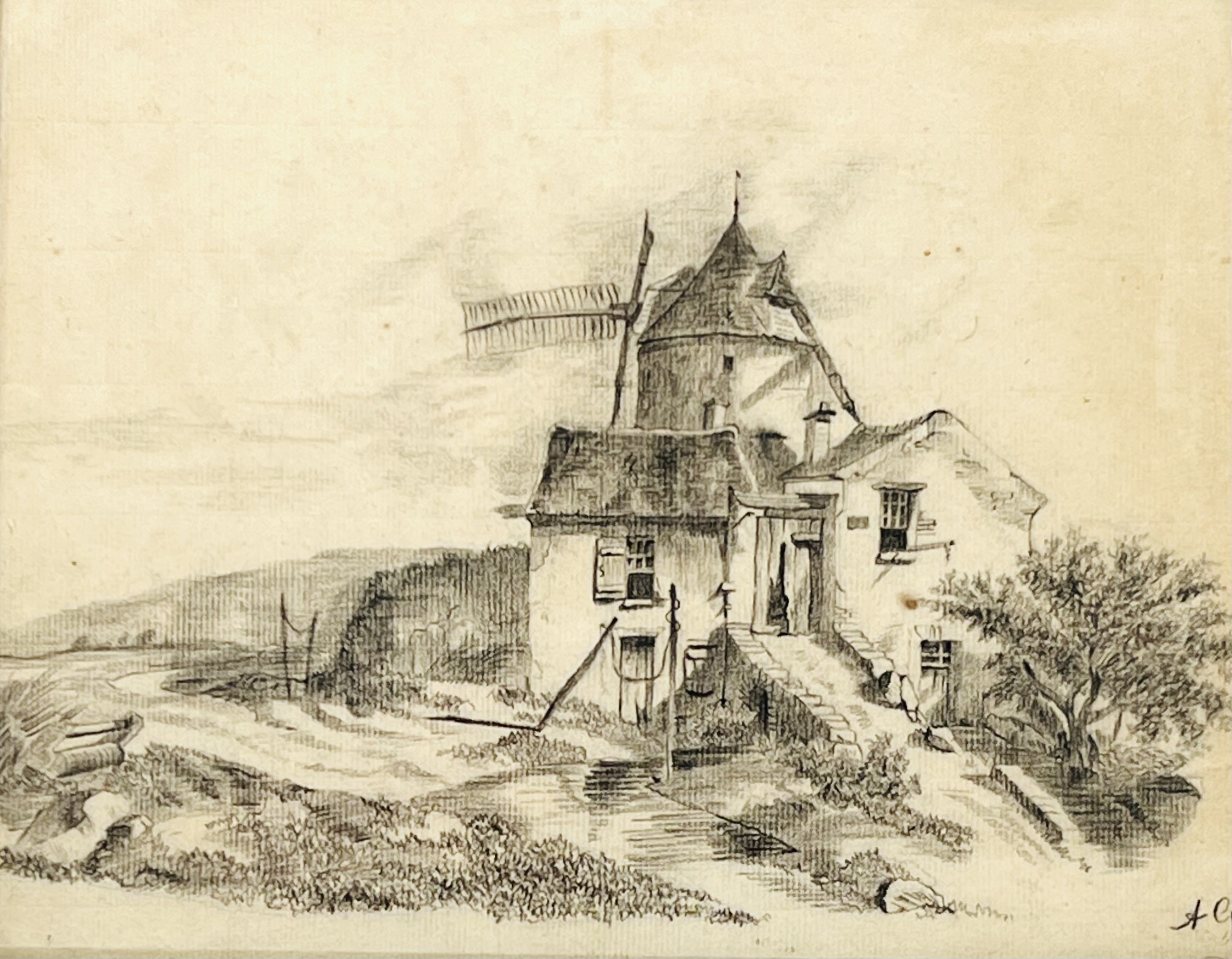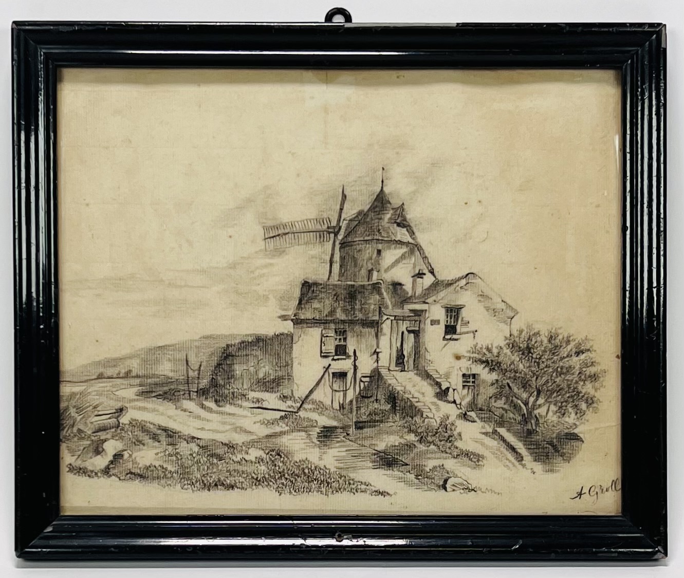 Tekening van een Zuid-Europese bebouwing met molen door A. Groll. Rechtsonder gesigneerd, eerste helft 20e eeuw. |