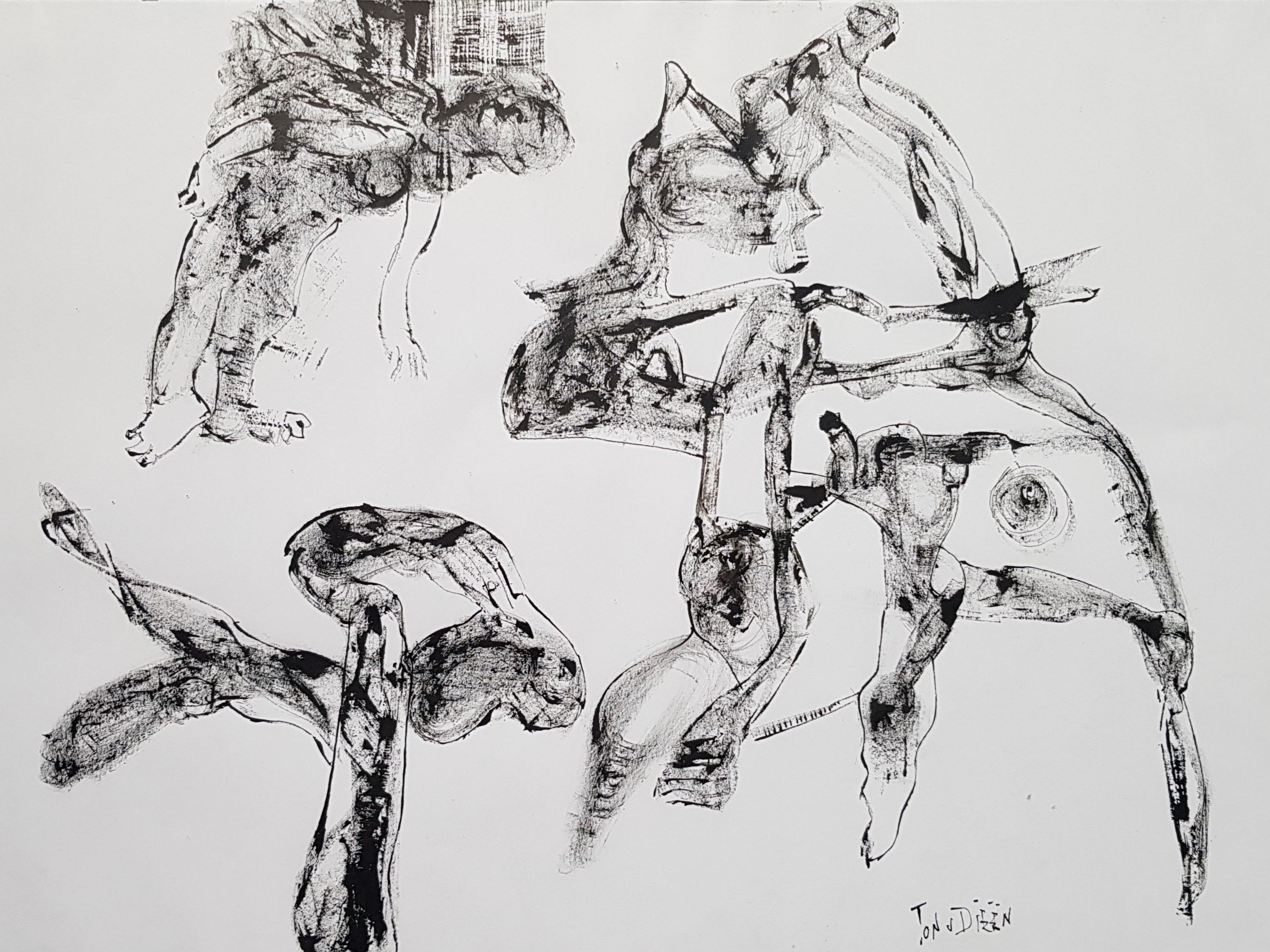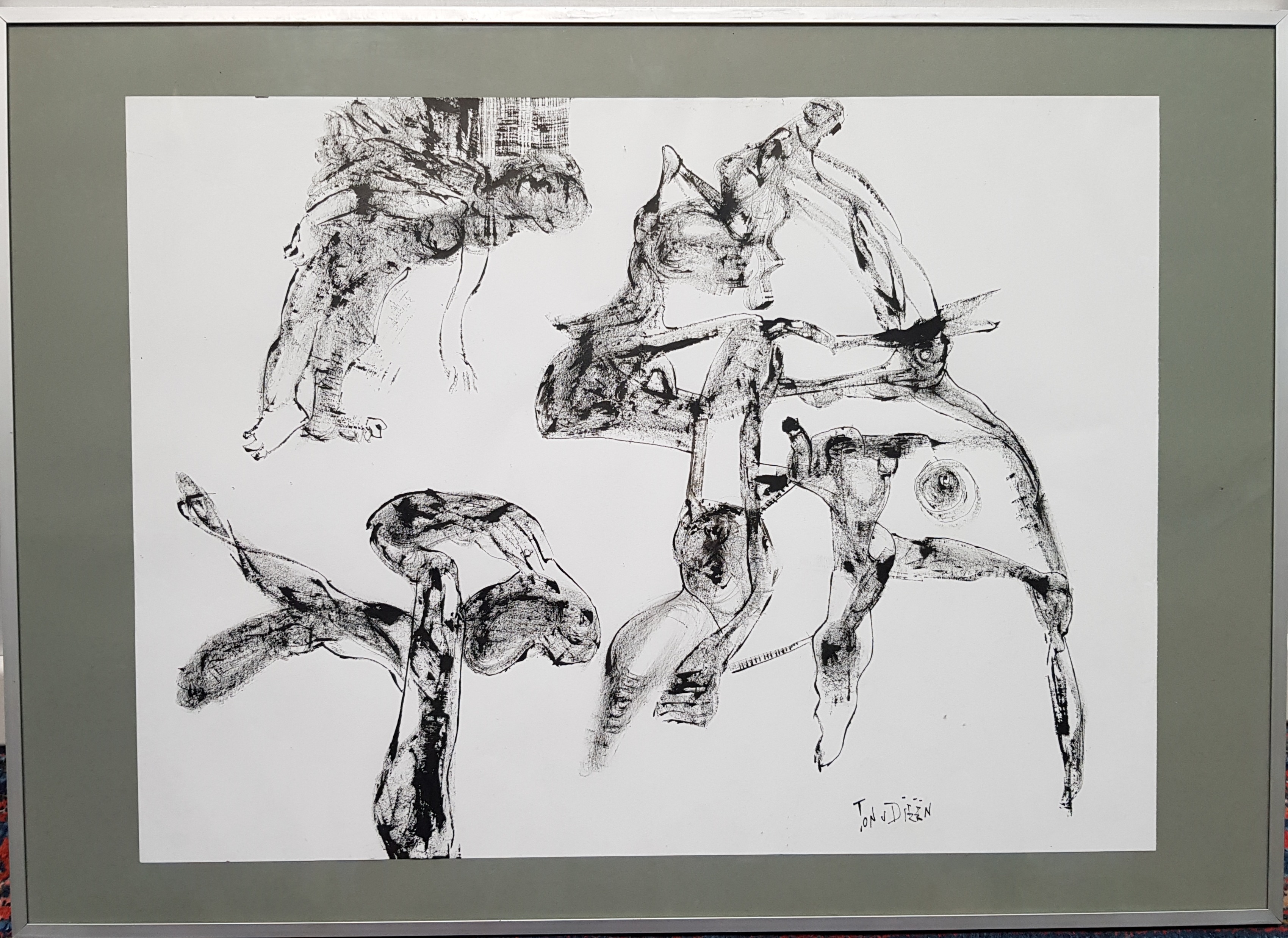 Tekening met abstracte voorstelling van menselijke figuren door Ton van Dieën (1937). Rechtsonder gesigneerd Ton van Dieën, vierde kwart 20e eeuw. |