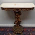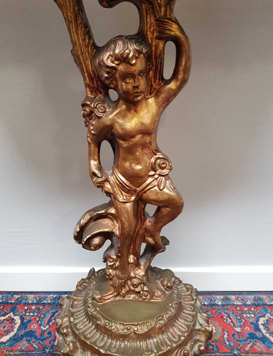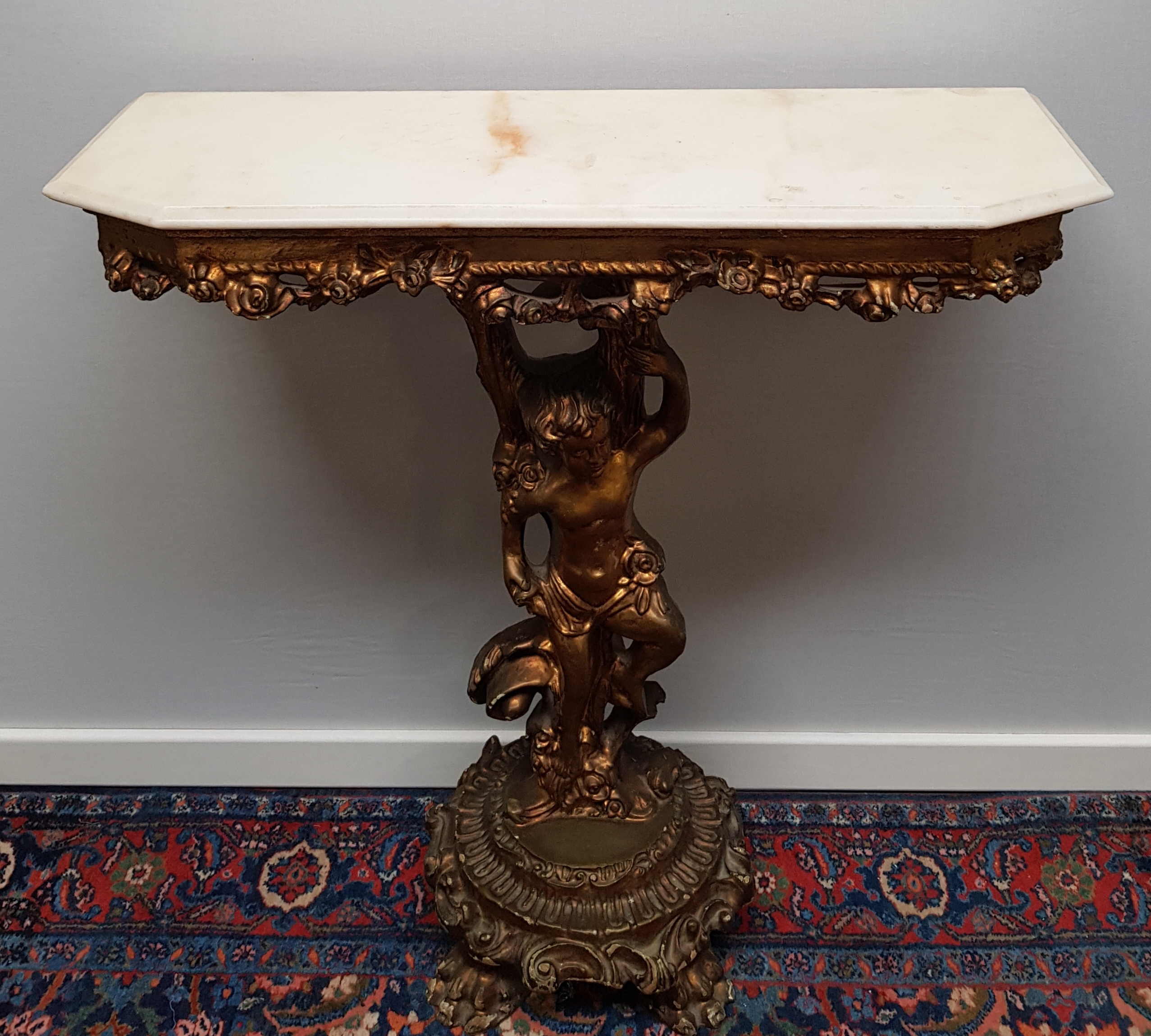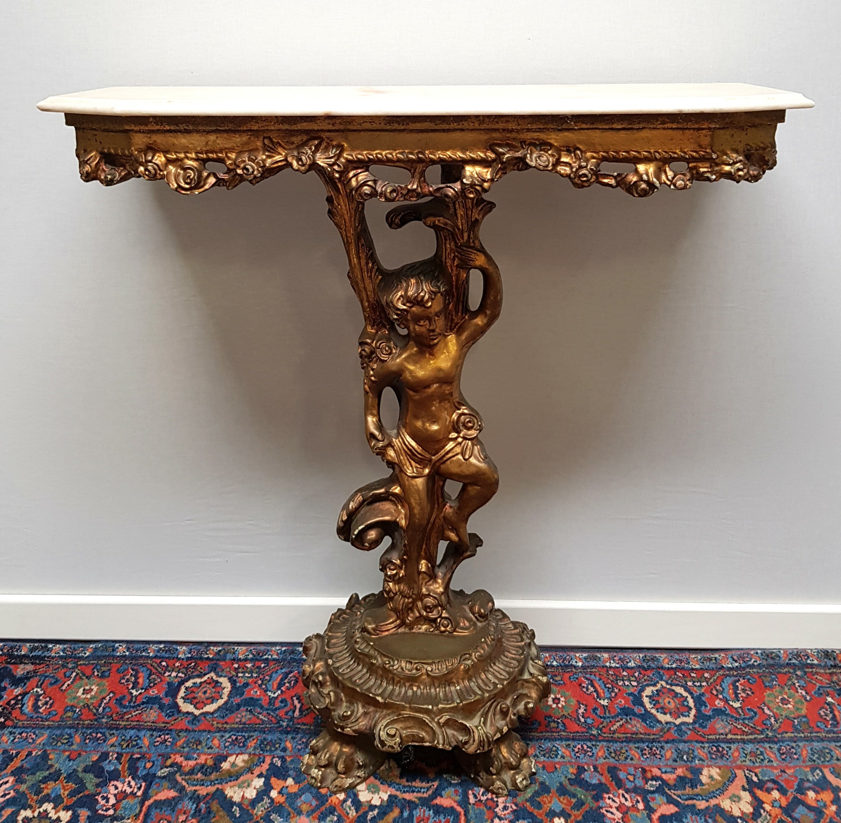 Houtcomposieten wandtafel gedecoreerd met cherubijn en voorzien marmeren bovenblad. Jaren 70. |