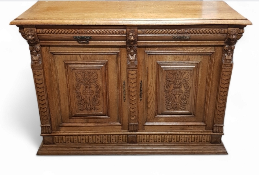 Eikenhouten dressoir rijkelijk versierd met leeuwenkoppen, bustes en florale motieven. Eind 19e eeuw. |