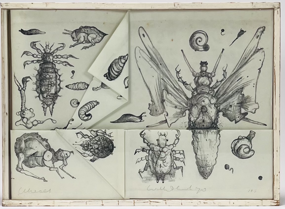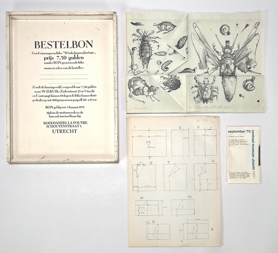 Opvouwbare lithografie in houten kast, met afgebeeld insecten door William D. Kuik (1929-2008). Rechtsonder gesigneerd met potlood en gedateerd 1970, oplagenummer 175. Bijgaand de krant Groot Utrecht uit 1970 met artikel over Kuik en vouwinstructies voor de lithografie. |