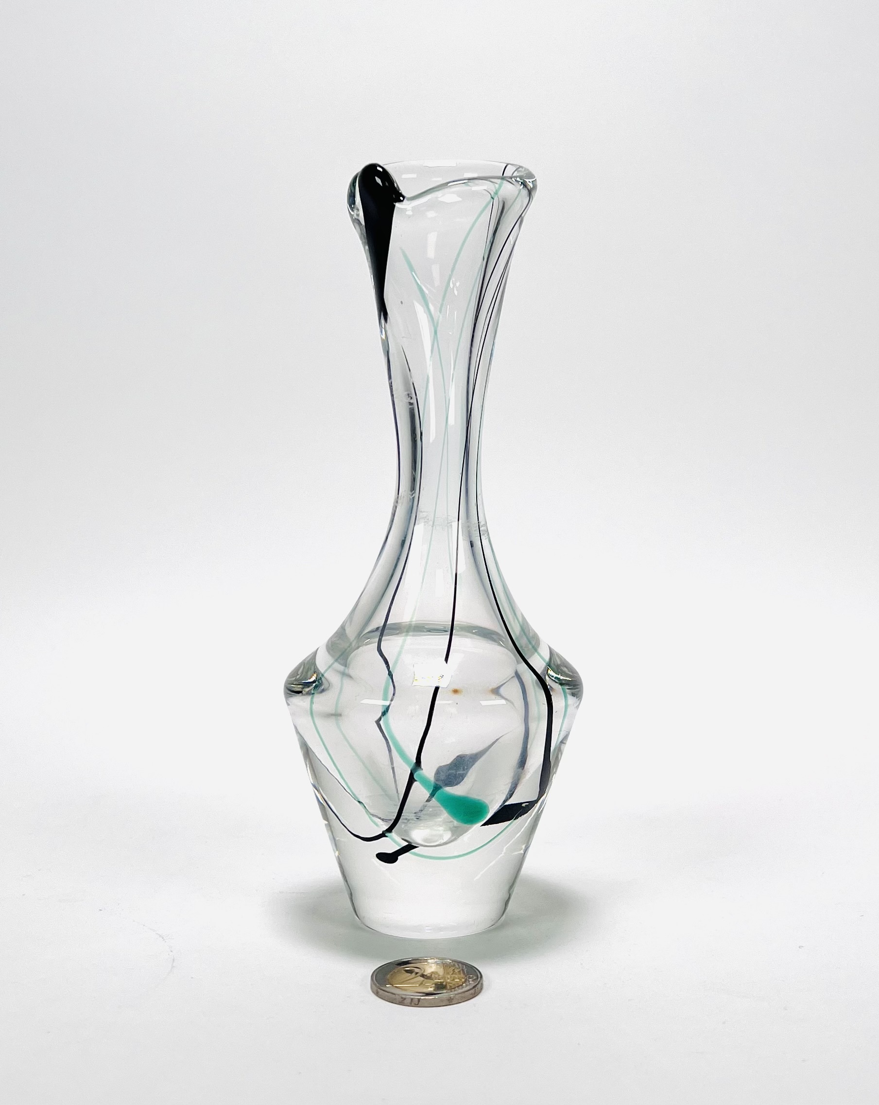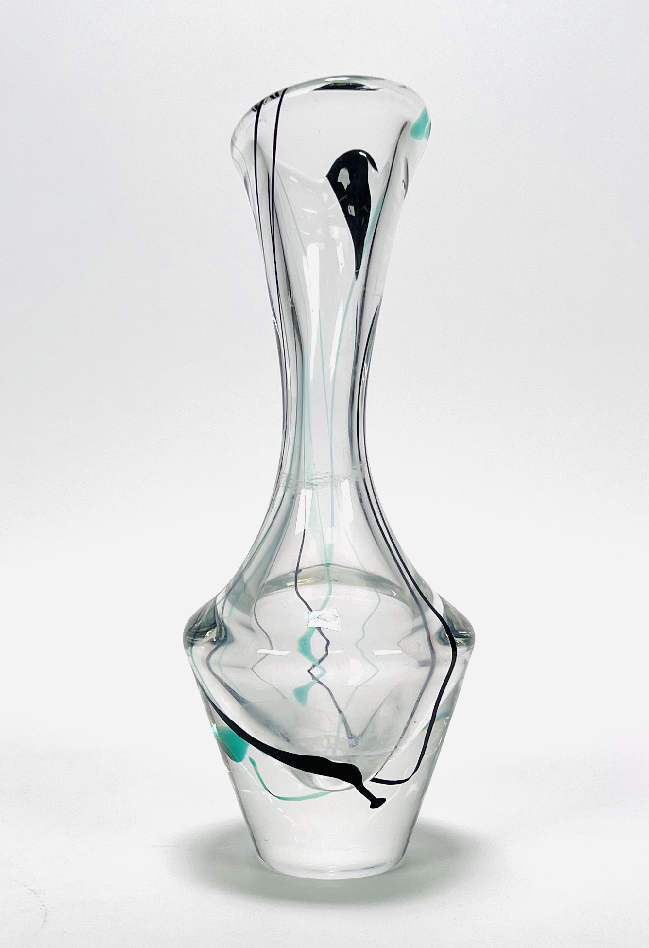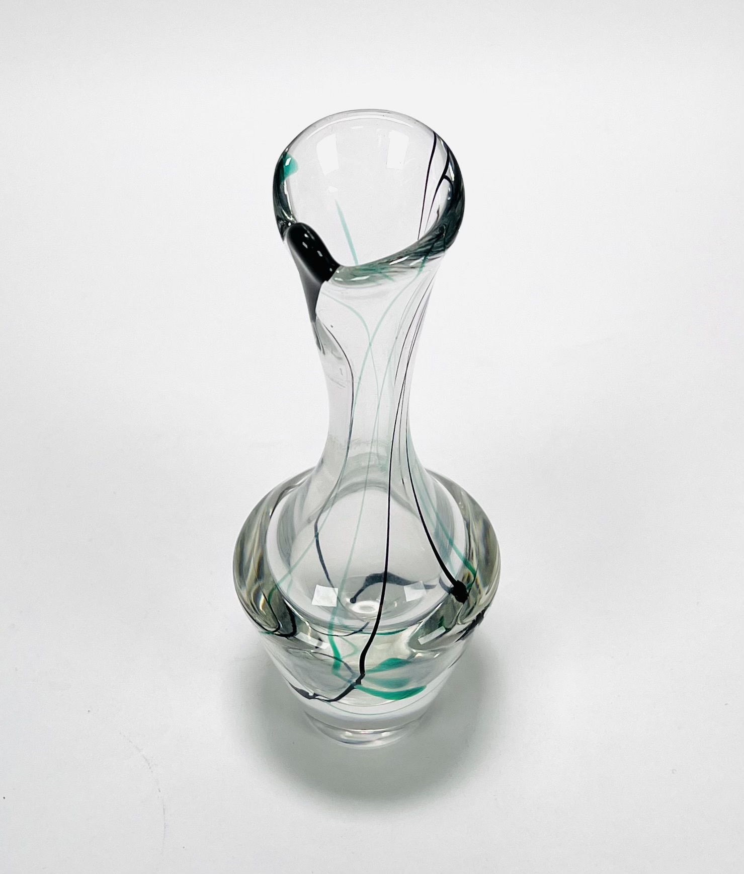 Kristallen Max Verboeket vaas met donkerblauwe- en turquoise glasslierten. Uitgevoerd door de Kristalunie Maastricht, jaren 60. |