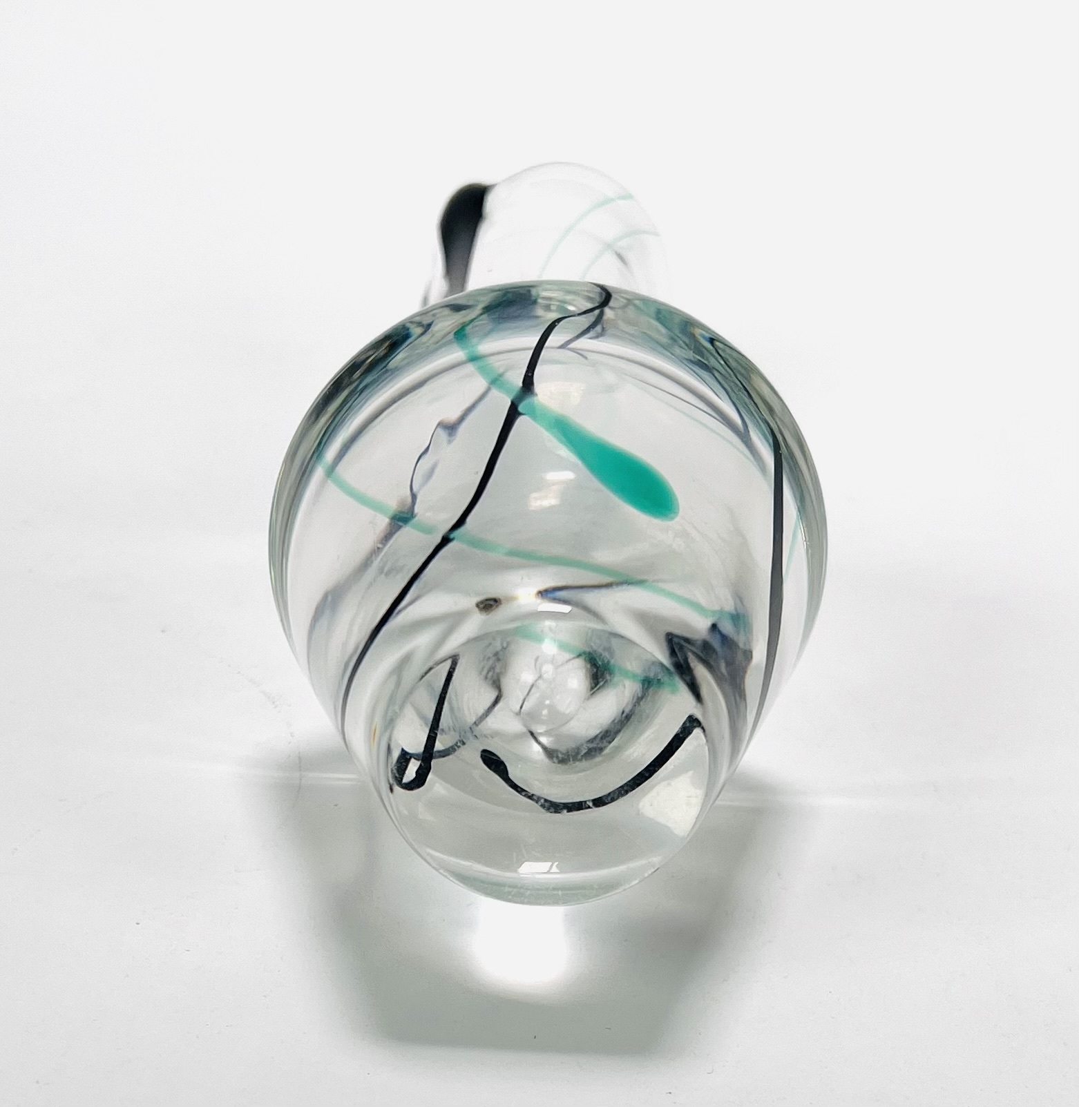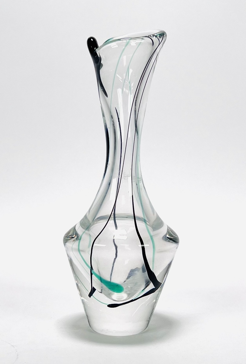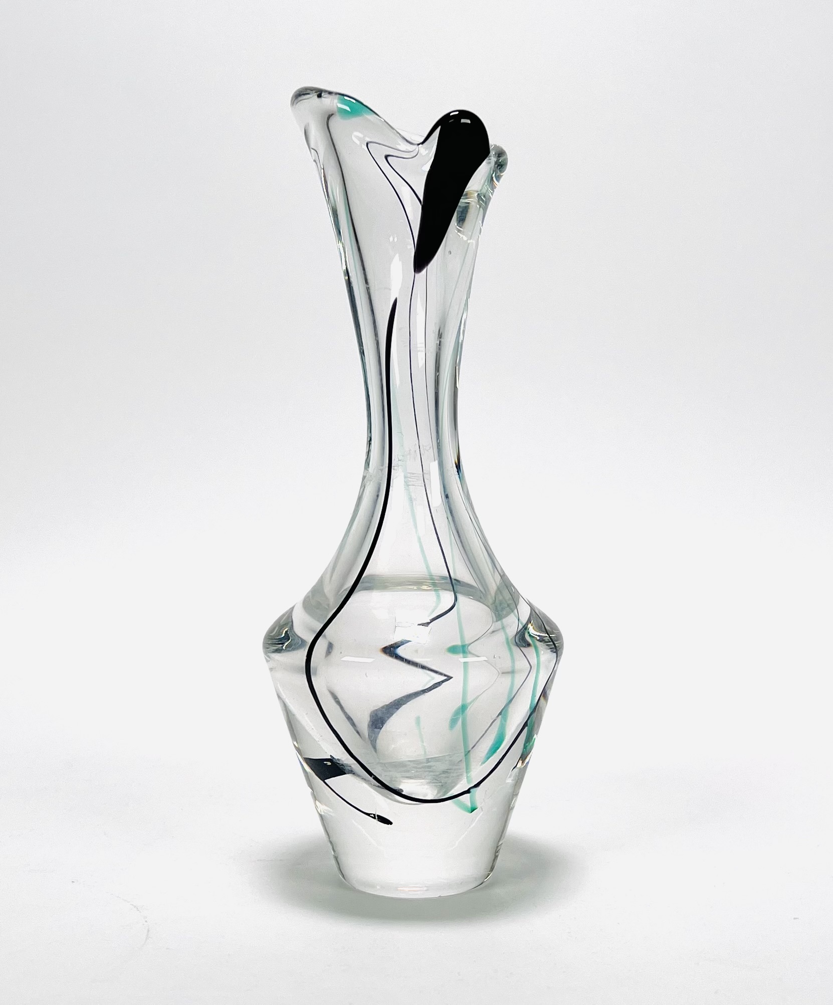Kristallen Max Verboeket vaas met donkerblauwe- en turquoise glasslierten. Uitgevoerd door de Kristalunie Maastricht, jaren 60. |