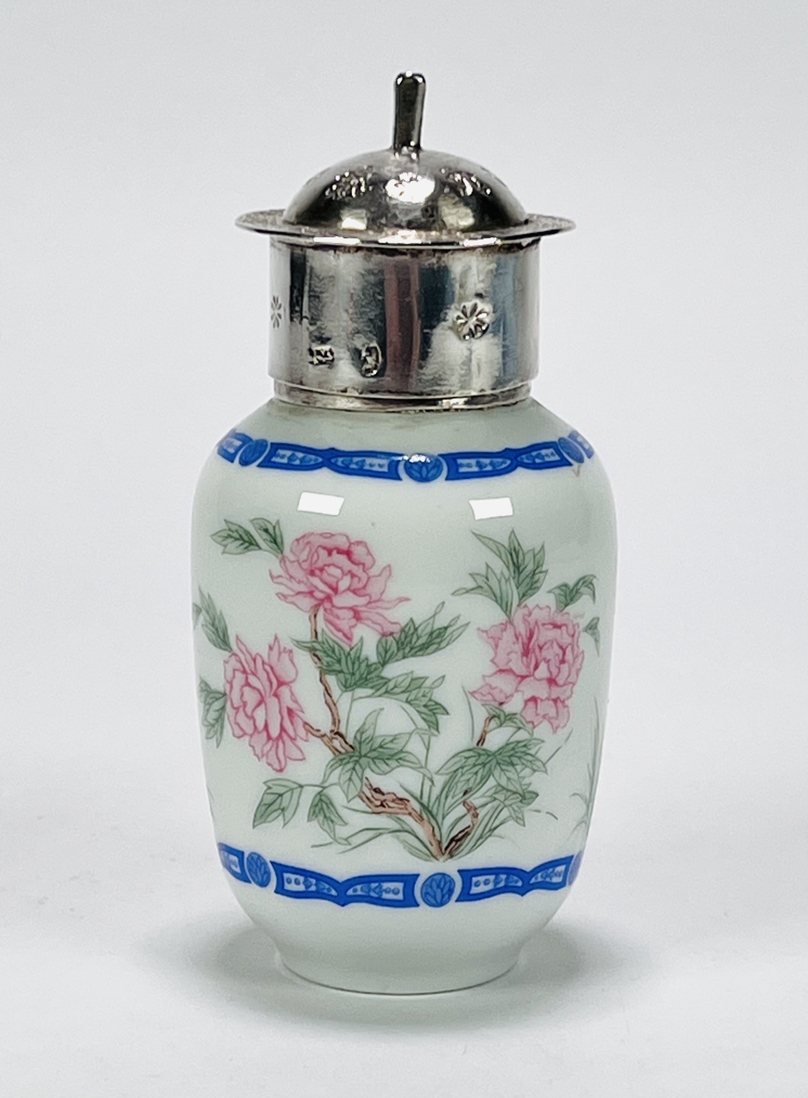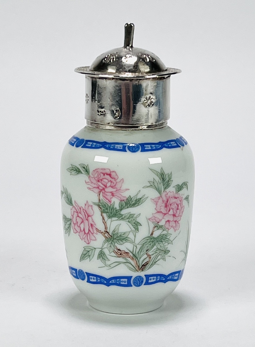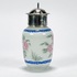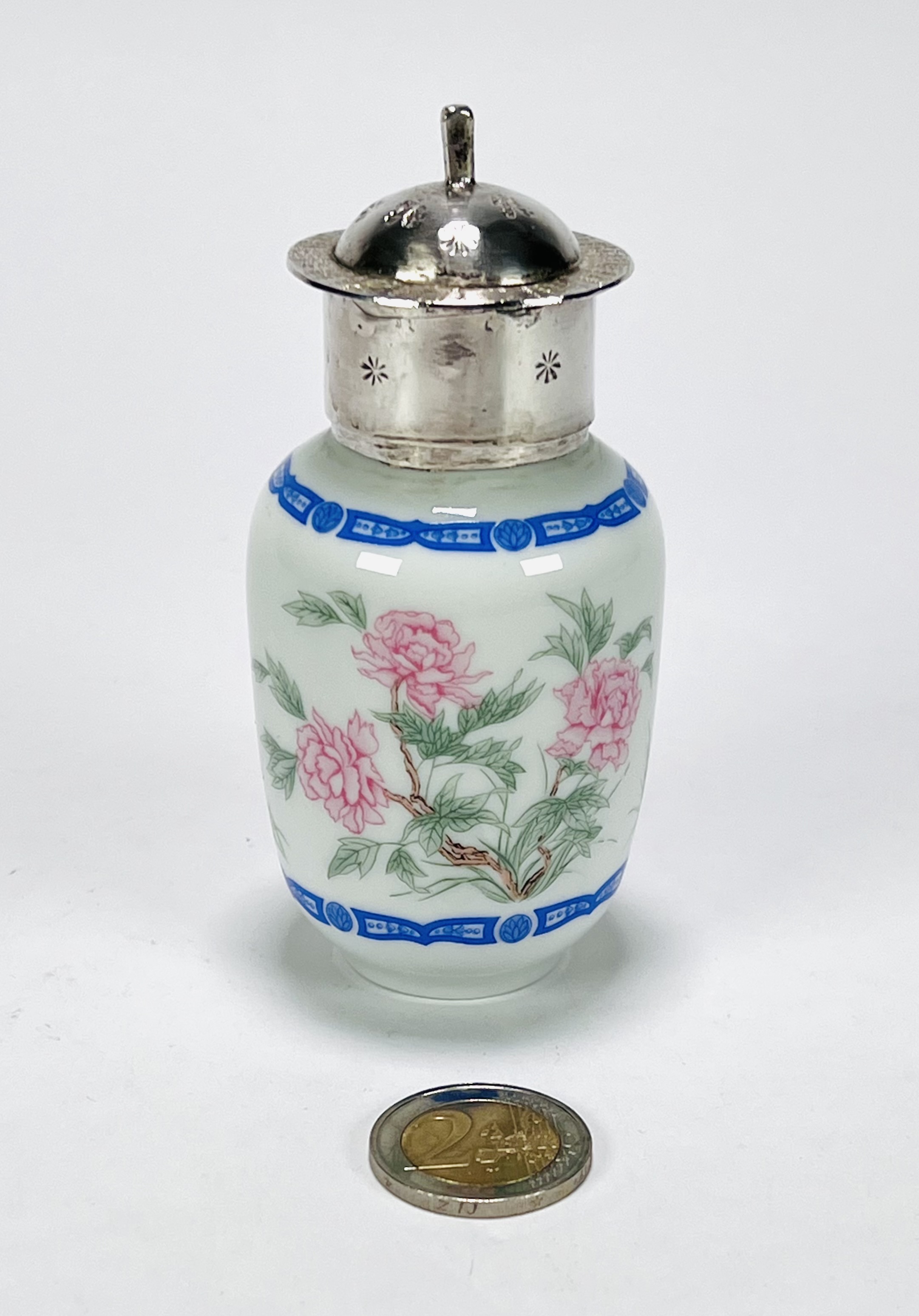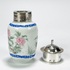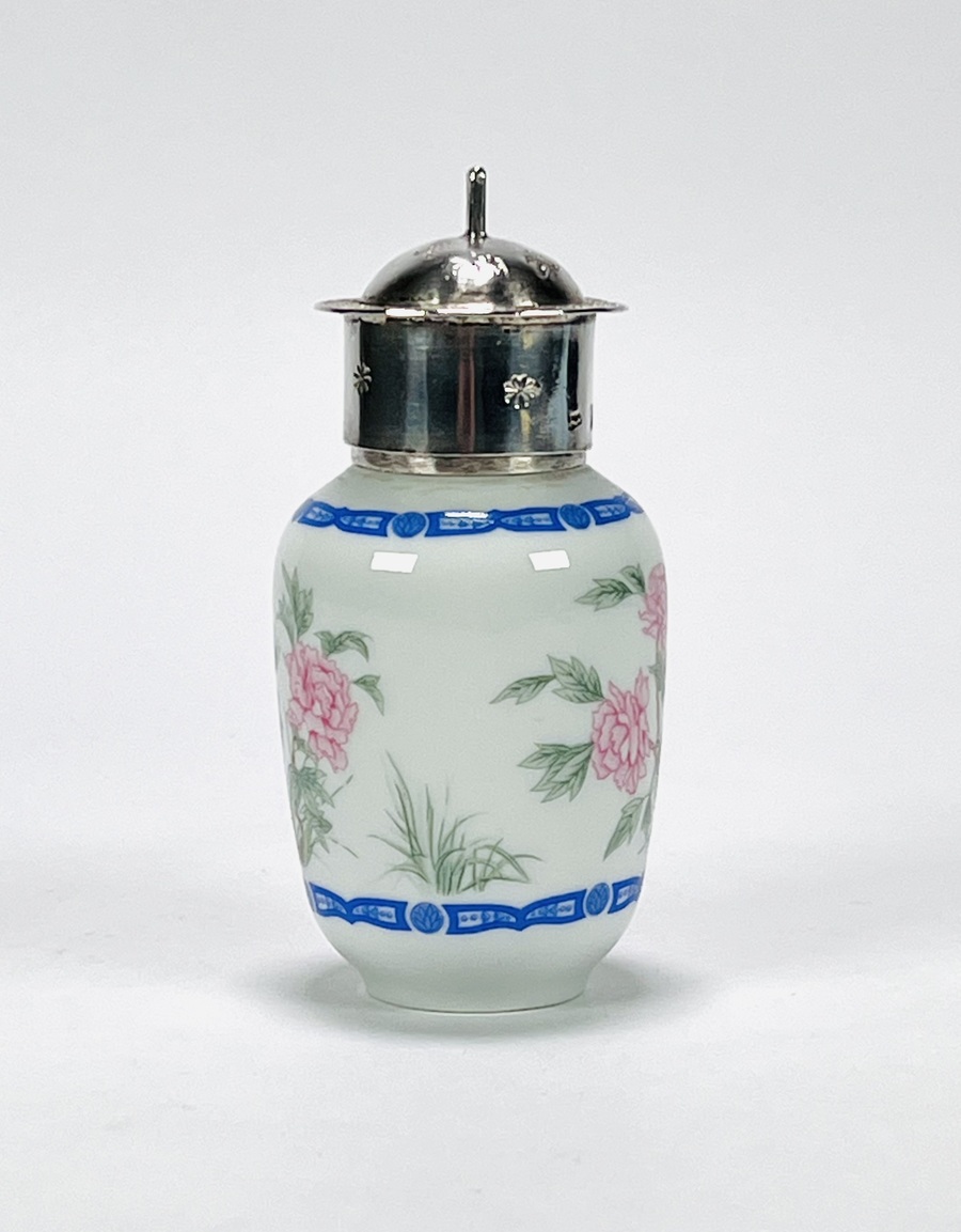 Porseleinen theebus gedecoreerd met floraal decor en voorzien van zilveren montuur en dop. Zilver gekeurd met zwaardje, midden 20e eeuw. |