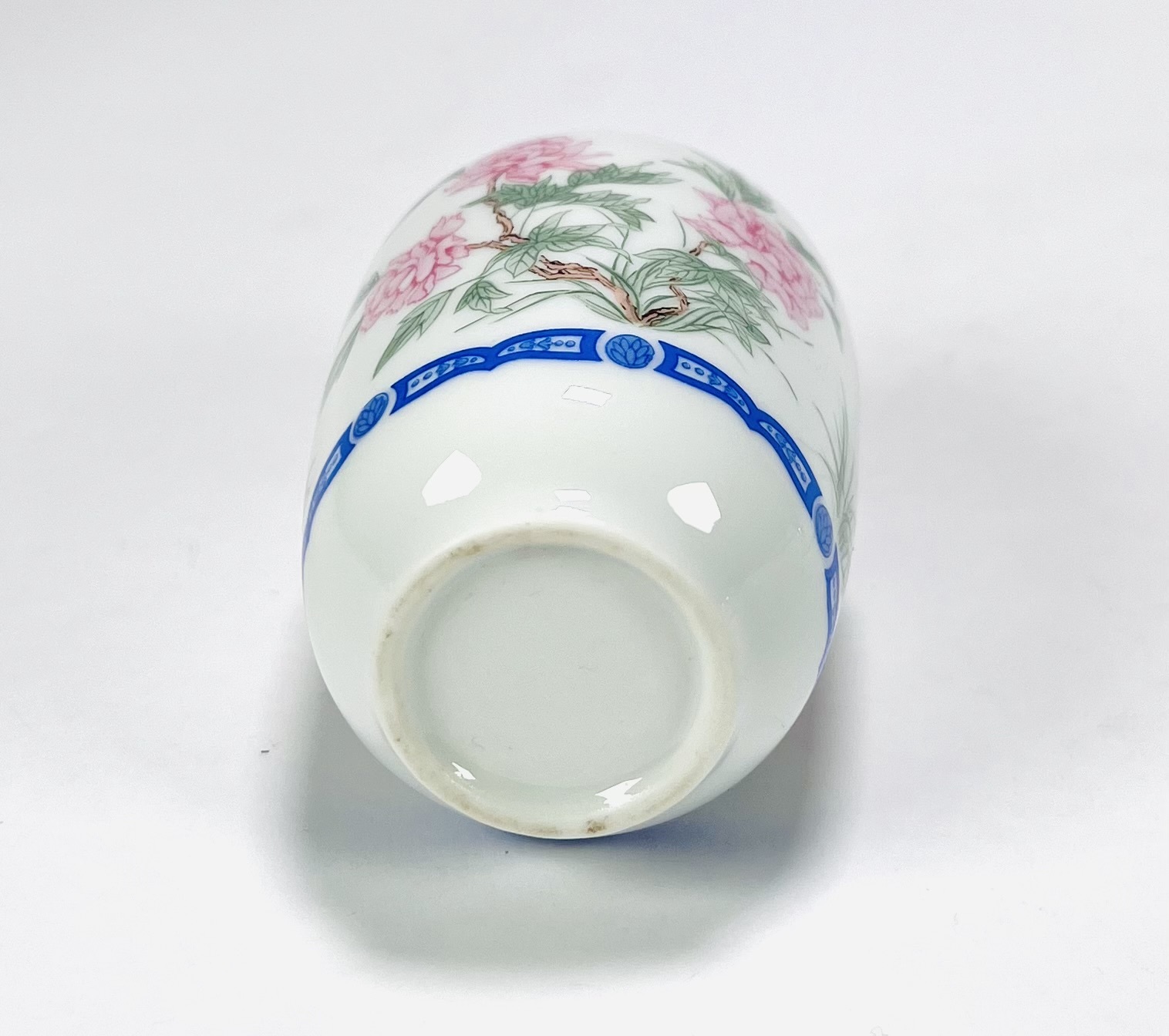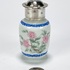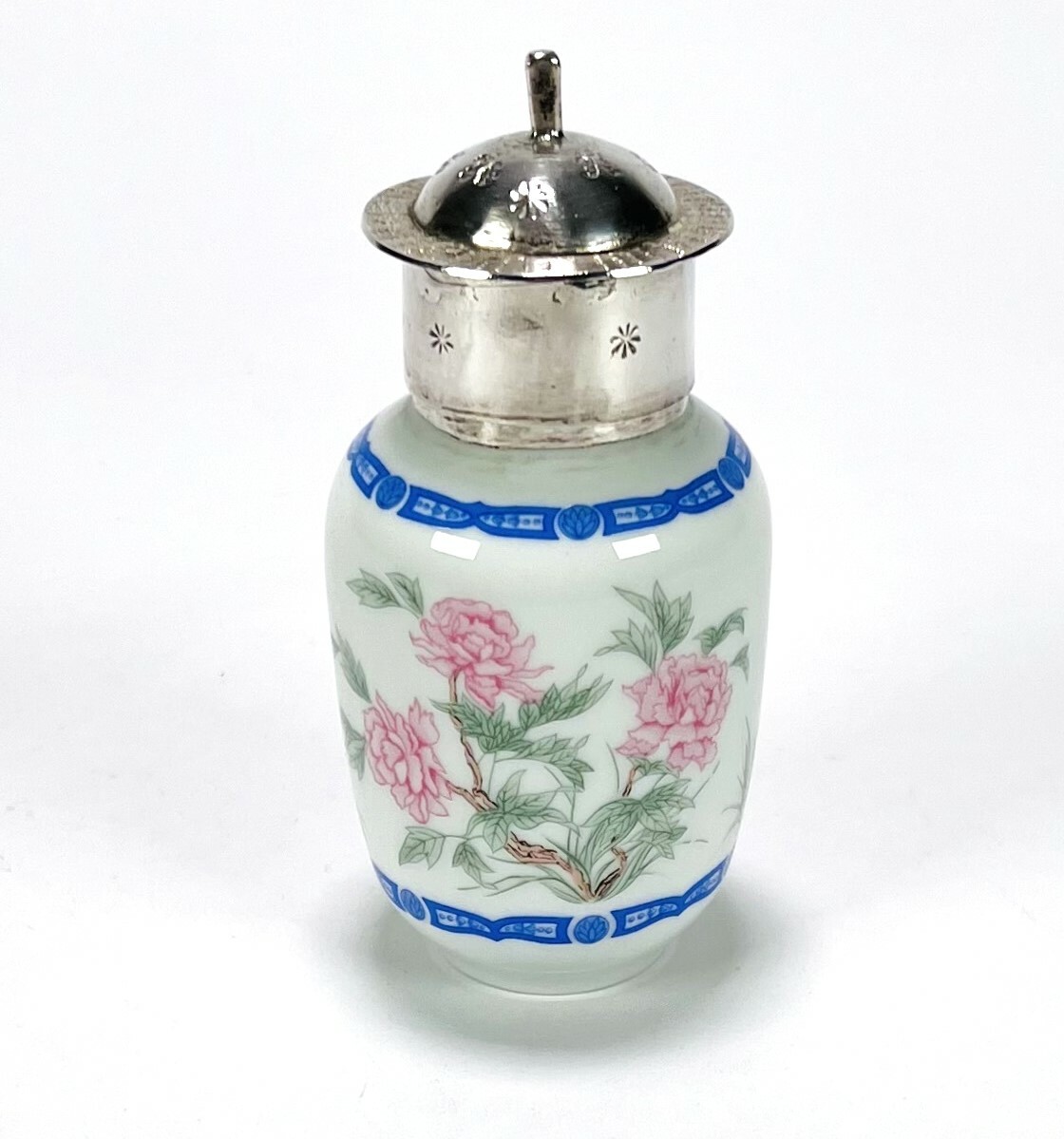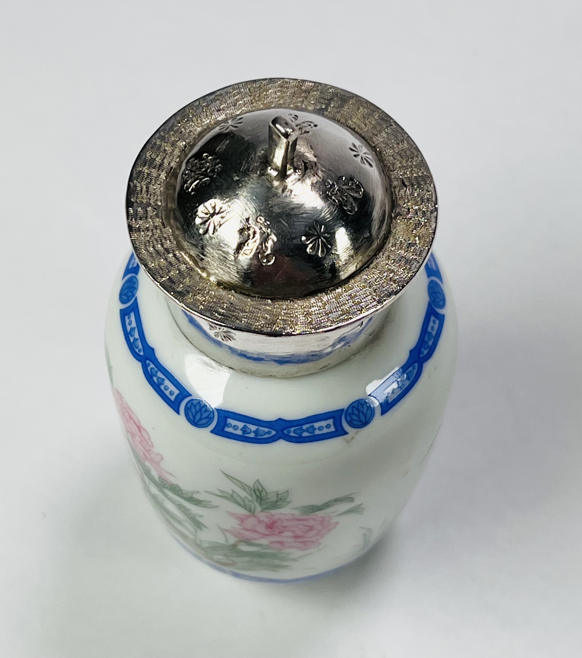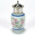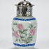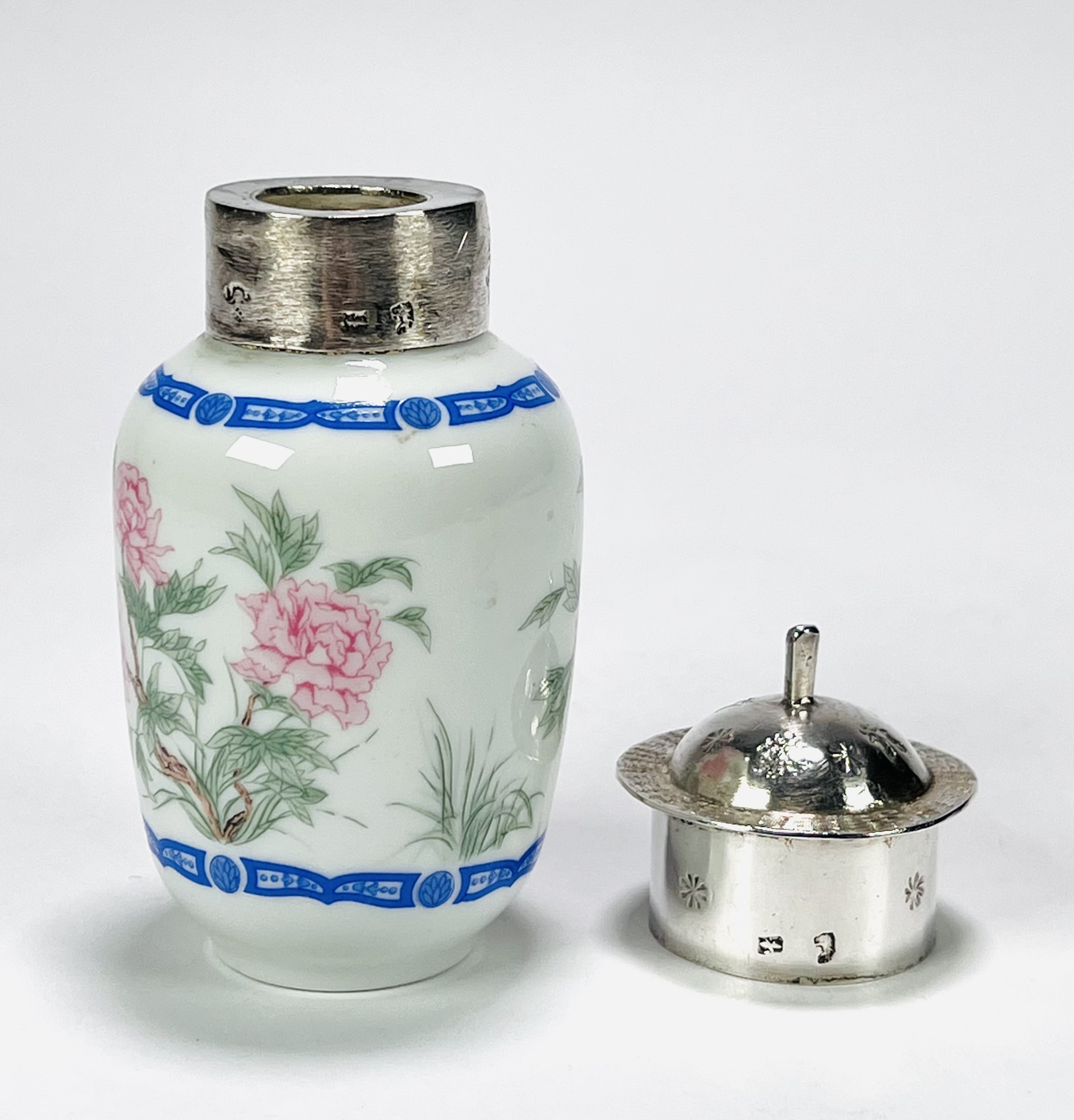Porseleinen theebus gedecoreerd met floraal decor en voorzien van zilveren montuur en dop. Zilver gekeurd met zwaardje, midden 20e eeuw. |