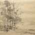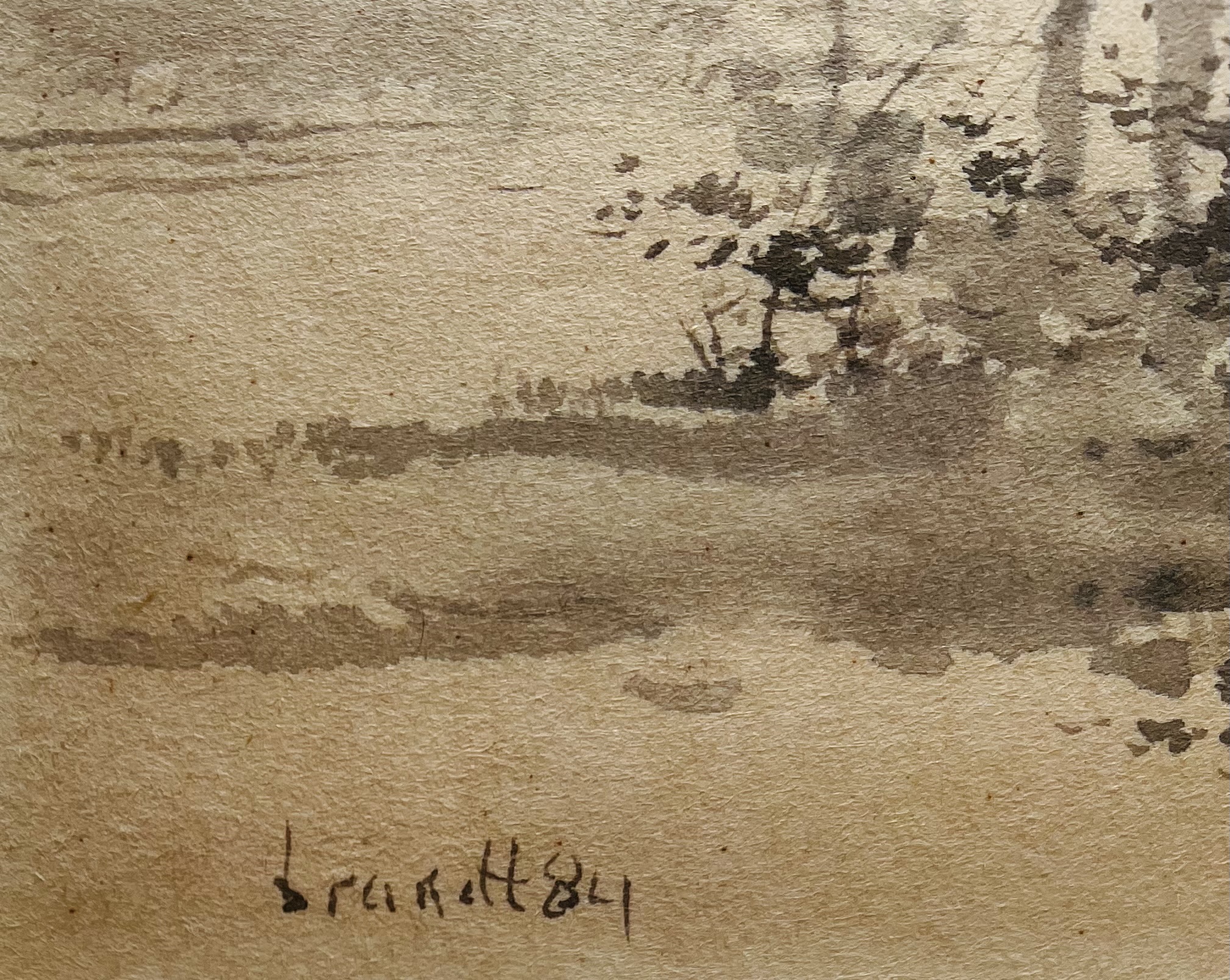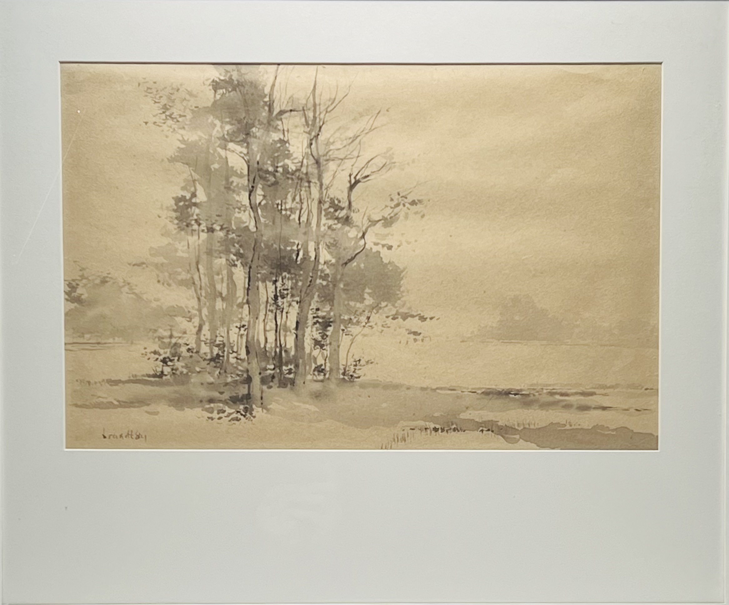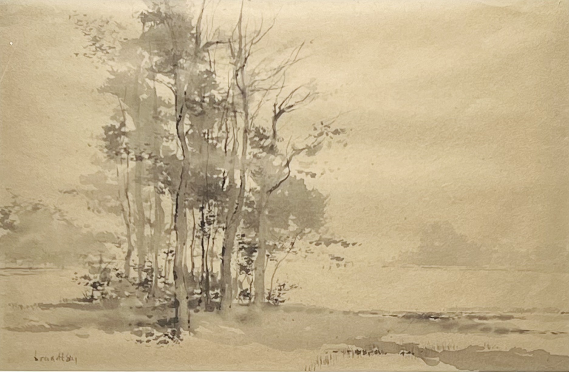 Aquarel op papier met landschappelijke voorstelling en bomenpartij door Edwin Brandt (1942). Linksonder gesigneerd en gedateerd 1984. |