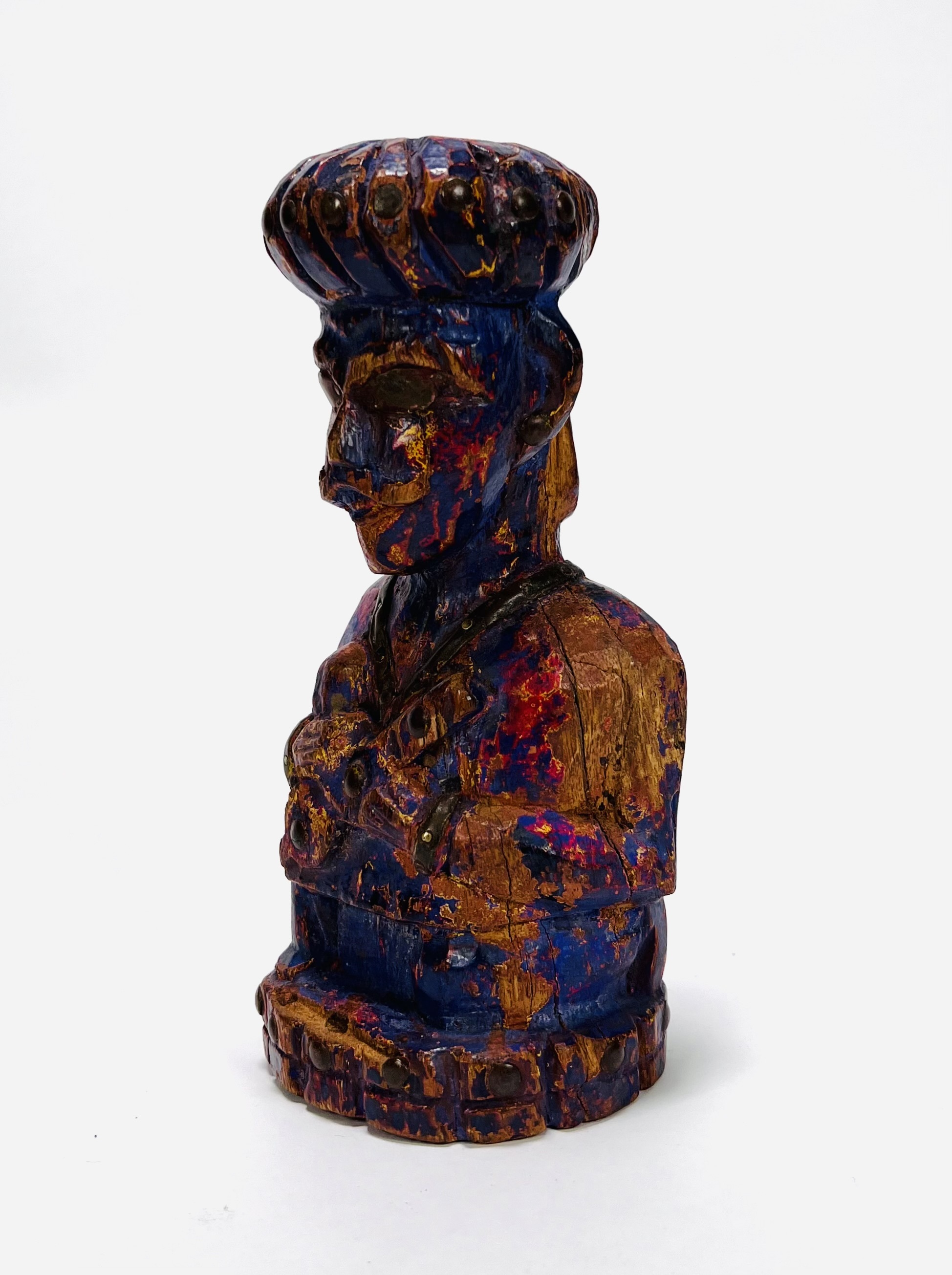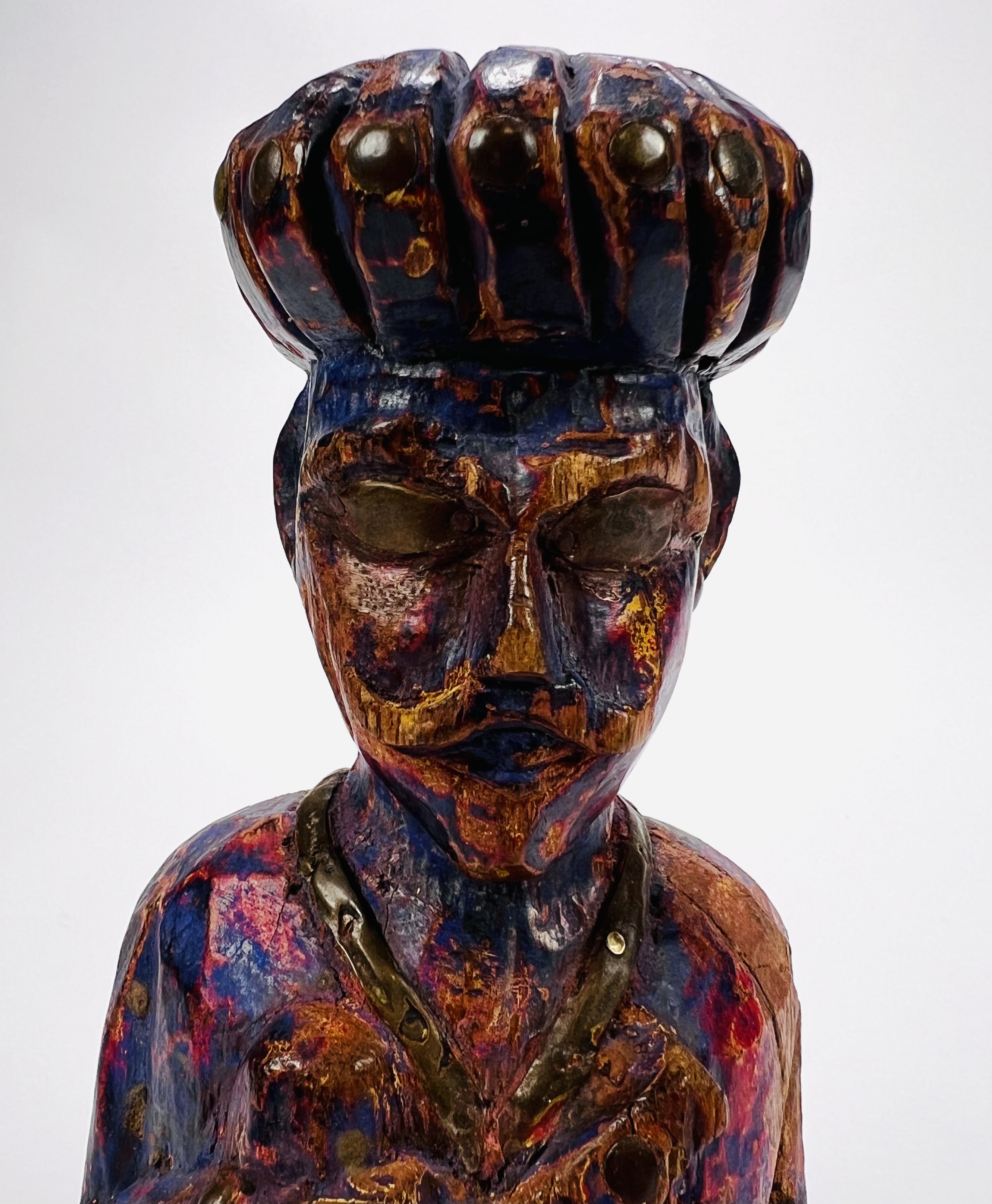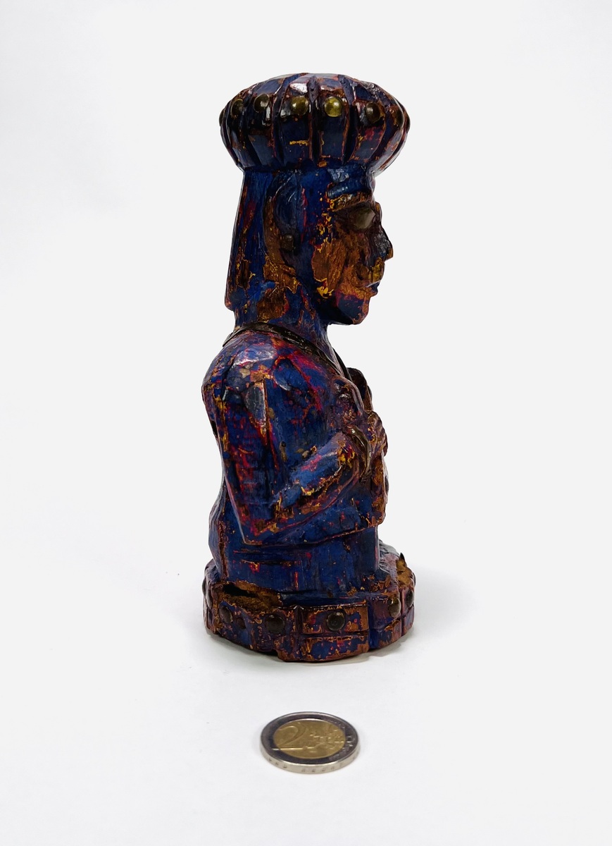 Gestoken houten paars gepatineerd beeld van een oriëntaalse man. Beeld heeft koperen toevoegingen qua ogen, sieraden en overige details. 20e eeuw. |