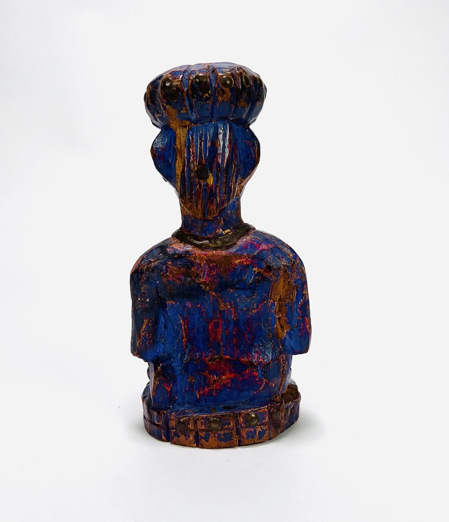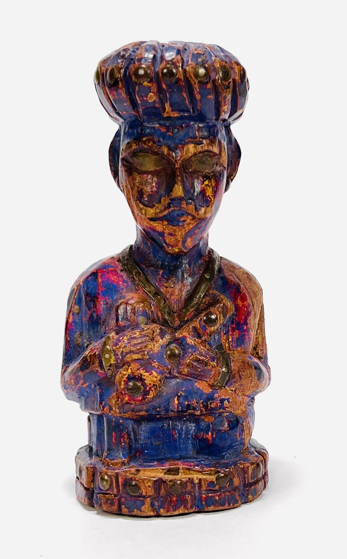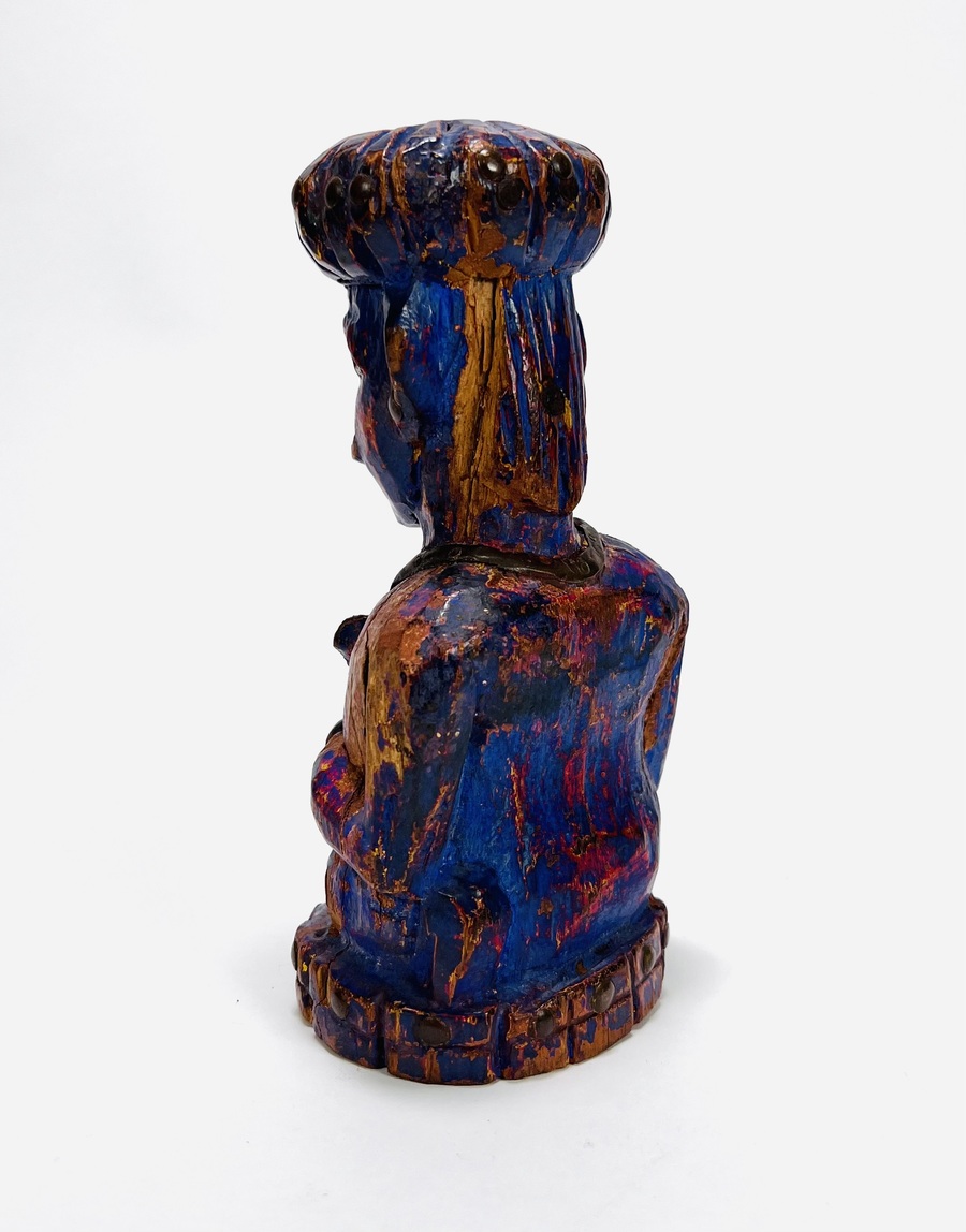 Gestoken houten paars gepatineerd beeld van een oriëntaalse man. Beeld heeft koperen toevoegingen qua ogen, sieraden en overige details. 20e eeuw. |