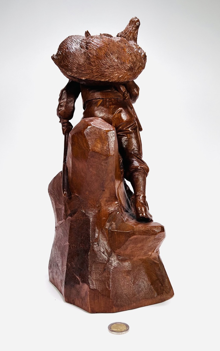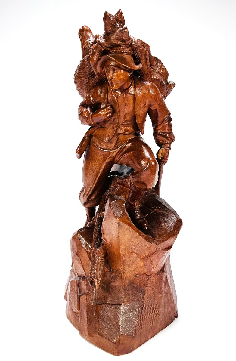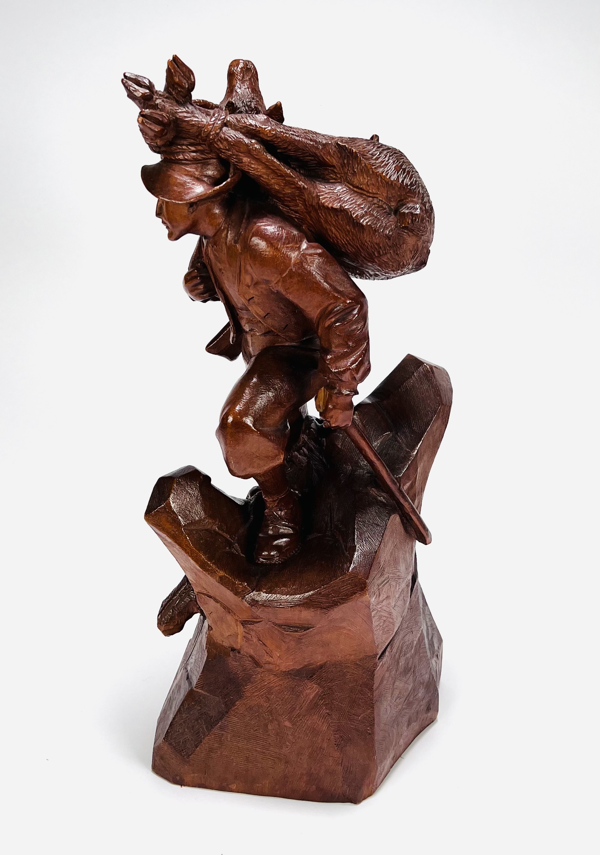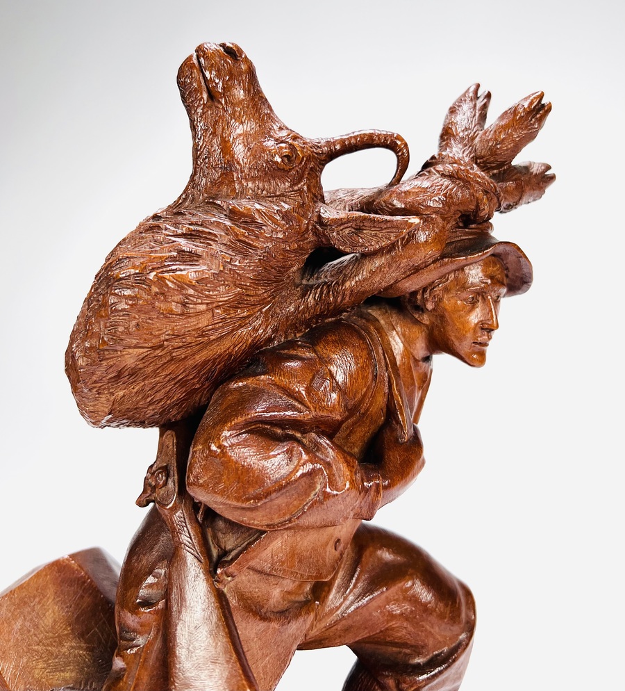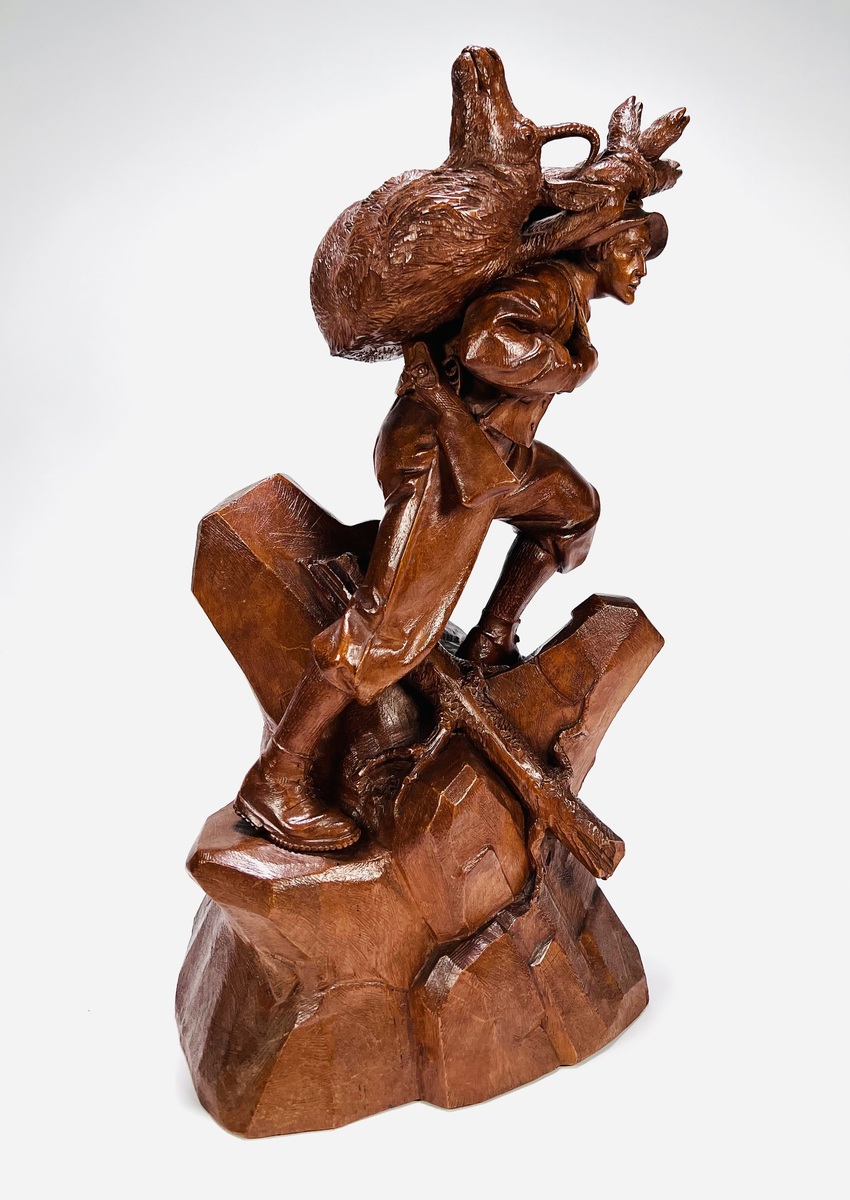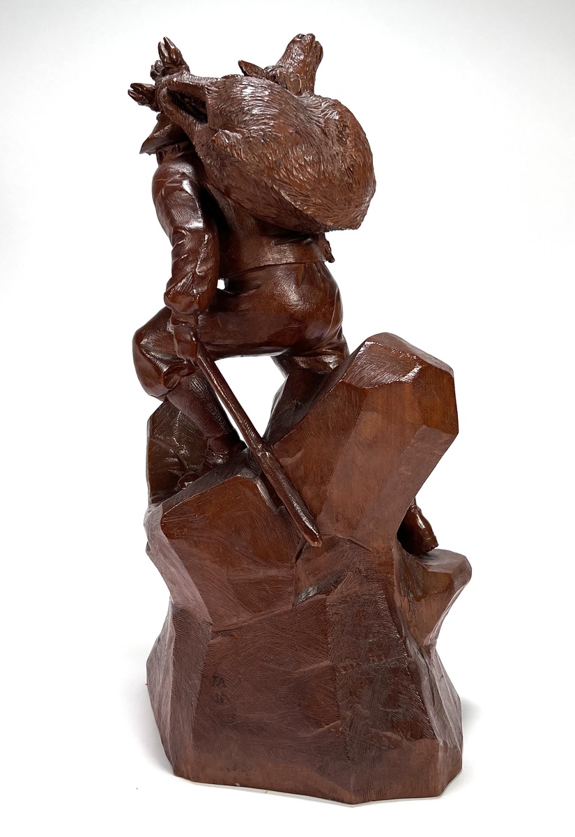 Houtgestoken Schwarzwald beeld van een jager met gems op de rug. Aan de achterzijde gemonogrammeerd en vermelding 80. Duitsland, 20e eeuw. |