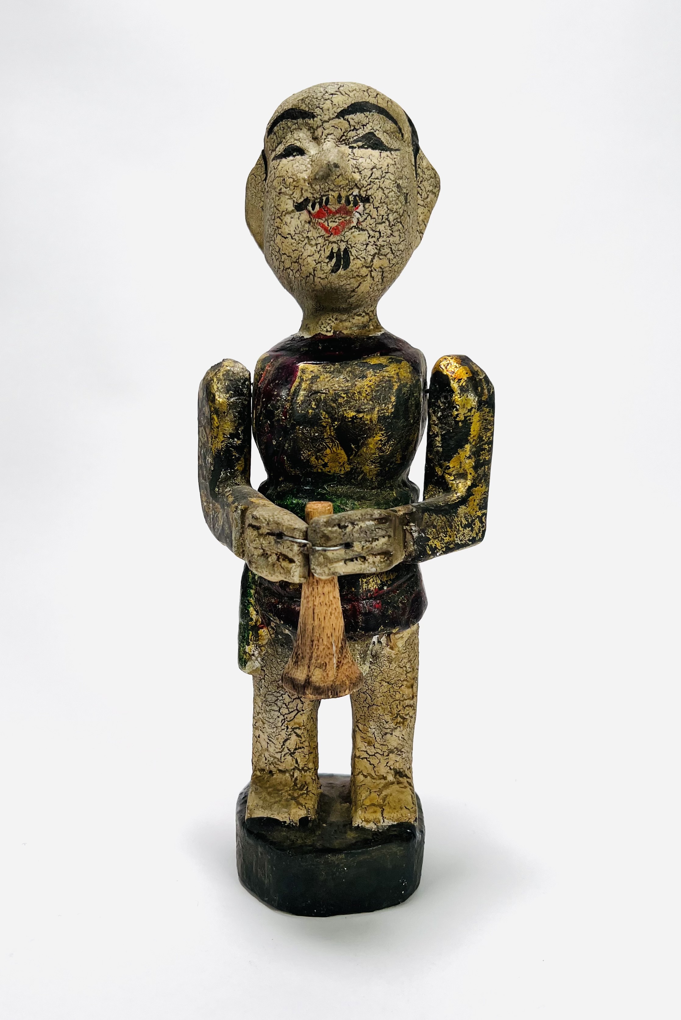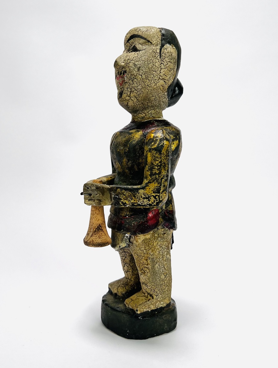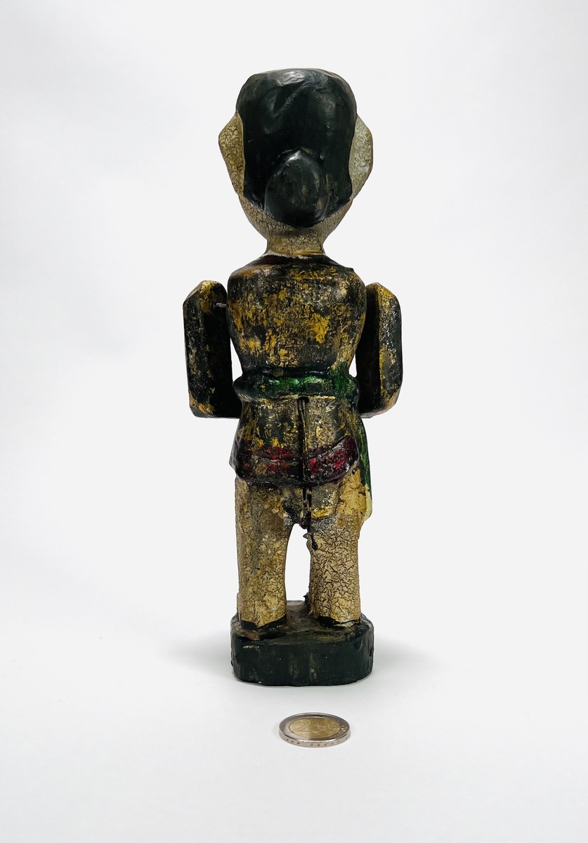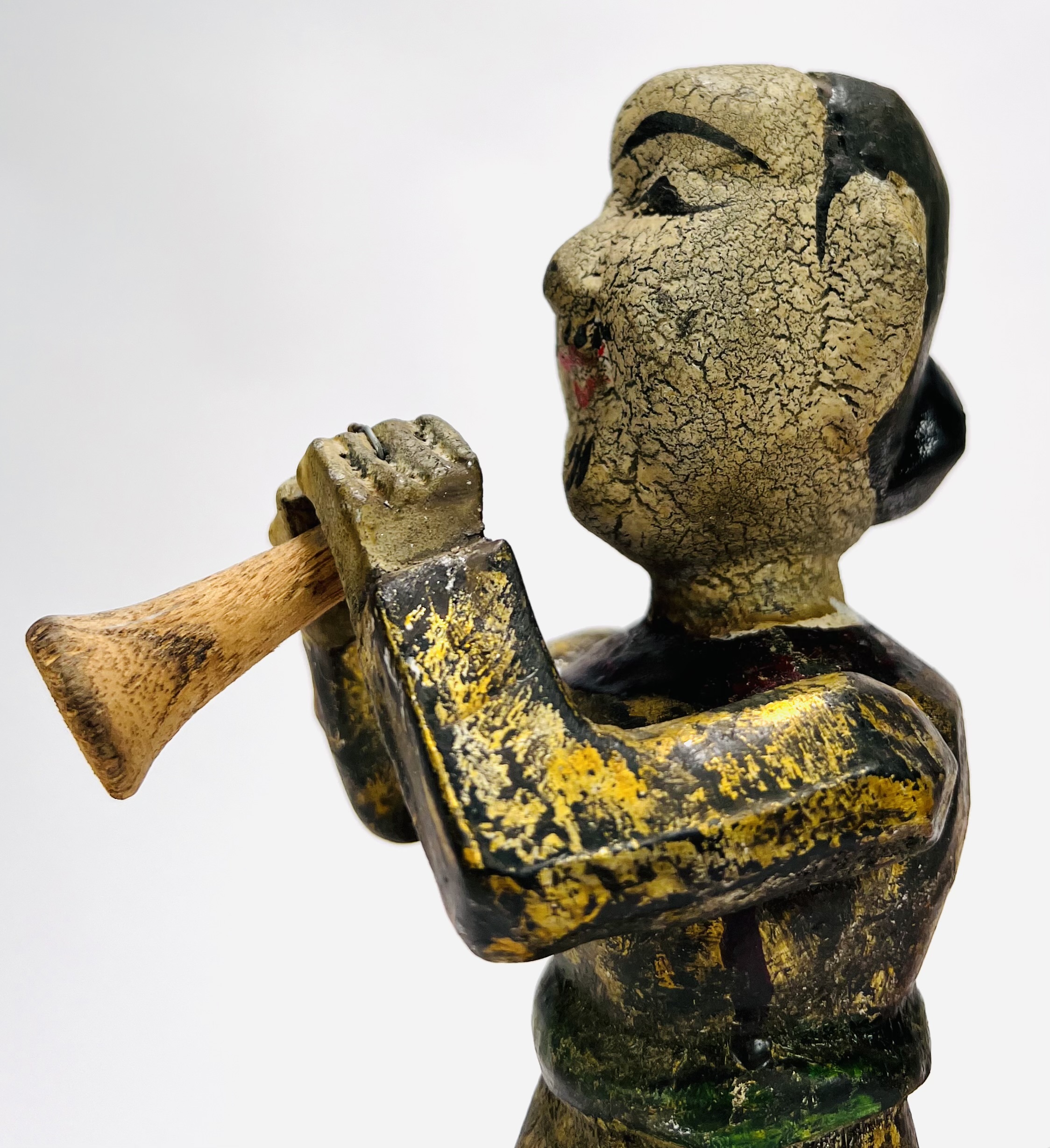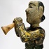 Houten polychroom beschilderde beeld van een trompettist, achterzijde koordje waarmee armen en trompet bewogen kunnen worden. Eerste helft 20e eeuw. |