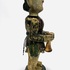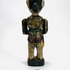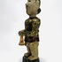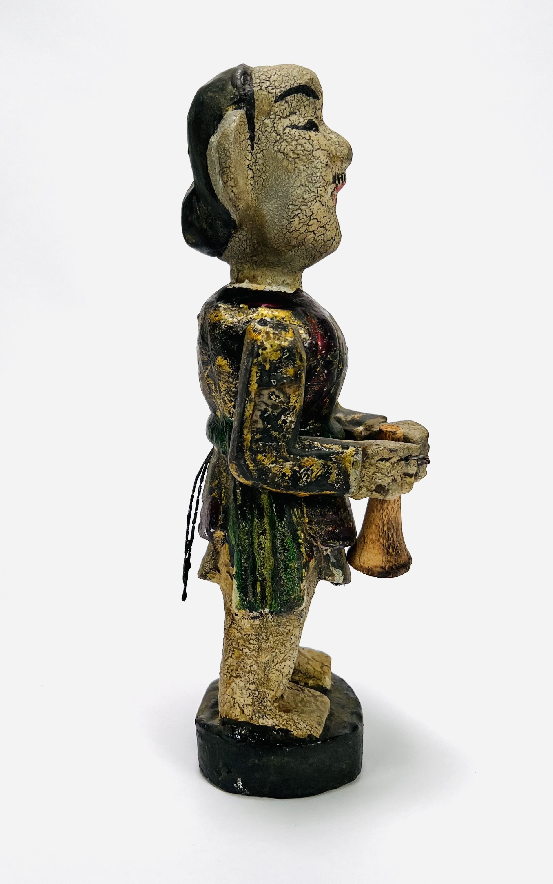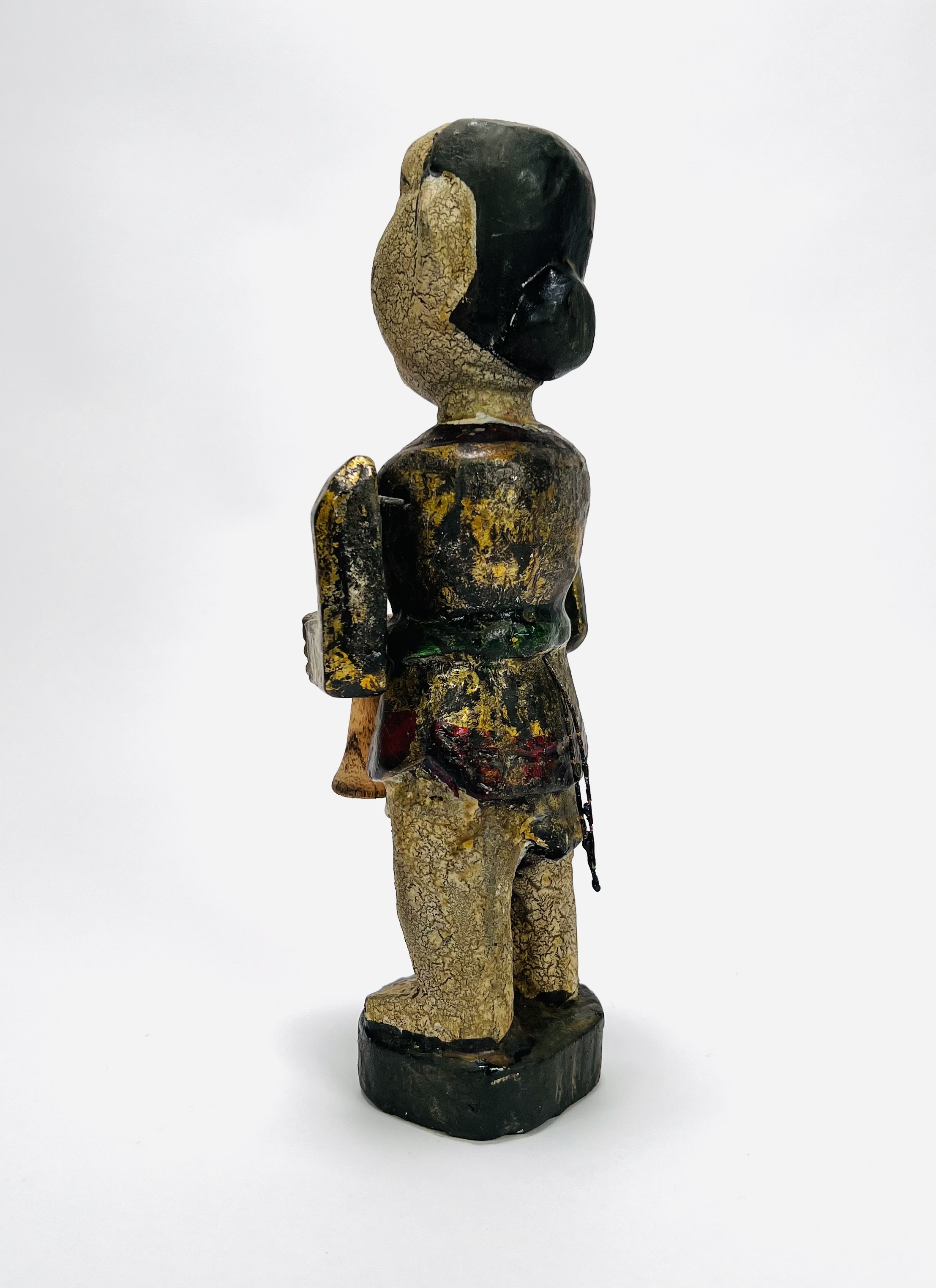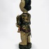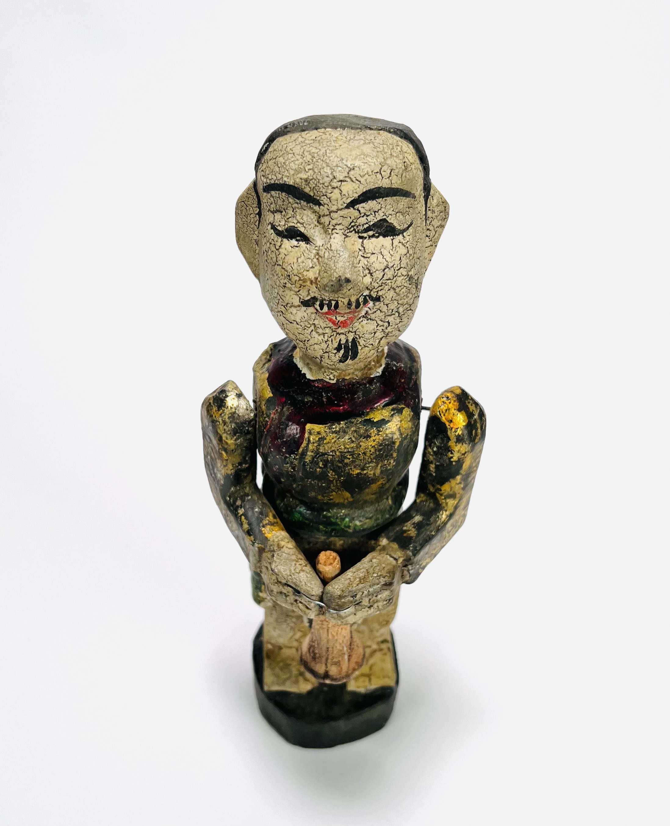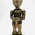 Houten polychroom beschilderde beeld van een trompettist, achterzijde koordje waarmee armen en trompet bewogen kunnen worden. Eerste helft 20e eeuw. |