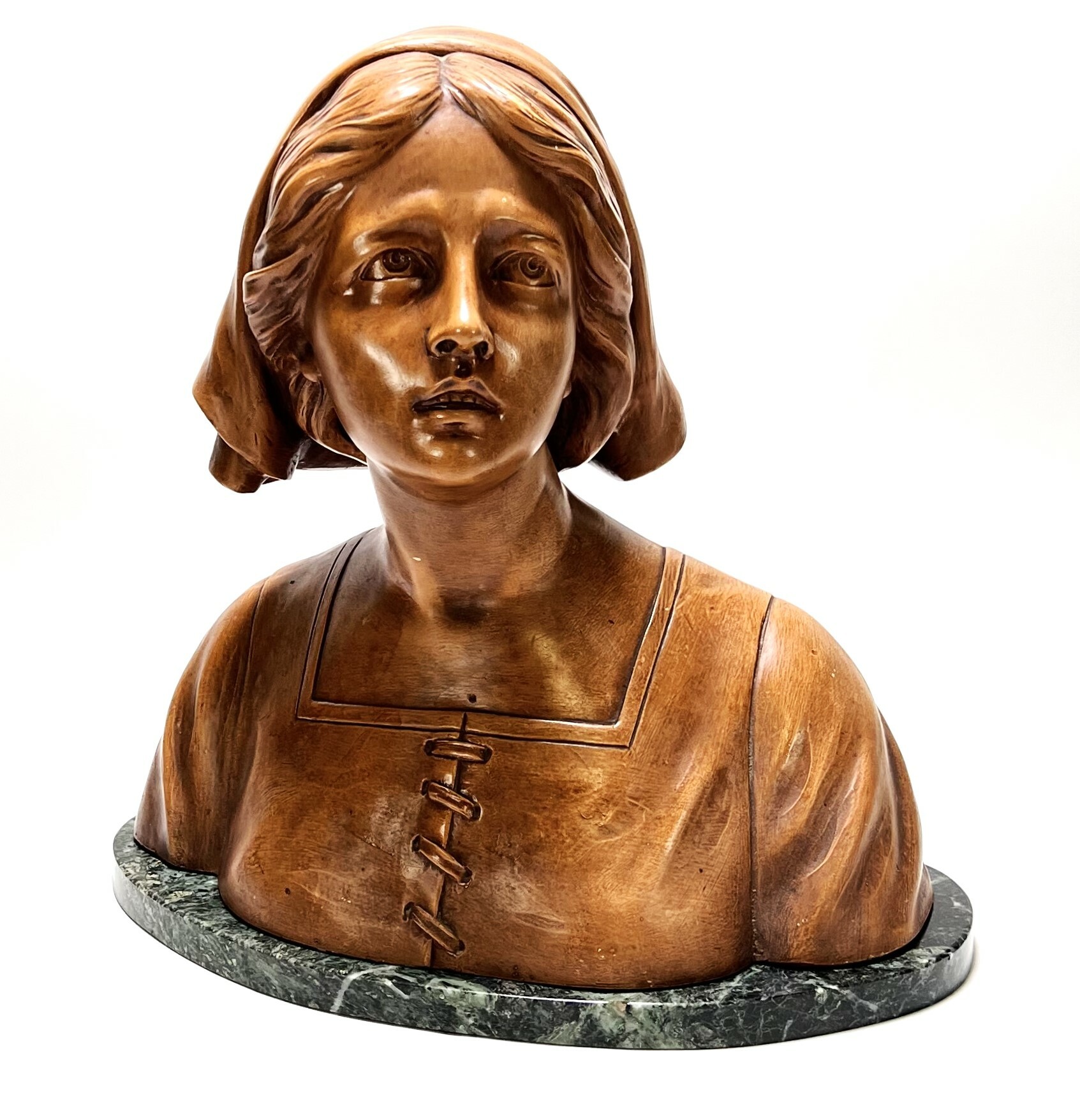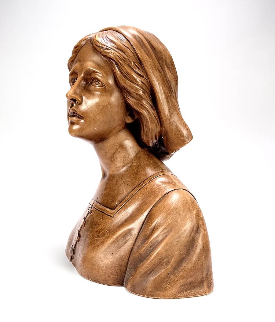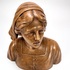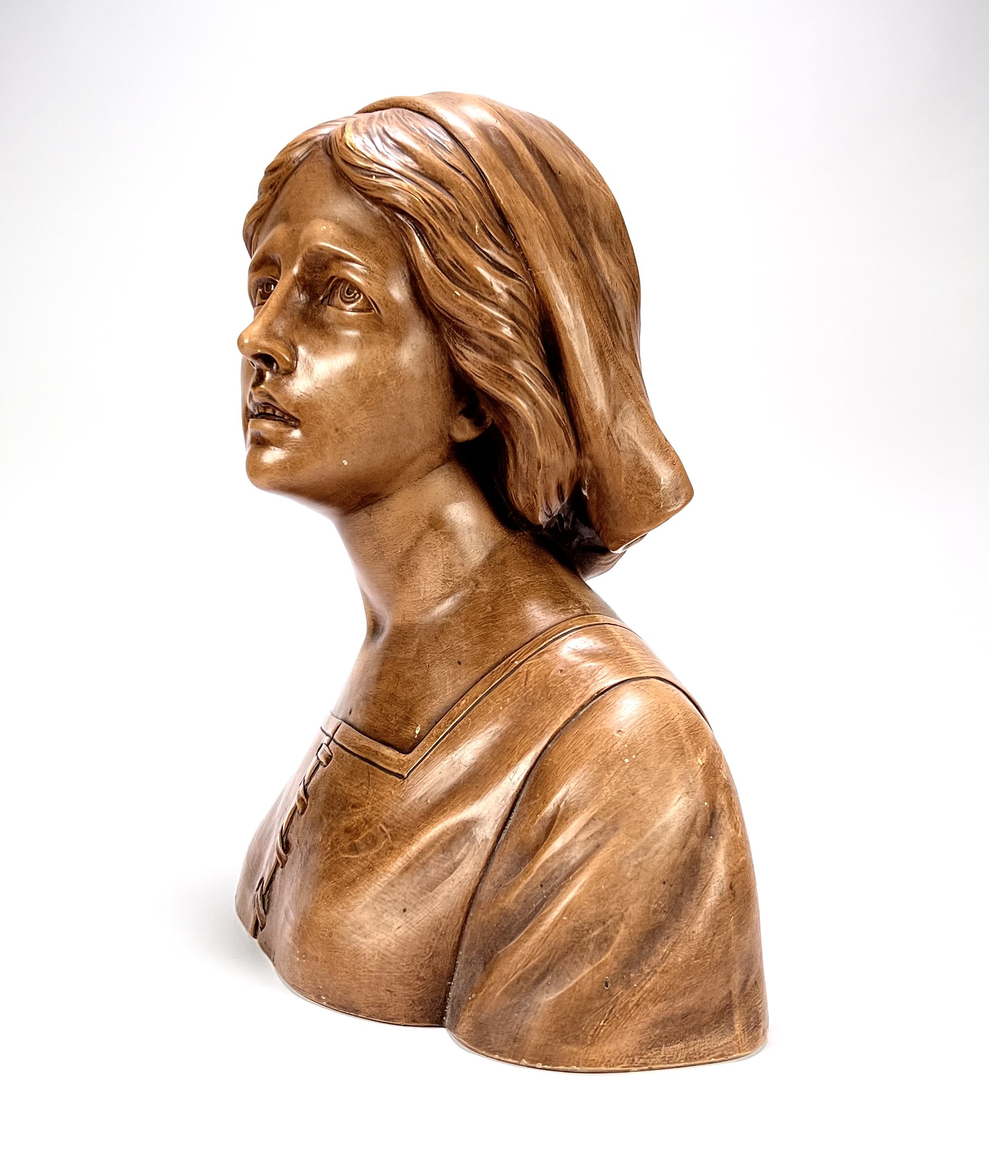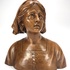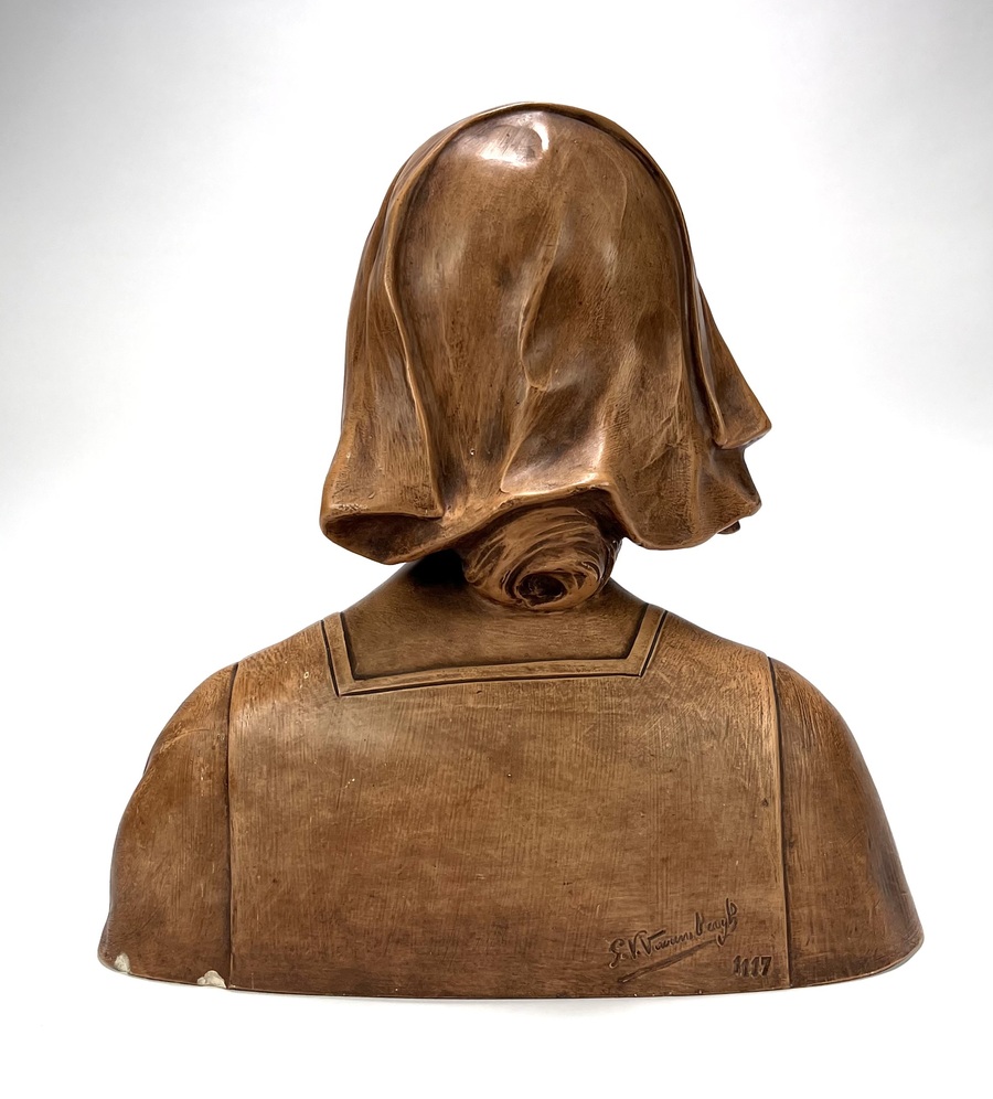 Keramieken bruin gepatineerd Art Nouveau buste van jonge vrouw in devotie op een marmeren basement, door Gustave van Vaerenbergh (1873-1927). Aan de achterzijde gesigneerd met vermelding van modelnummer 1117. België, begin 1900. |
